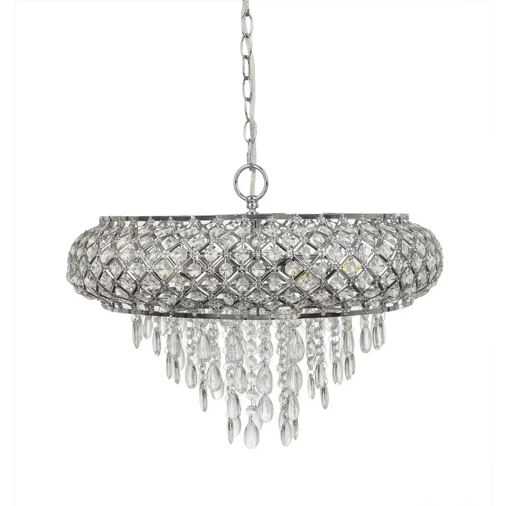 Take your lighting up several notches with the Clear and Chrome Tiered Crystal Glass Plug-in and Hardwire Hanging Chandelier from River of Goods. This beautiful chandelier has a striking throwback look, with an antique-finished chrome base covered with glass jewels and dangling with strands of more glass jewels for a piece reminiscent of the early 20th century — perfect for setting up in an antique-inspired room. The glass detailing reflects and refracts light, creating a dazzling display on the wall that's equally as eye-catching as the chandelier itself. In addition to its gorgeous look, you'll love the easy function of this hanging ceiling light. Simply use the included hooks and wall mount — on or your or with a professional installer — to adjust and hold the hanging chain as desired, then plug into an outlet for easy on.