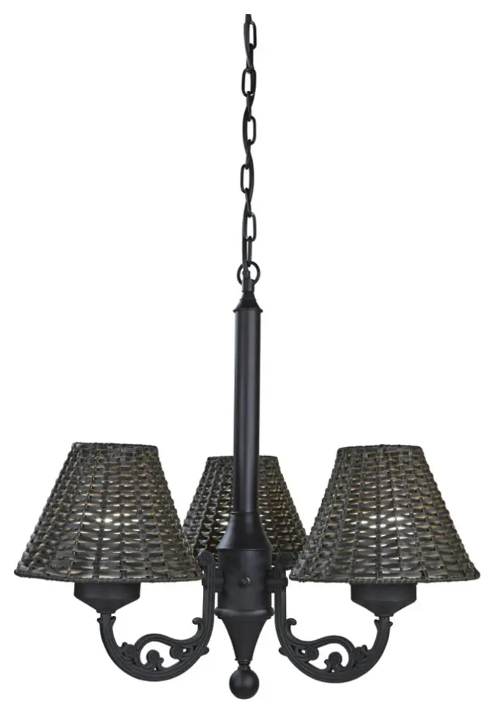 Patio Living Concepts 19-750 Versailles Chandelier 19750 with Black Body and Stone Wicker Shades. Add European Elegance to your outdoor living area with this Versailles chandelier lamp. Powder coated black finish on cast aluminum body. Highlighted by 3 all weather wicker shade covers. Two level dimming switch and 20 ft. weatherproof cord and plug. Acrylic waterproof light bulb enclosures allow the use of standard 60 watt bulbs or comparable LED or CFL bulbs. Dimension: 28Lx28Wx25H in.