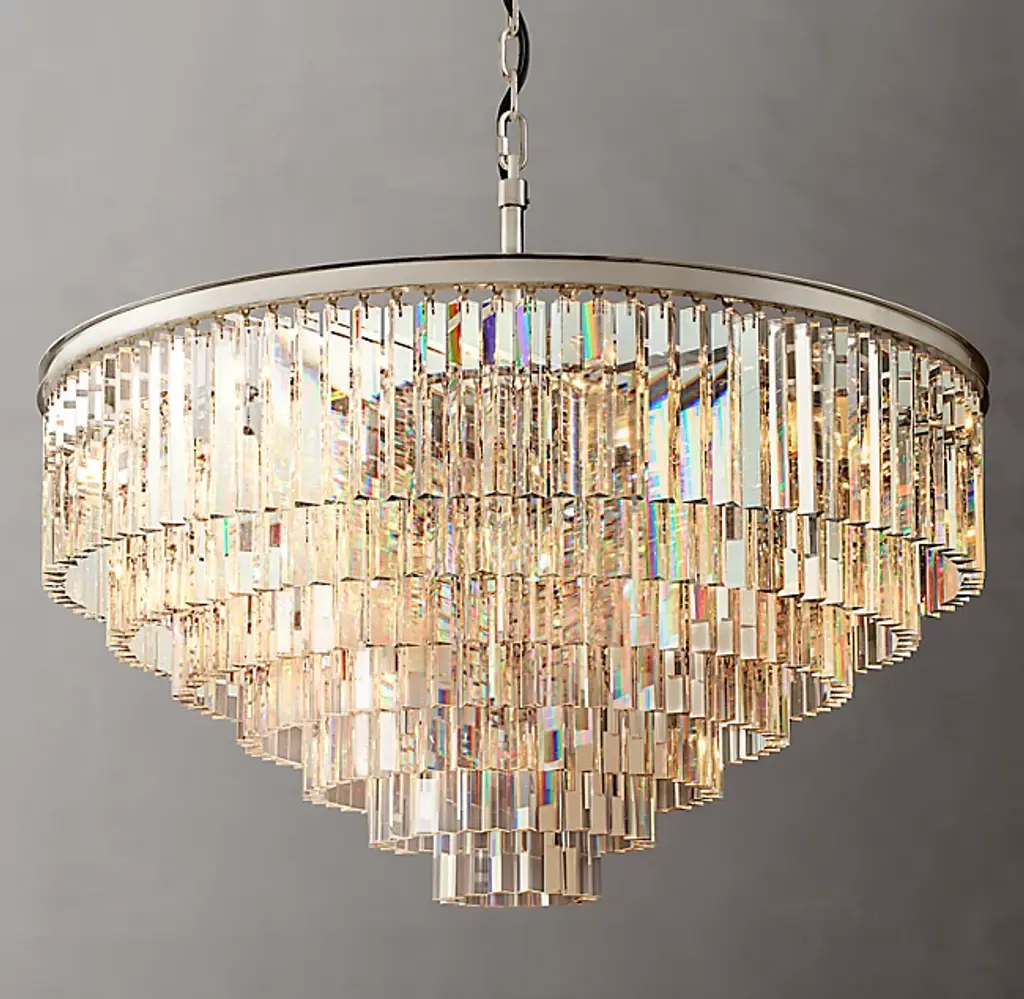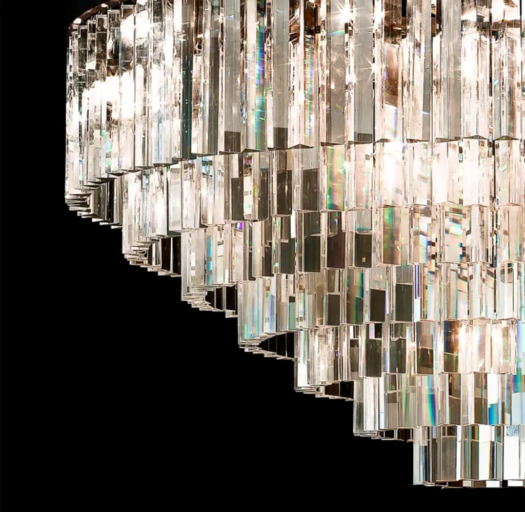 Inspired by the Art Deco style of 1920s Paris, our collection from Timothy Oulton captures the period's fascination with geometric forms. Masterfully refracting the light, hundreds of faceted, dynamic prisms evoke the allure of the era. Hanging like lush fringe from a welded iron frame, the angular glass juxtaposes elegance and industrialism.SHOP THE ENTIRE COLLECTION