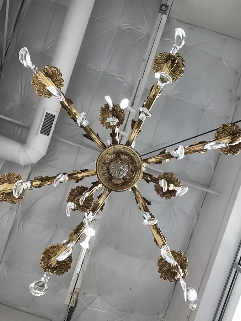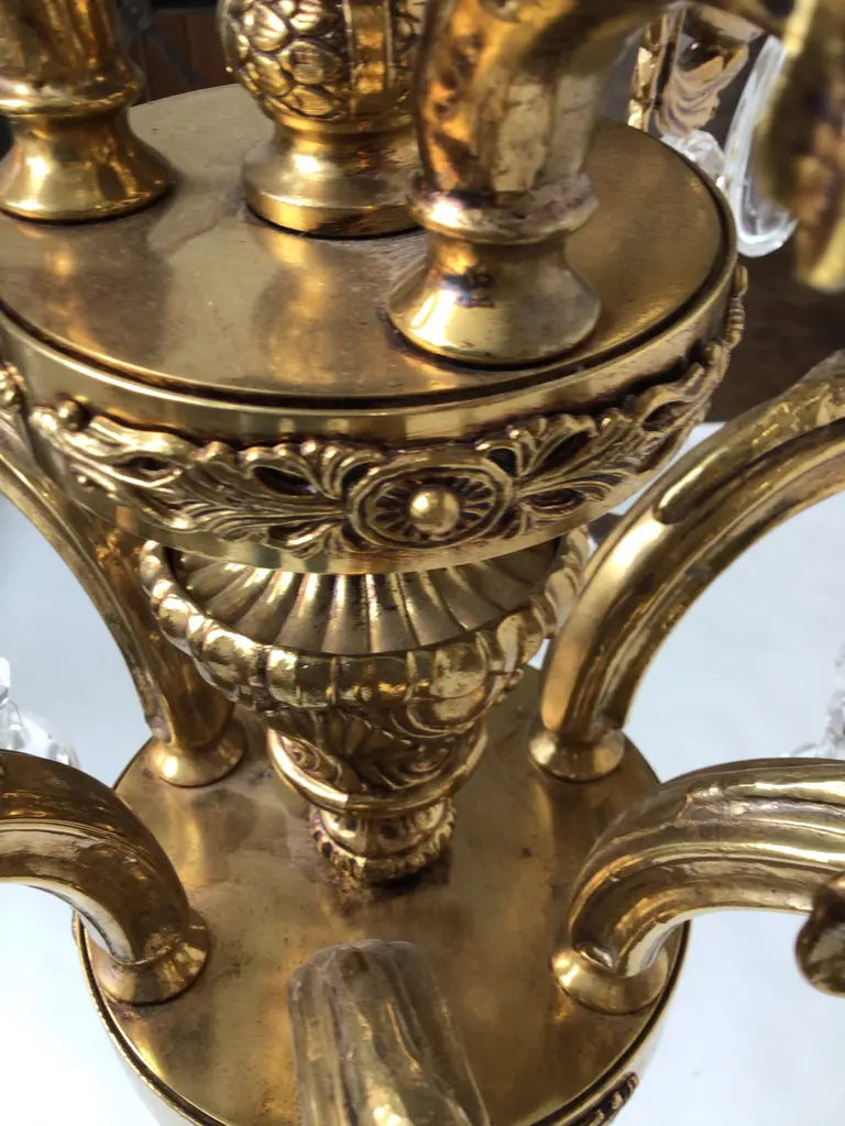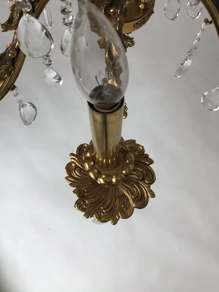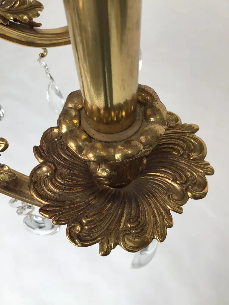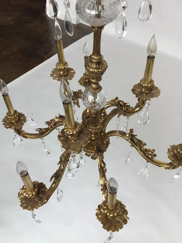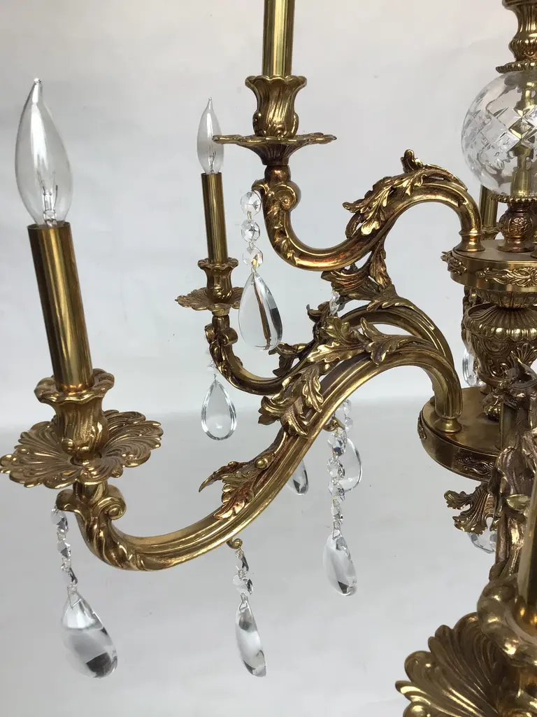 Gorgeous nine light Baroque style chandelier with two tiers in an antique brass finish featuring a center crystal ball with crystal drops. Created in Italy.