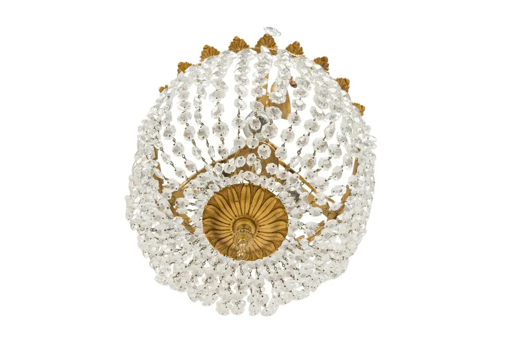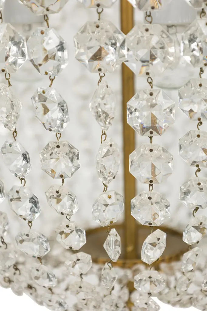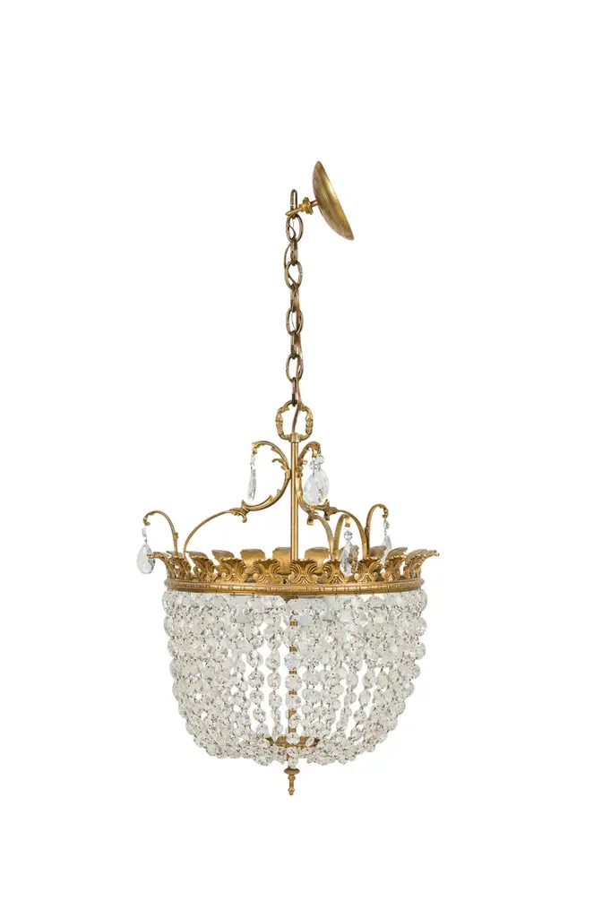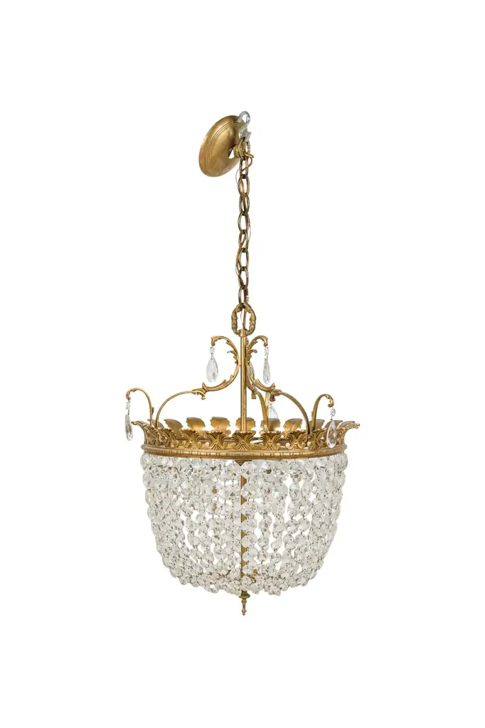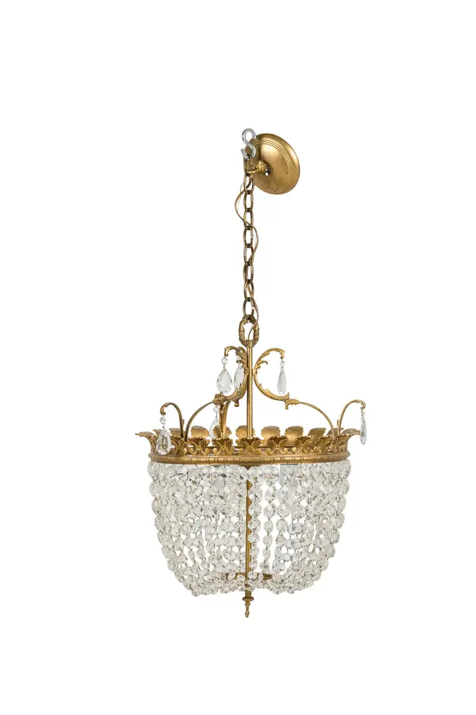 2 French Mid-Century chandeliers with a round brass top supporting multiple crystals strands coming together at a bottom finial (PRICED EACH)