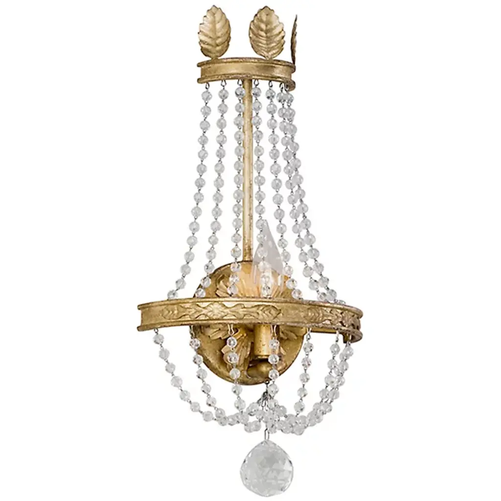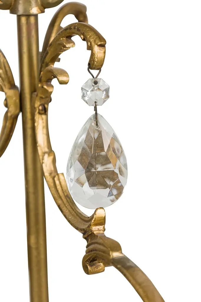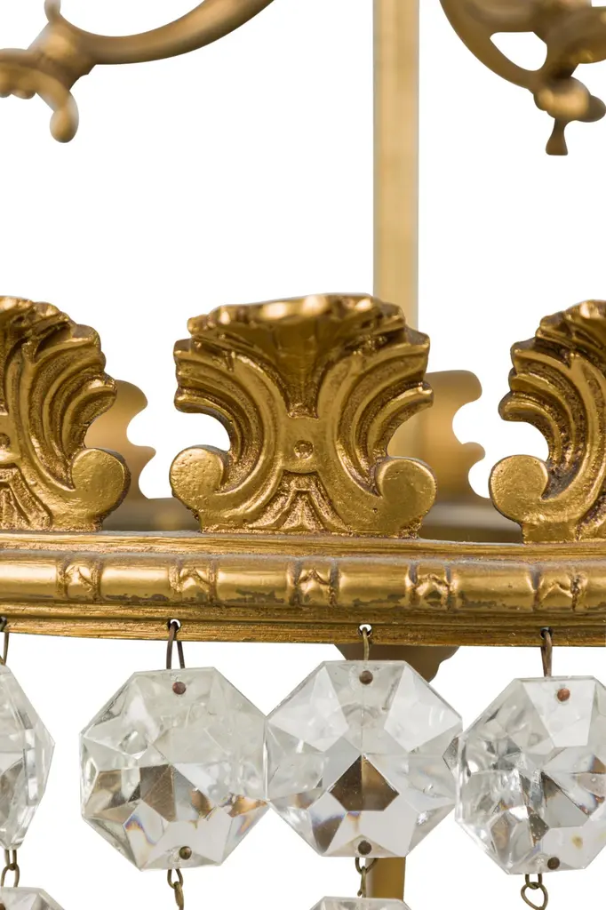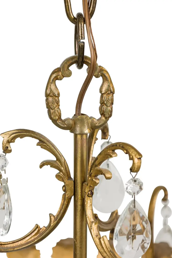 2 French Mid-Century chandeliers with a round brass top supporting multiple crystals strands coming together at a bottom finial (PRICED EACH)