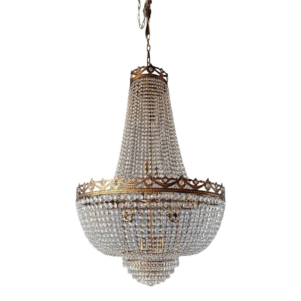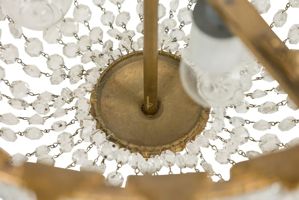 2 French Mid-Century Chandeliers With A Round Brass Top Supporting Multiple Crys