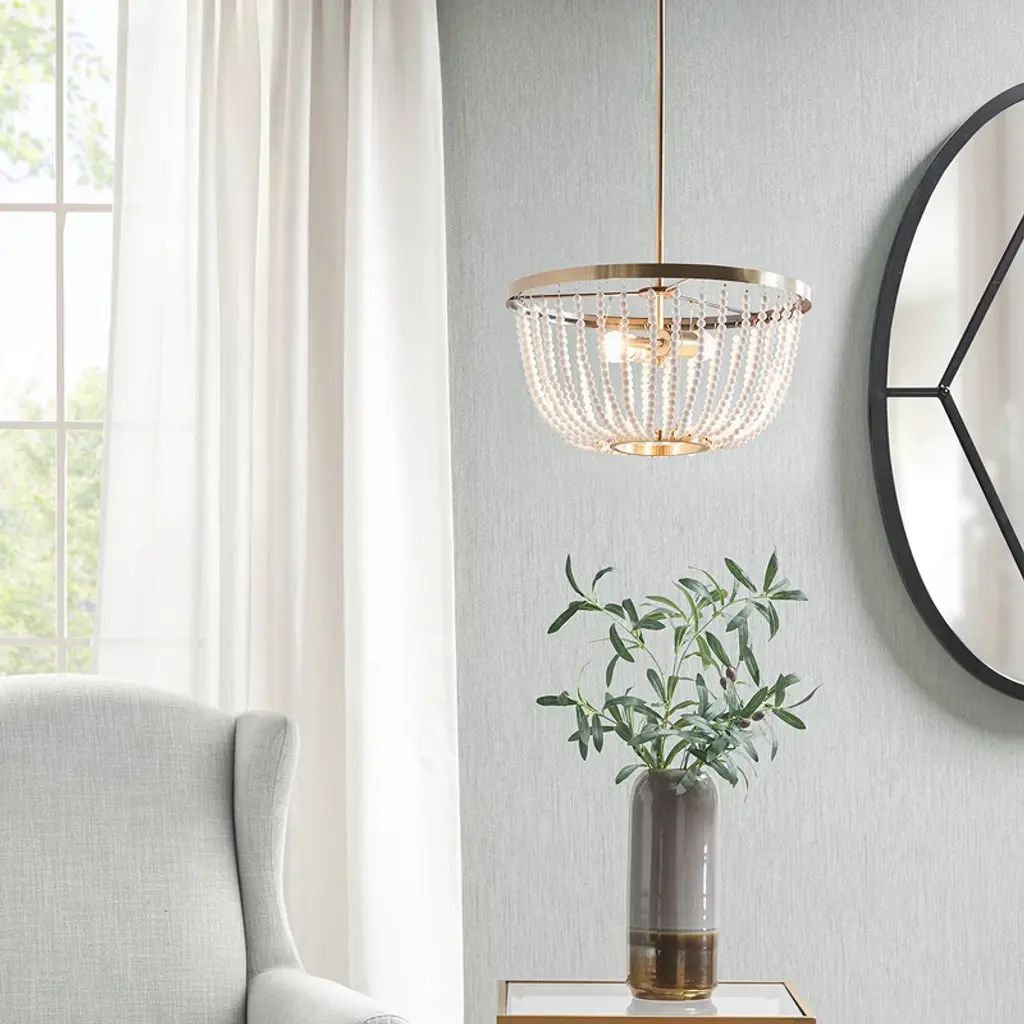 Description The Hampton Hill Melrose 2-Light Beaded Chandelier offers a beautiful combination of modernity and elegance to elevate your decor. This chandelier features an antique brass finish metal frame with white bead detailing accenting the dish-shaped shade. The 2 multidirectional light bulb sockets in the center of the chandelier provide plenty of light to illuminate your dining room or kitchen space. 2 Type A bulbs are needed (not included). Product Details See below 1 Chandelier:17inDia x 17inH to 53inH Body Size:17inDia x 10inH Socket Size:1.5inDia x 2.5inH Cord Length:42.25in Canopy Pendants:4.72inDia x 1inH Material 65% iron, 35% acrylic beads