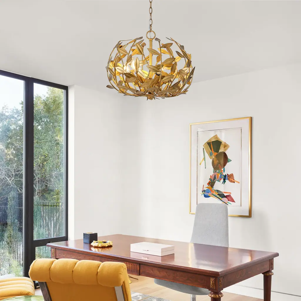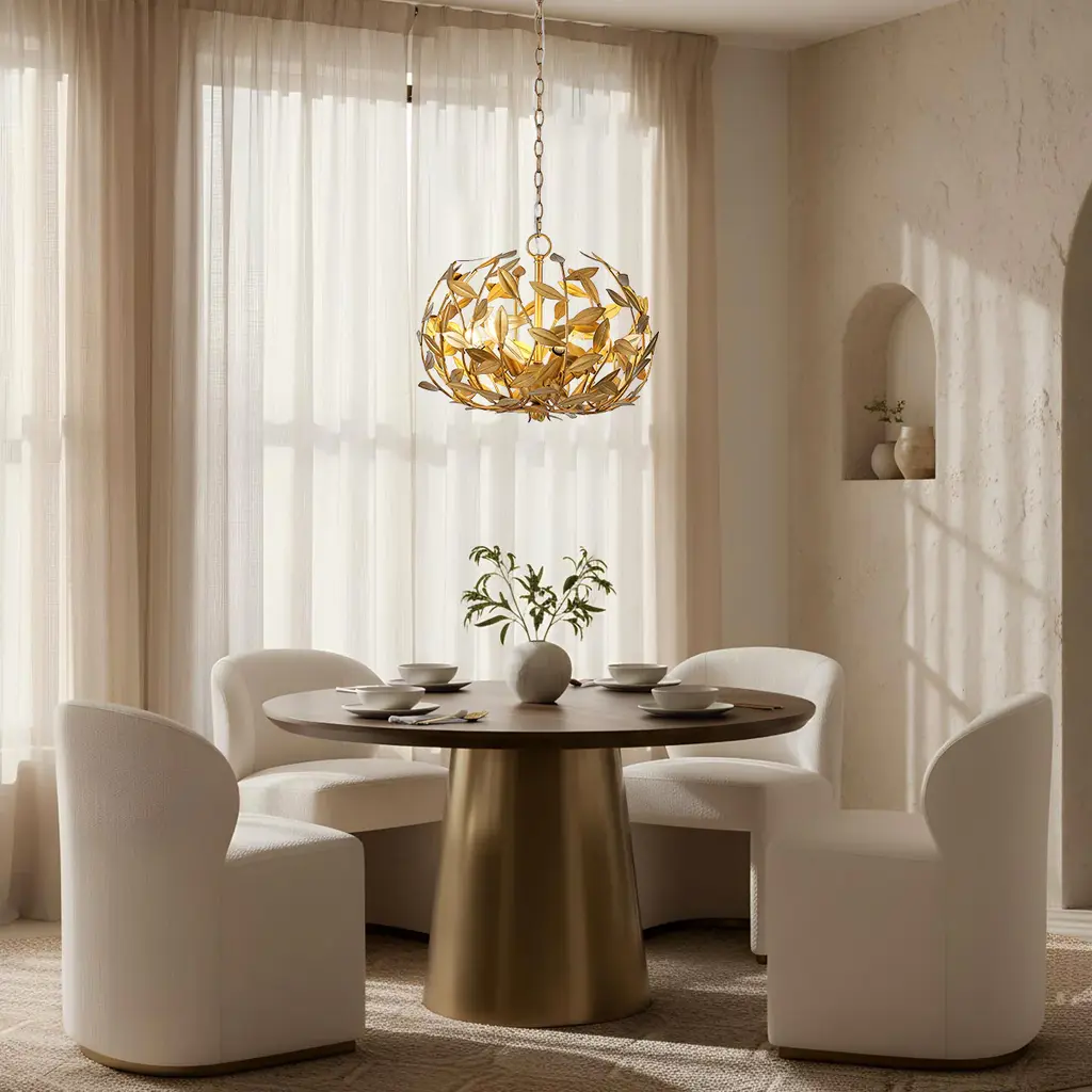 Elevate your interior with this modern golden chandelier, featuring an artistic spherical design crafted from leaf-inspired ironwork.【Modern Artistic Design】: This chandelier features a striking spherical silhouette crafted from multiple leaf-shaped iron pieces, all finished in a luxurious warm gold for a standout modern aesthetic and durable quality.【Complete Lighting Solution】: Ideal for entryways, dining rooms, or living rooms, it accommodates six E12 bulbs (40W max each) to provide brilliant, widespread illumination, and comes with all parts for easy installation.【Substantial & Ready-to-Install】: Designed with a substantial presence and including a generous 39.4" hanging chain, it arrives with all necessary hardware and a manual for a straightforward setup.