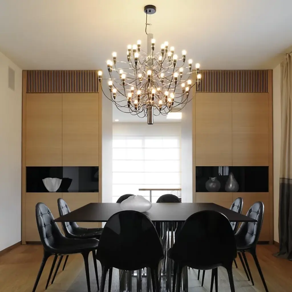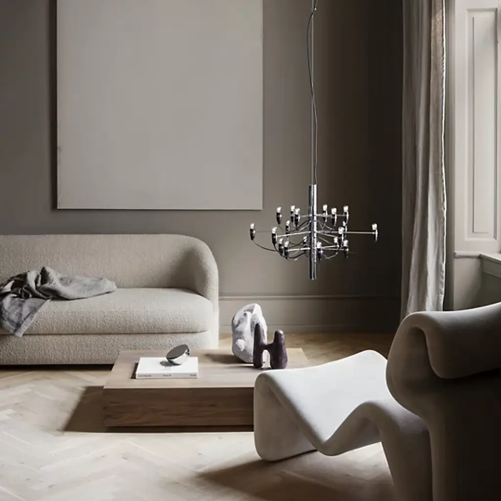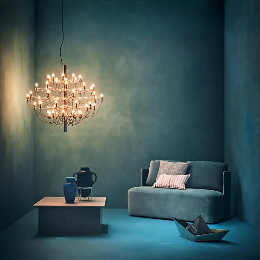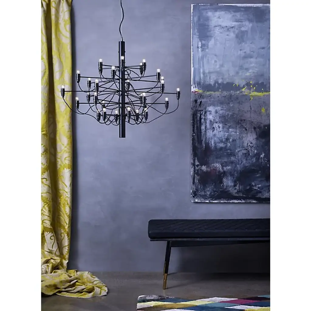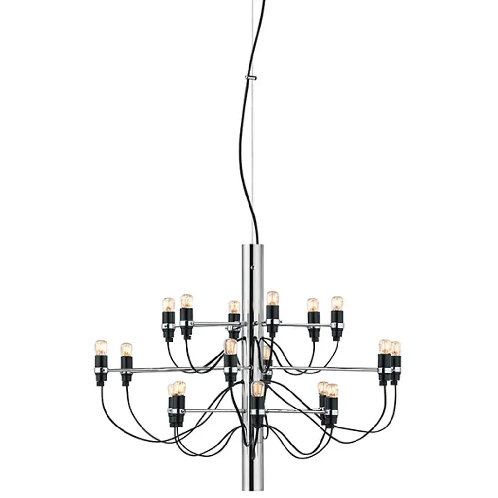 The 2097 Chandelier from FLOS is an influential design representing the sophisticated and forward-thinking character of trailblazing Gino Sarfatti's life's work. The piece lures the eyes with laser focus along a column-shaped metal body. The organic flowing contours of its powered cables create a functional callback to the curves of the traditional chandelier. Compact lamp holders in a modern form perch from slender arms with charming bulbs as their head. The bulbs spring on to create an enveloping glow that silhouettes the scattering of sophisticated lines.