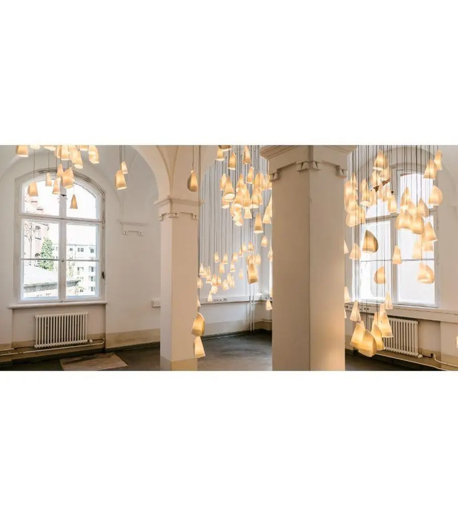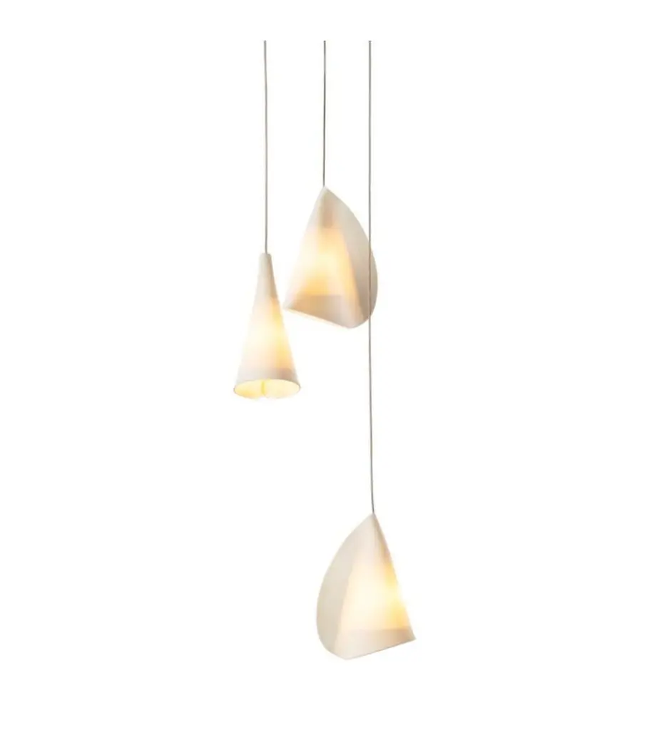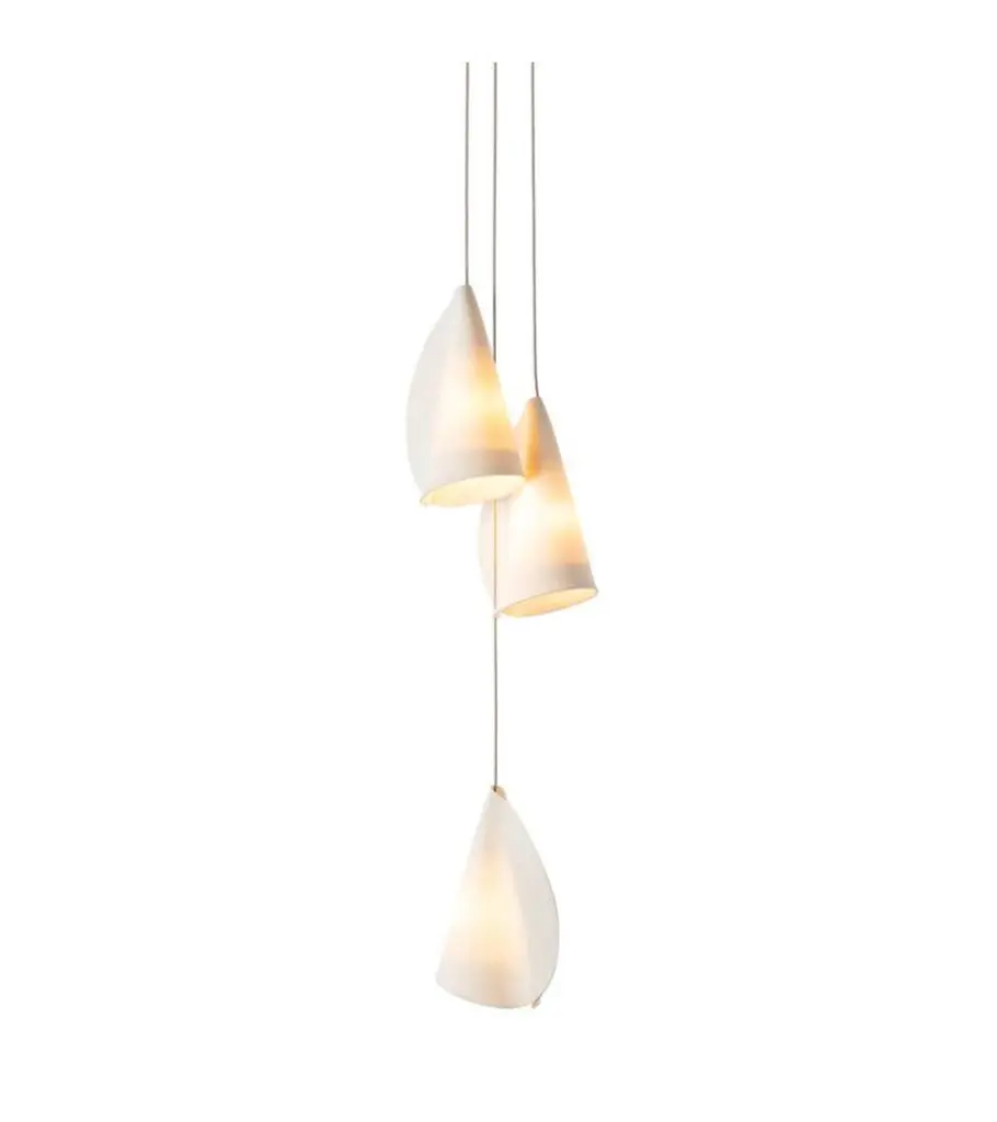 21.3 Porcelain chandelier lamp by BocciDimensions: diameter 15.2 x height 300 cm Materials: porcelain, borosilicate glass, braided metal coaxial cable, electrical components, brushed nickel canopy. Lamping: 1.5w LED or 20w xenon. Nondimmable. Available with 350 cm height. Also available in different sizes.All our lamps can be wired according to each country. If sold to the USA it will be wired for the USA for instance.21.3 is a random confi guration of three 21 pendants hung from a roundcanopy. The pendants are designed to hang in a random confi guration, theresult is an ambient installation or fi eld of light. The pendant drop lengths onthis light fi xture are adjustable up to the specified maximum.Inspired by the sporadic, discordant arrangement of barnacles on a rocksurface, the 21 is fabricated from thin sheets of porcelain wrapped around atrumpet-shaped borosilicate diffuser. Each diffuser houses a low voltage lamp.A strong contrast is established between the organically distributed soft lightpassing through the white porcelain skin and the sharp, crisp light passingthrough the borosilicate glass diffuserBocci is a design and manufacturing company based in Vancouver and Berlin. Founded in 2005 under the creative directorship of Omer Arbel, Bocci is committed to fostering a lateral and open-ended relationship between creative direction and craft. The company launched with one lighting design, ‘14’, which became an instant classic and remains a design staple and bestseller. Bocci’s growing portfolio of sculptural lighting is developed, engineered, and fabricated in-house, through an infrastructure calibrated to provide full control over technique, quality, and scale.In 2015, Bocci transformed a historic Berlin building into a showroom and archive. ‘Bocci 79’ inhabited a 2,200 m² / 23,600 sq ft former courthouse, constructed in 1896, and showcased over a decade of works by Omer Arbel, ranging from pieces in progress, prototypes, and ideas, to the complete range of catalog pieces developed for Bocci.Bocci 79 closed in June 2020 and we are currently working on our new, permanent Berlin showroom which will open soon.