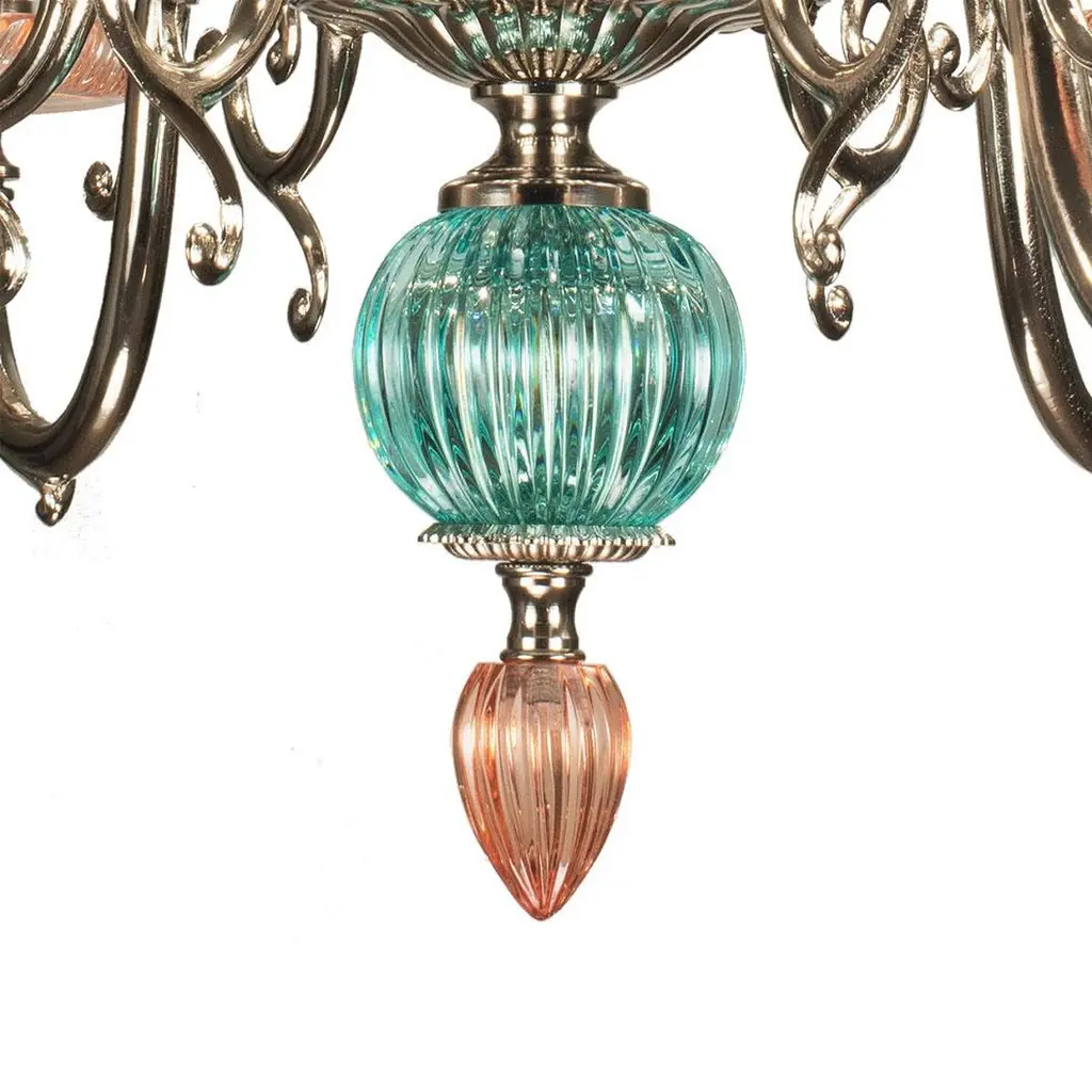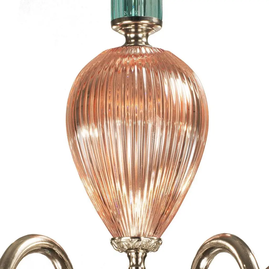 6-Lights chandelier in pink and green crystal and nickel bronze. The parts in crystal are hand-carved. Each object is handcrafted and the care for every detail makes each item unique in its kind. The style of this chandelier is a modern reinterpretation of chandelier from the second half of the 18th century in France. This items was made entirely in Italy. At the customer's request, this item can be customized, can be made in different metal finishing: french gold, patinated silver, burnished and dark burnished and the color of crystal.Also Oggetti d'Arte will follow with the same passion the request of the most qualified studies of interior architecture from around the world, helping them in achievement of their most ambitious projects.This chandelier needs 6 bulbs max 40 watts E14.