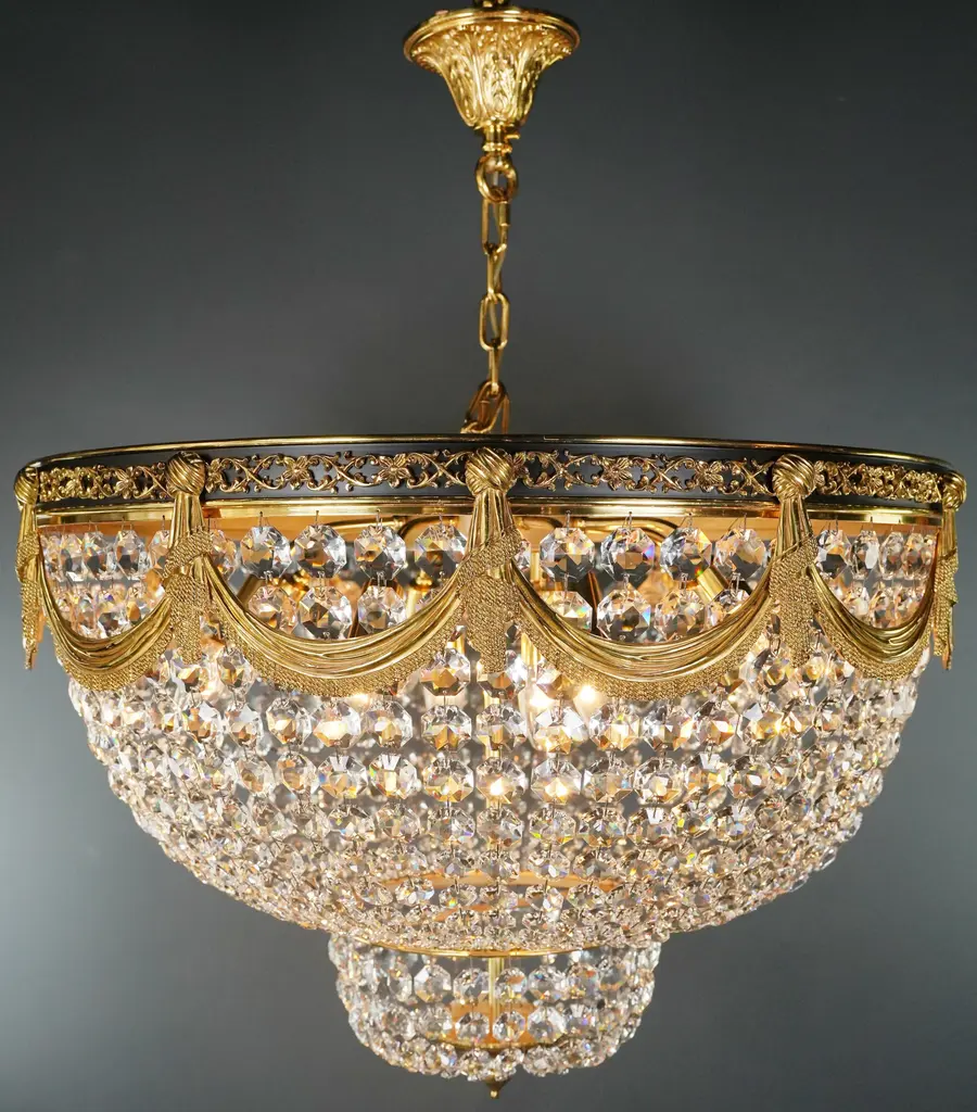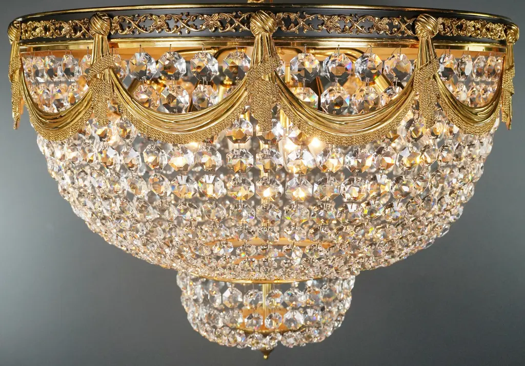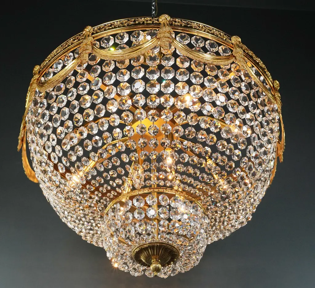 The brass Plafonnier chandelier is a testament to opulence and craftsmanship. We manufacture in-house and offer the flexibility of both smaller and larger sizes to ensure the perfect fit for your space. Key Features: - Dimensions: diameter 70 cm, height 50 cm - Space for 10 x E14 bulbs This chandelier embodies a sophisticated style, combining the appeal of Art Deco aesthetics with the grandeur of Empire design. It is made of high-quality lead crystal and exudes luxury and timeless beauty. Its dimensions with a diameter of 70 cm and a height of 50 cm ensure an impressive appearance that attracts attention and admiration. With 10 E14 bulb holders, it bathes your surroundings in a luminous light, creating an atmosphere that is both inviting and sophisticated. Whether for an intimate setting or a grand hall, this chandelier offers a touch of royal elegance that complements various spaces. Its exquisite construction and lead crystal elements convey a feeling of luxury and sophistication