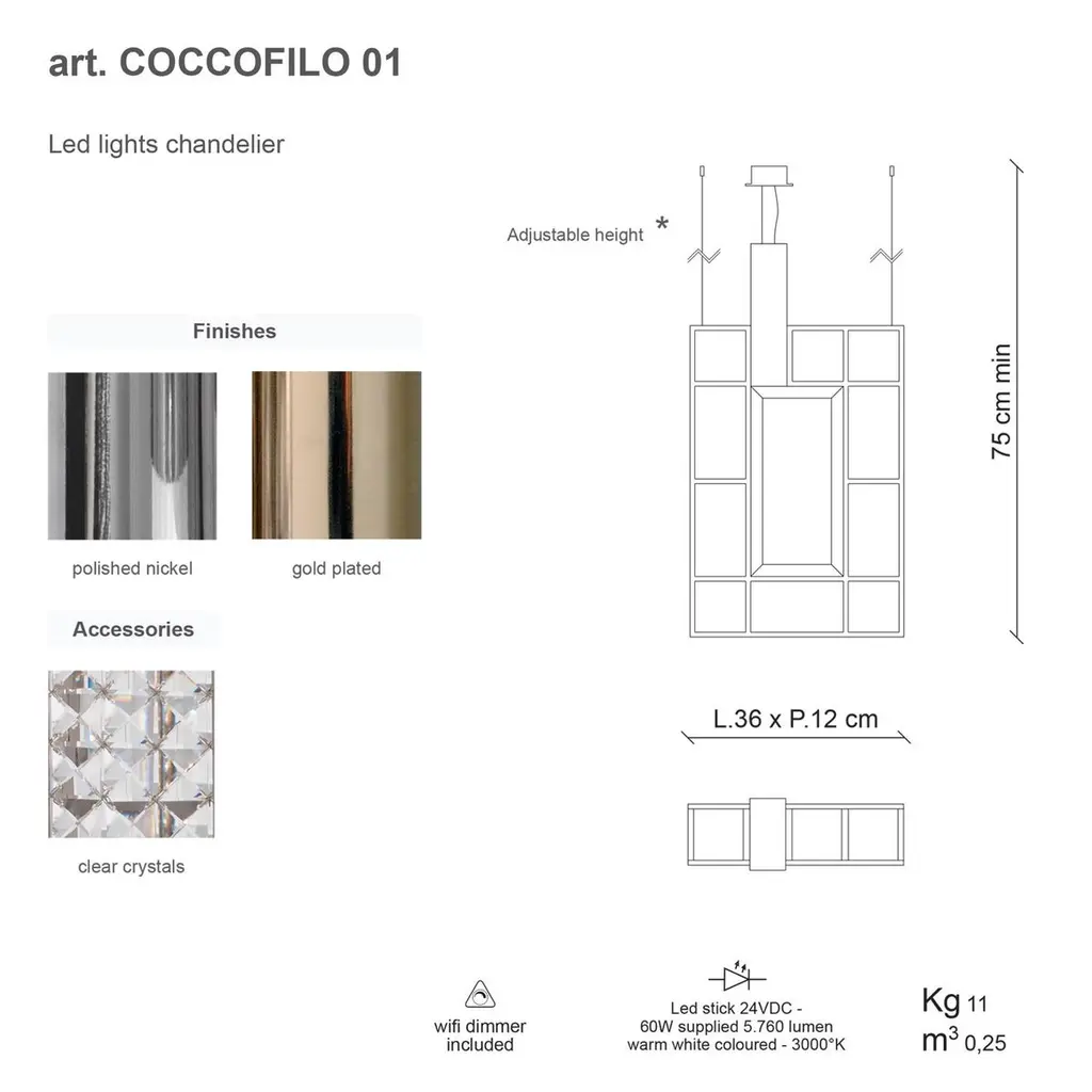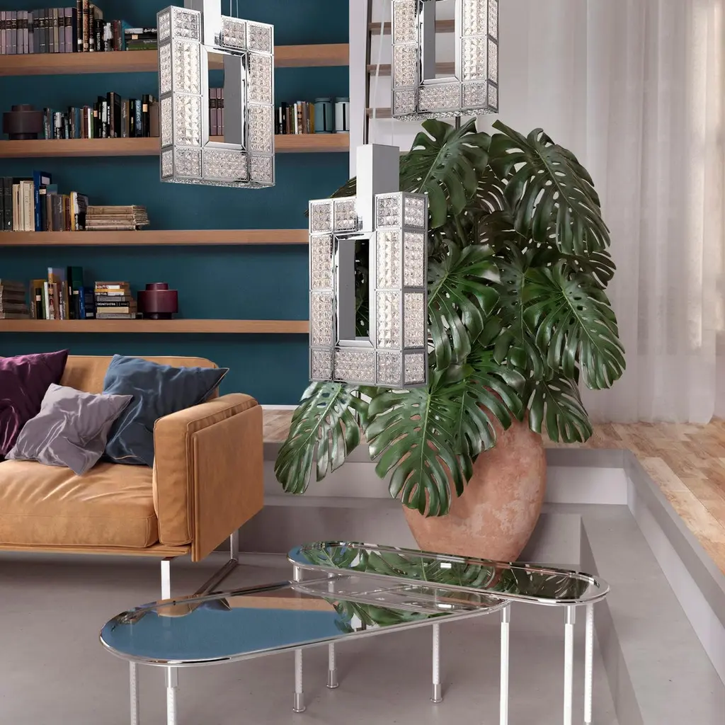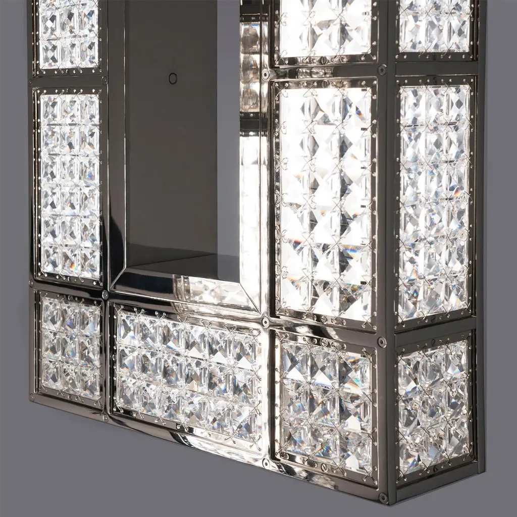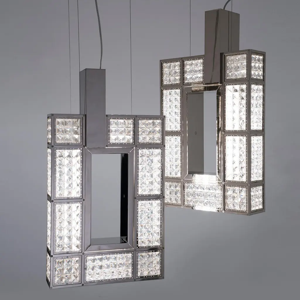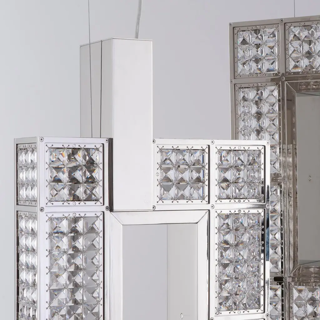 A sophisticated bright jewel, an unusual and unique interpretation of a chandelier.Simple lines and squared geometries covered by a crystal net. The result is a truly glittering piece.