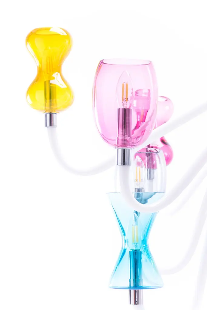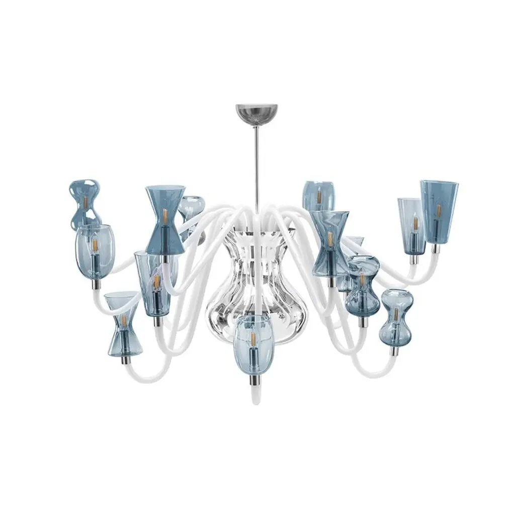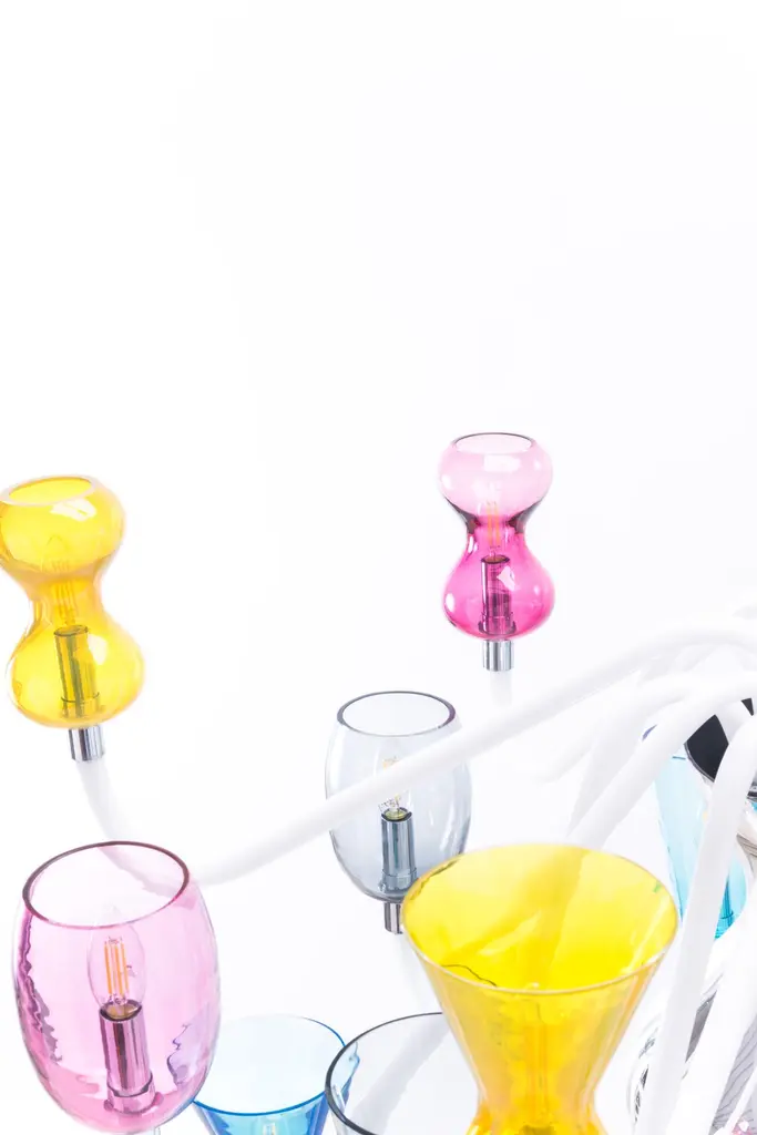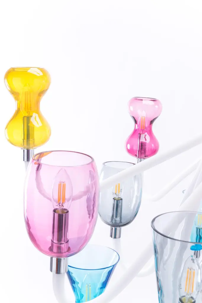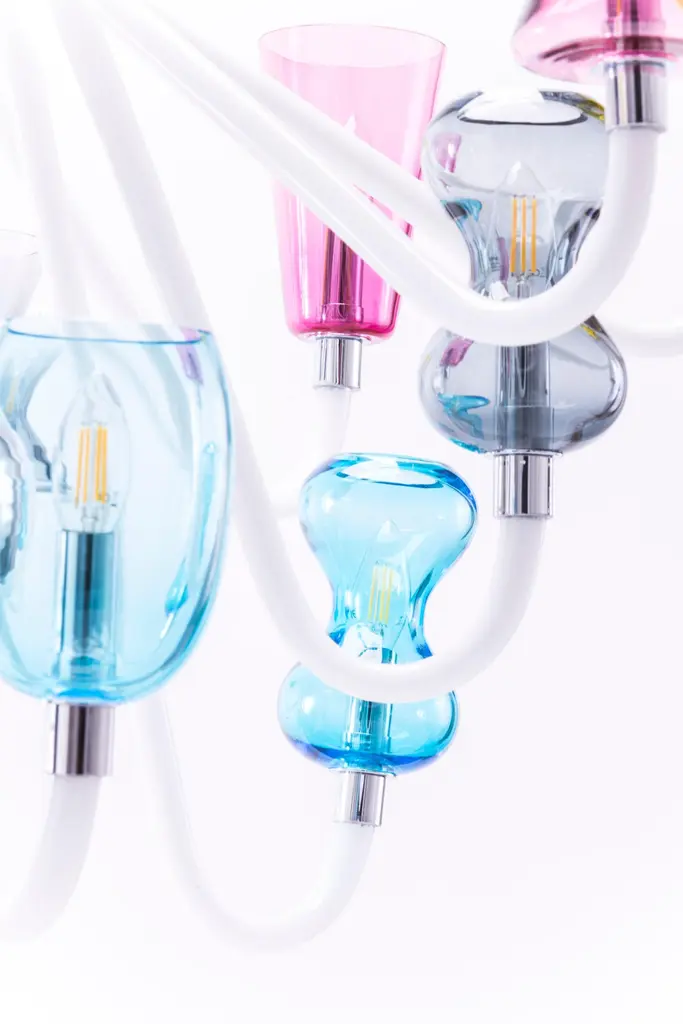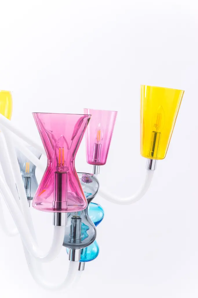 21st century Karim Rashid K1 chandelier 8-light Murano glass various colors.Karim Rashid reinterprets the traditional Venetian chandelier for Purho, transforming it into an ethereal luminous sculpture. Consisting of a central body in mirrored glass from which a series of slender transparent glass arms unfold, K1 is characterized by the unusual shapes of Murano blown glass cups, geometric and rounded, in a regular alternation. The glance is unprecedented, contemporary, decidedly harmonious thanks to the lightness of glass and the special color proposed in the catalogue. K1 is available in 8, 12 or 16 lights and can be customized in the 21 shades available in the color chart:Transparent blown glass01. ice crystal 02. milky white 03. honey 04. ruby Venice 05. amethyst pink 06. coffee 07. amber yellow 08. Capri yellow 09. mandarin orange 10. oriental red 11. green apple 12. Caribbean green 13. green lagoon 14. emerald green 15. blue Mediterranean 16. peacock blue 17. ocean blue 18. Florence purple 19. London grey 20. black gondolaSpecial processing techniques21. gold leaf.
