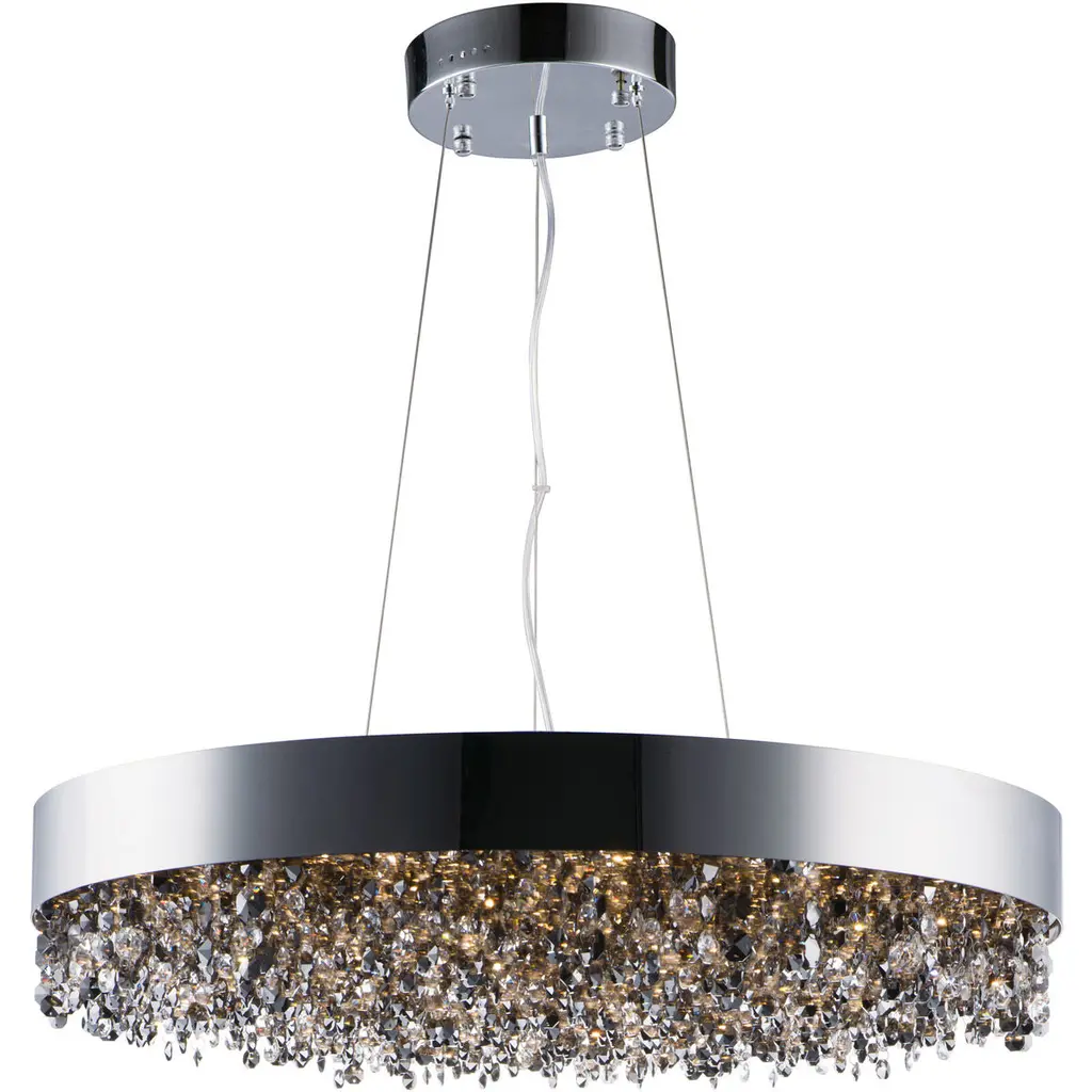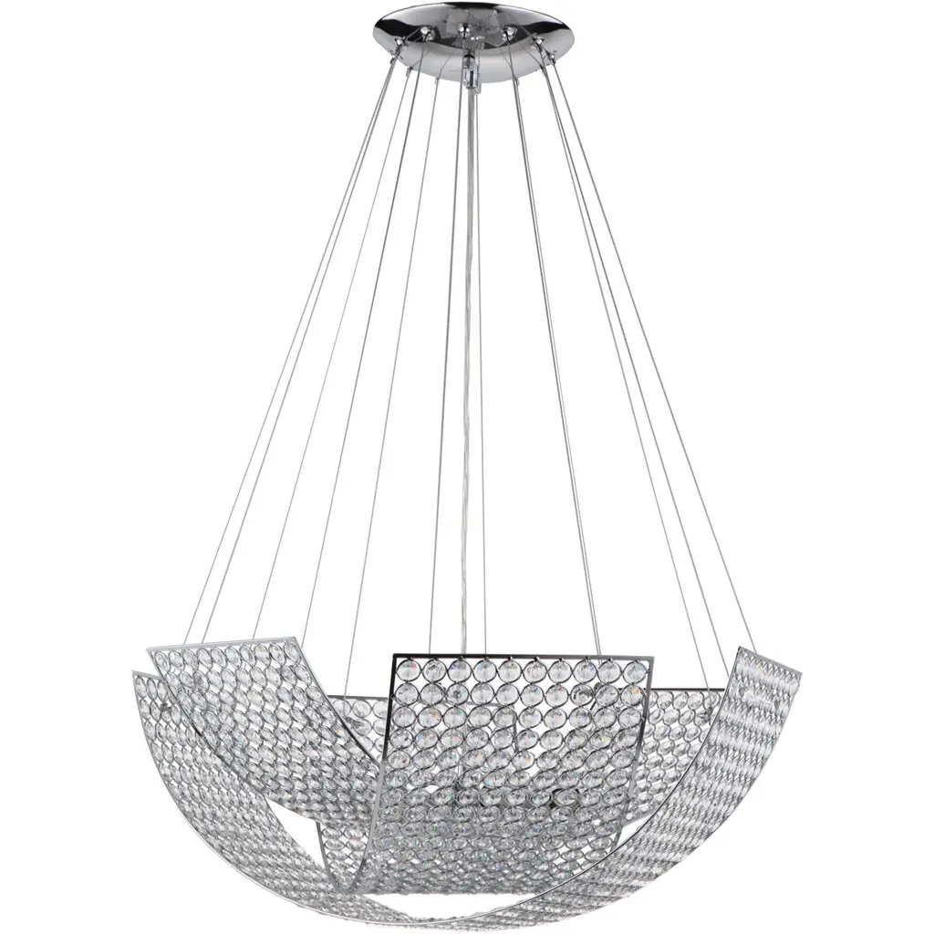 They are waves of water travelling in concentric circles made eternal by glass. Still and bright. Their slightly rippled appearance is due to their trilobate shape, triangles with rounded corners. Light Shar is exclusively available as a pendant light.Additional information:Material: GlassColour: CrystalLight Source: 12 x max 8 W LED G9Finishes: Antique bronze metal / Steel cablesDimensions: Ø 80 x H 68 cm.