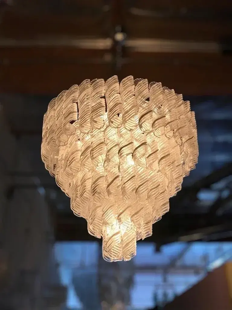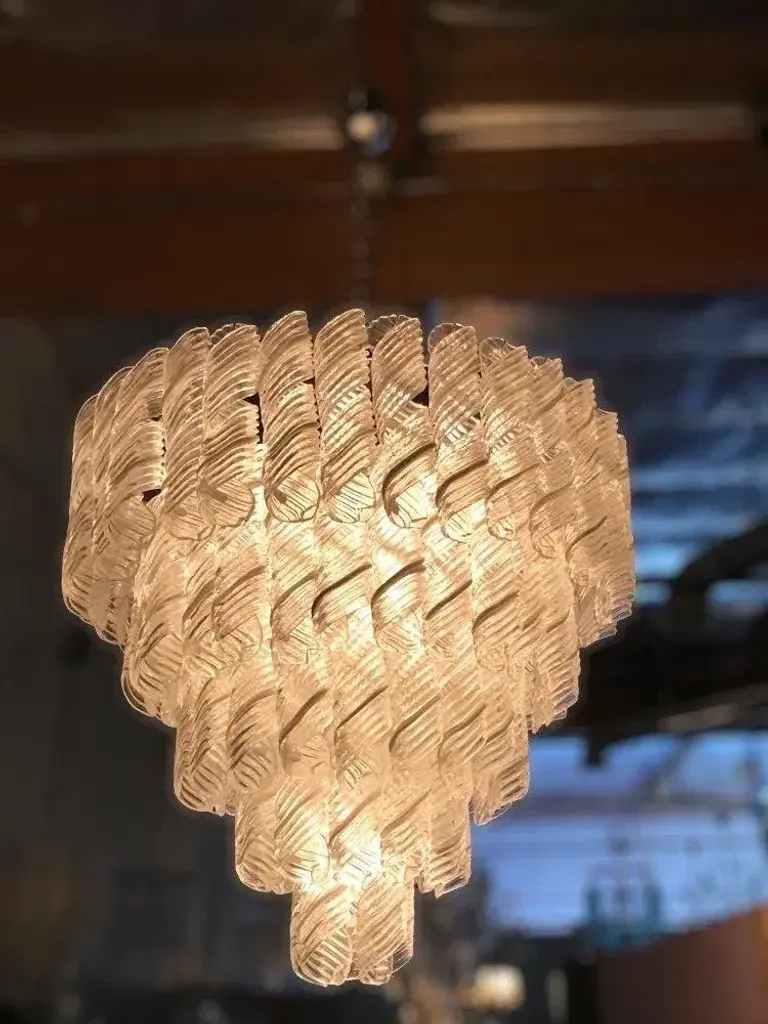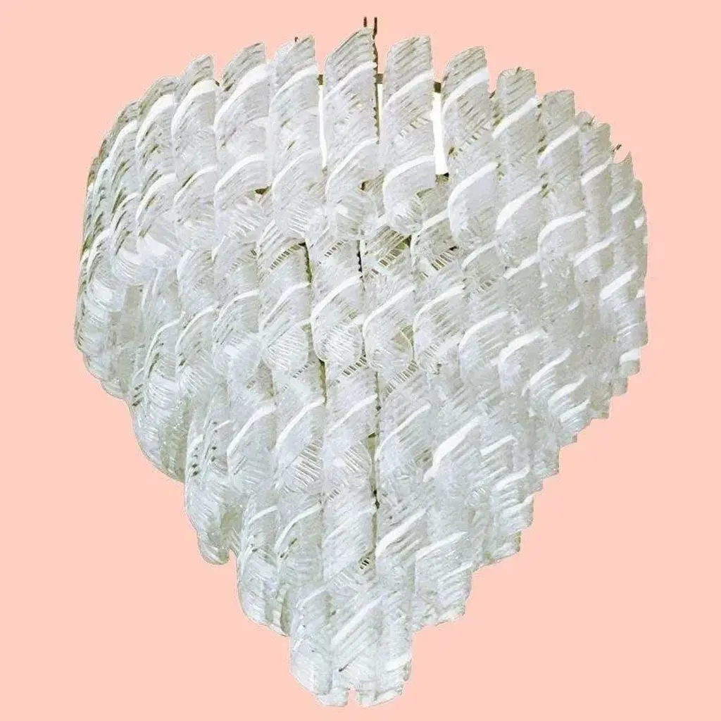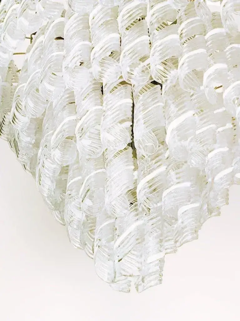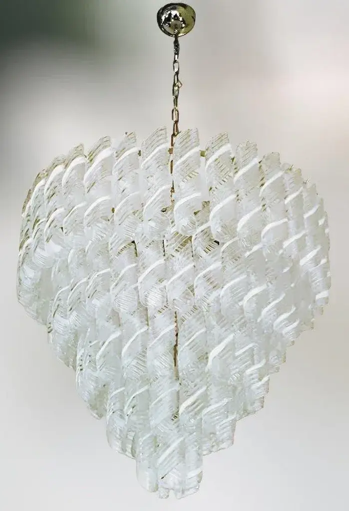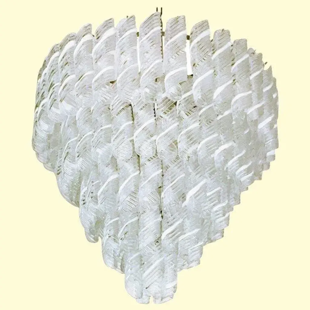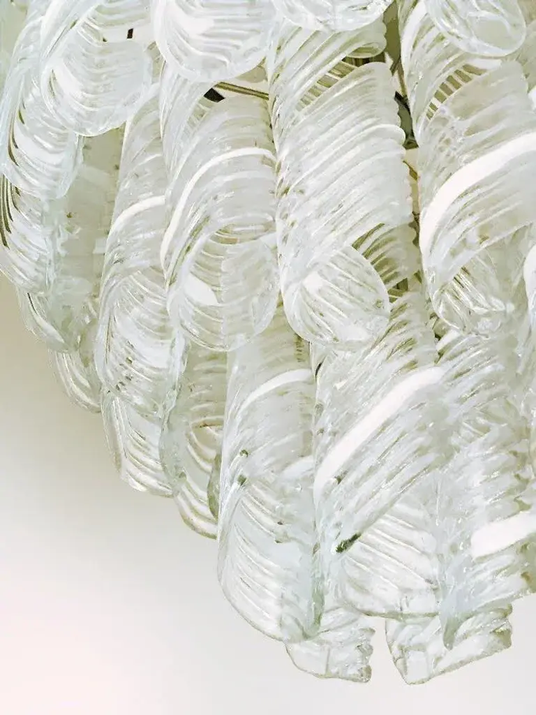 Italian chandelier with clear and white stripe Murano glasses hand blown to produce elegant swirls, mounted on chrome finish frame / Made in Italy 10 lights / 9 in E26 or E27 type, max 60W each and 1 in E12 or E14 type, max 40W Diameter: 29.5 inches / Height: 29.5 inches plus chain and canopy