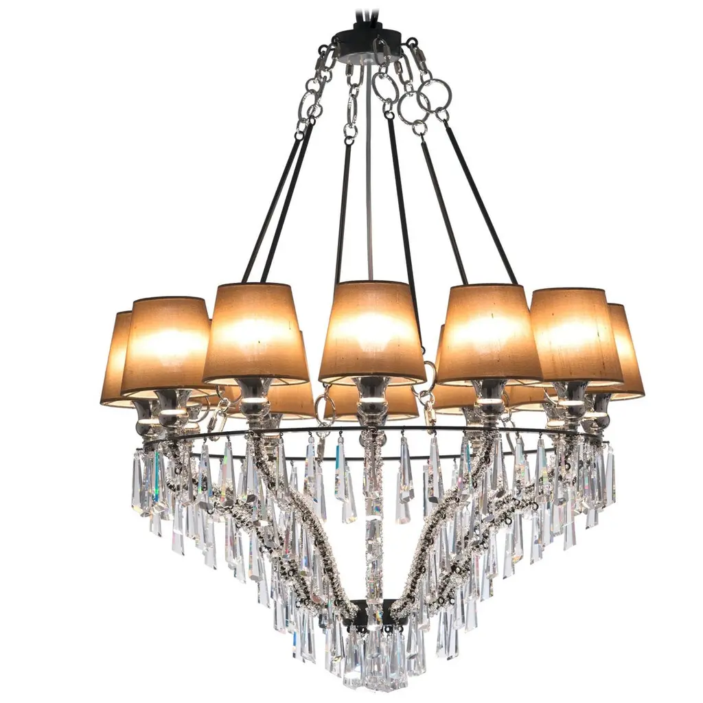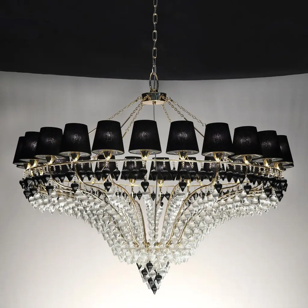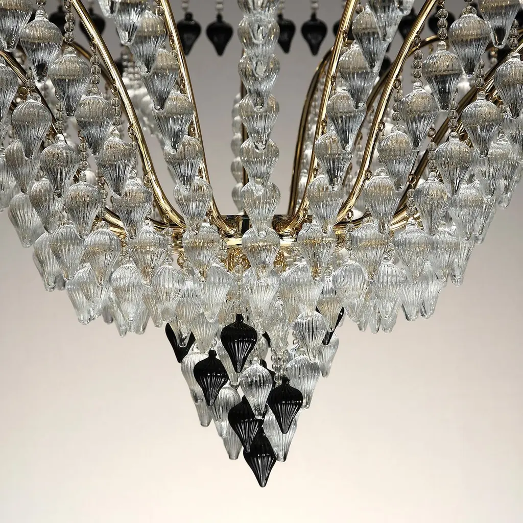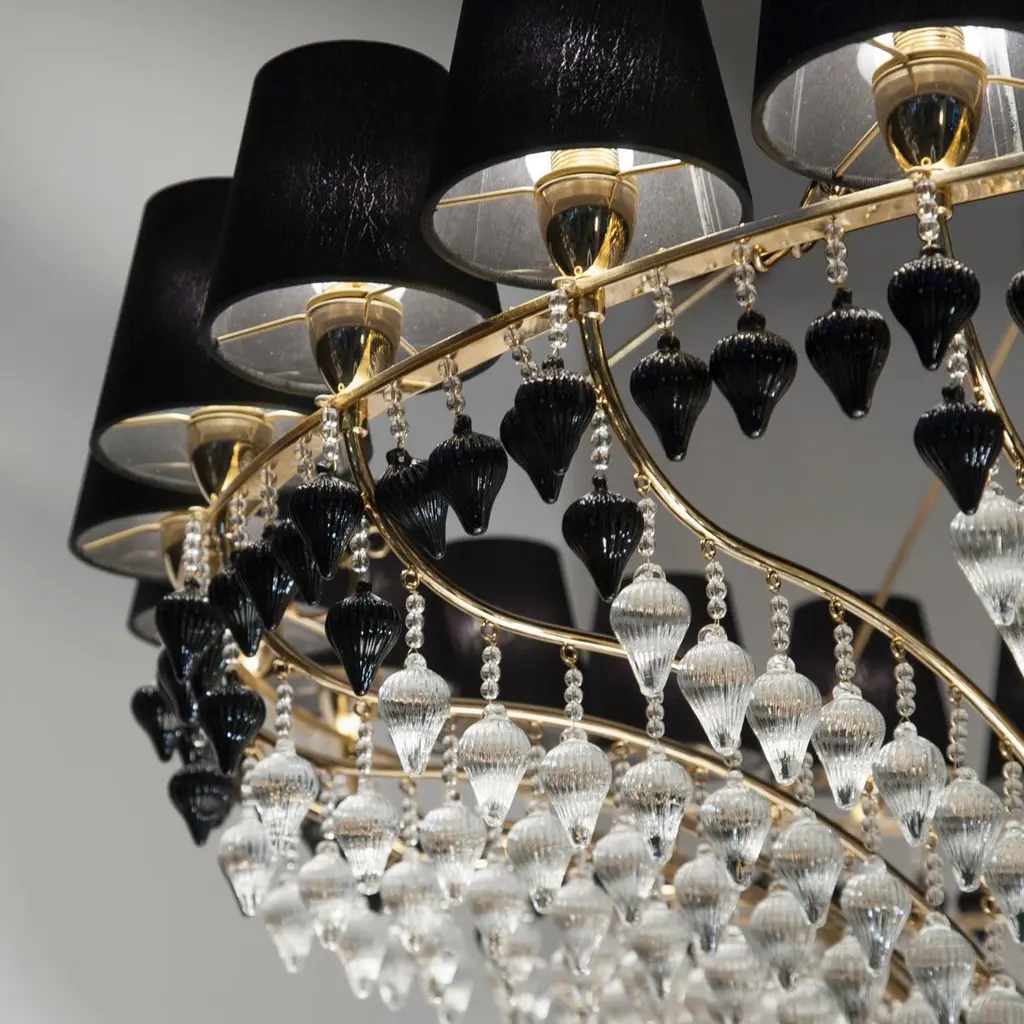 Looking upwards it seems like there are strawberry fields on the ceiling! Ophelia, which has been the company’s symbol for years, has evolved into different models of itself. In the last model the strawberries have been substituted by prisms in clear crystal, while lampshades created with crystal lozenges have made their way in favor of the traditional fabric ones.