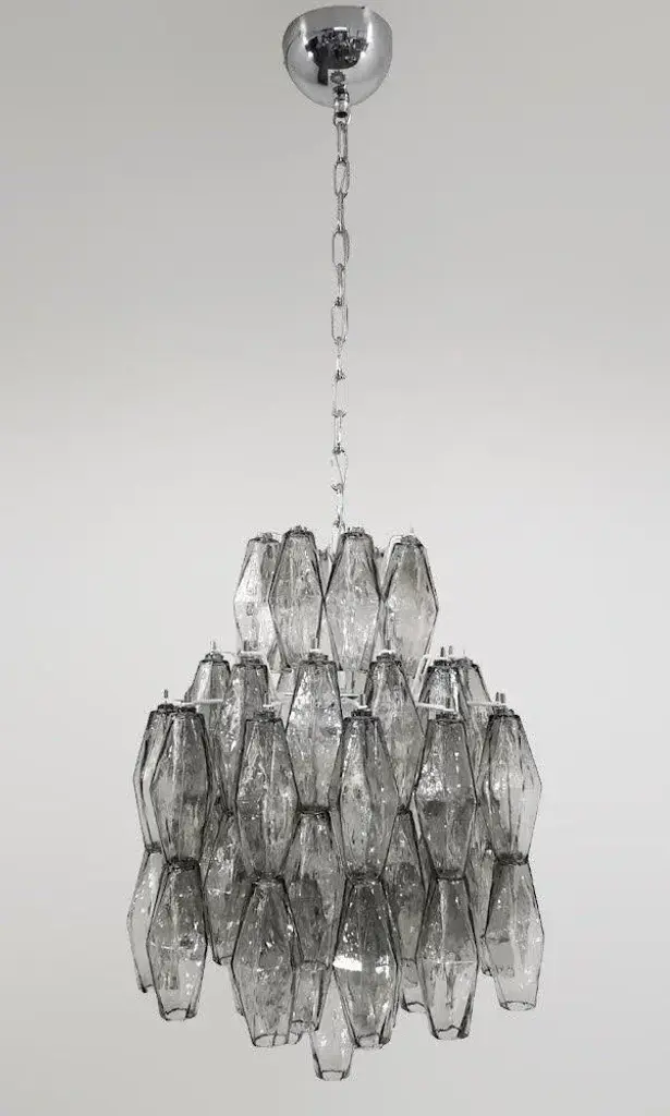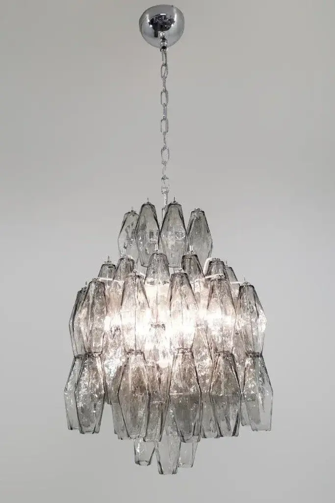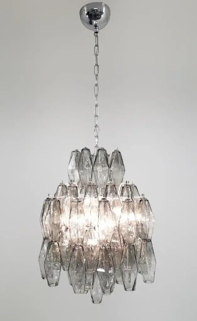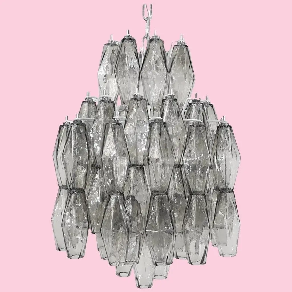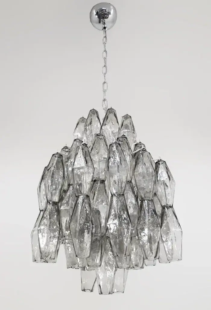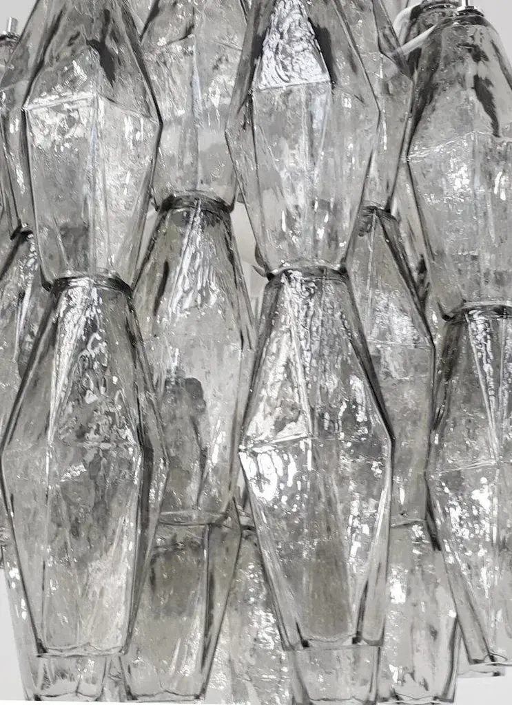 Italian modern chandelier with smoky gray polyhedron/polyhedral shaped Murano glasses, mounted on white enameled metal frame by Fabio Ltd / Made in Italy 4 lights / E12 or E14 type / max 40W each Diameter: 16 inches / Height: 17 inches plus chain and canopy