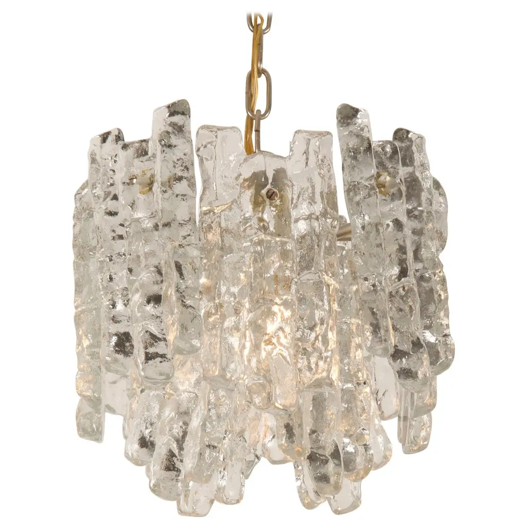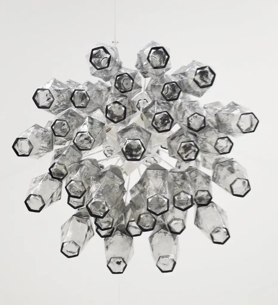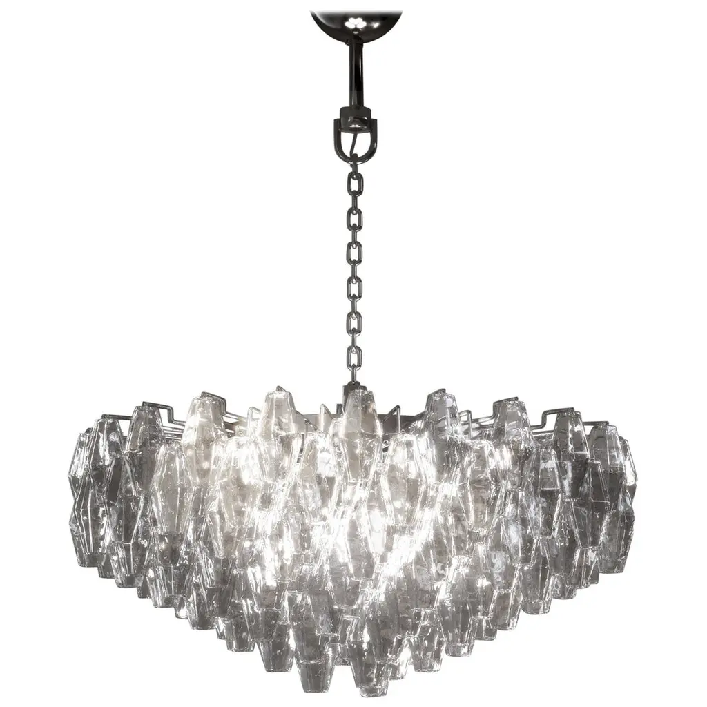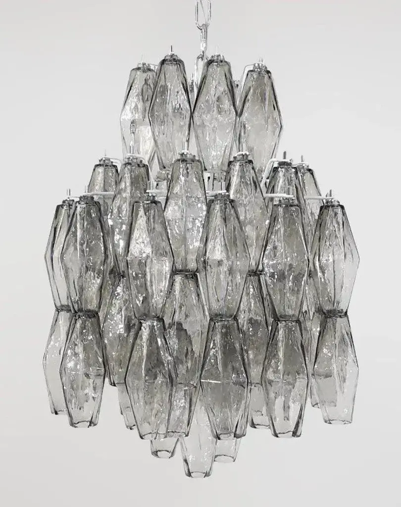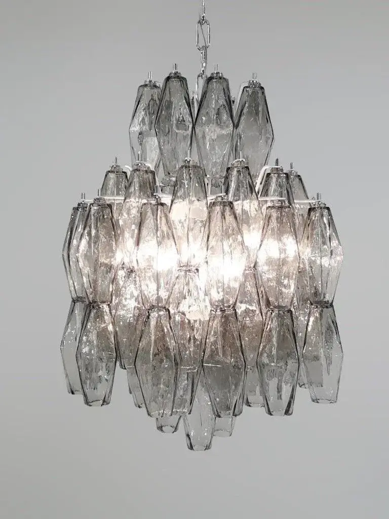 Italian modern chandelier with smoky gray polyhedron/polyhedral shaped Murano glasses, mounted on white enameled metal frame by Fabio Ltd / Made in Italy 4 lights / E12 or E14 type / max 40W each Diameter: 16 inches / Height: 17 inches plus chain and canopy