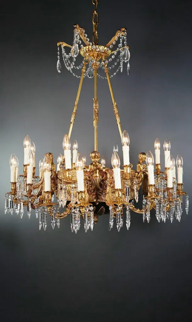 Immerse yourself in the world of luxury with our exquisite chandelier, the “Young Boy Brass Empire Chandelier Luster Lamp Antique Gold”. This stunning chandelier will add a touch of royal glamor and elegance to any room. We are proud that our chandelier, the “Putto Brass Empire Chandelier Luster Lamp Antique Gold”, is a product of our in-house production. This ensures the highest quality and attention to detail at every stage of the manufacturing process. With a generous diameter of 98 cm and an impressive height of 100 cm, this chandelier will be the center of your interior design. The length is variable. The chandelier has 24 E14 sockets and provides enough light to transform your room into a radiant atmosphere. The wiring is carefully and precisely crafted to ensure that the chandelier works smoothly in the USA. To ensure that this chandelier reaches you safely and intact, it will be shipped in a custom-made wooden box. You can trust that your chandelier will arrive in perfect condition. The antique gold finish gives the chandelier a timeless elegance that fits seamlessly into various interior styles, whether classic, modern or vintage. This chandelier is not only stunning lighting, but also an impressive work of art that will transform your home or business into a true jewel. Illuminate your surroundings with the “Putto Brass Empire Chandelier Lamp Antique Gold”.