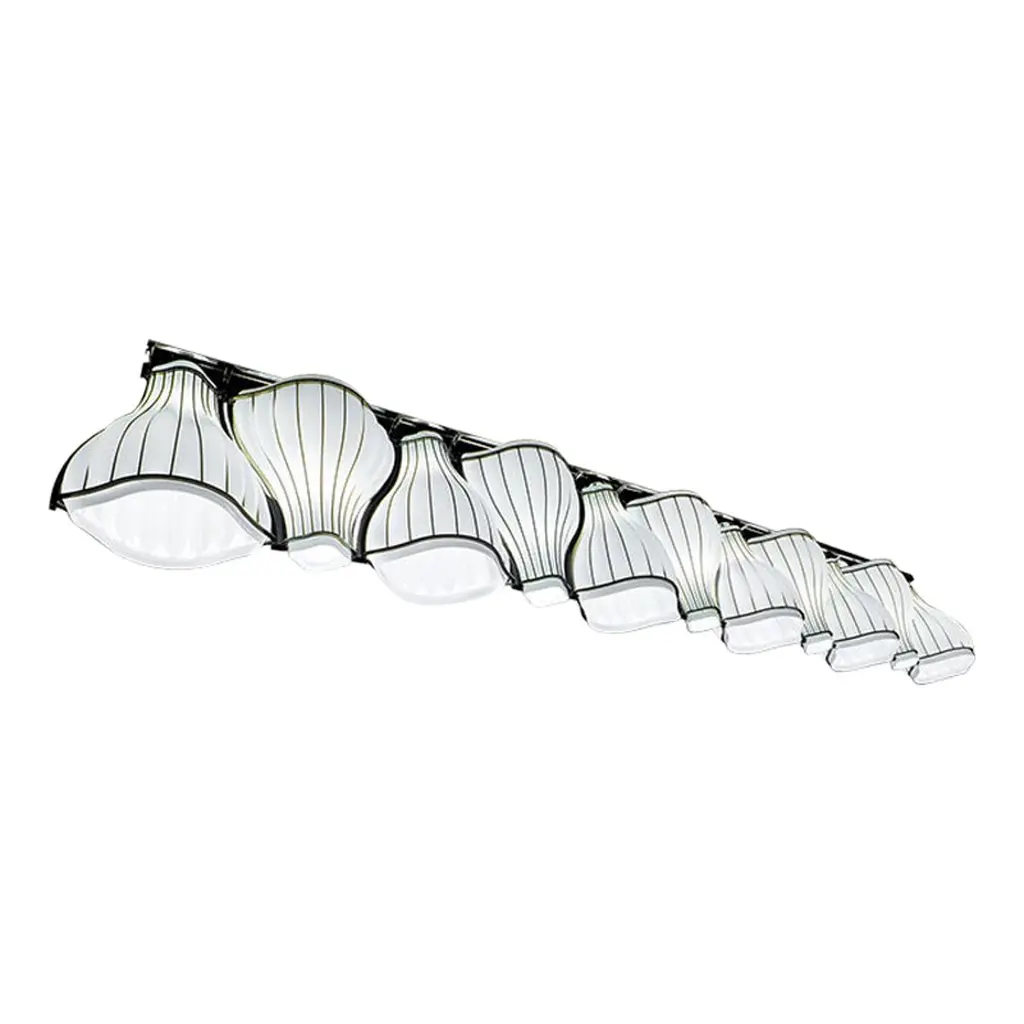 Like notes breaking through the silence and creating rhythm, glass flows through metal structures, turning into lanterns. Rhythm, designed by I M Lab, is the quintessence of the art of Murano glassblowing. Rhythm is exclusively available as a pendant light.Additional Information:Material: GlassColour: Milk-WhiteLight Source: 11 x max 12W LED E27Finishes: Black nickel metalDimensions: W 335 x H 42 cmAvailable in other size option: Extra Small, Small & Medium