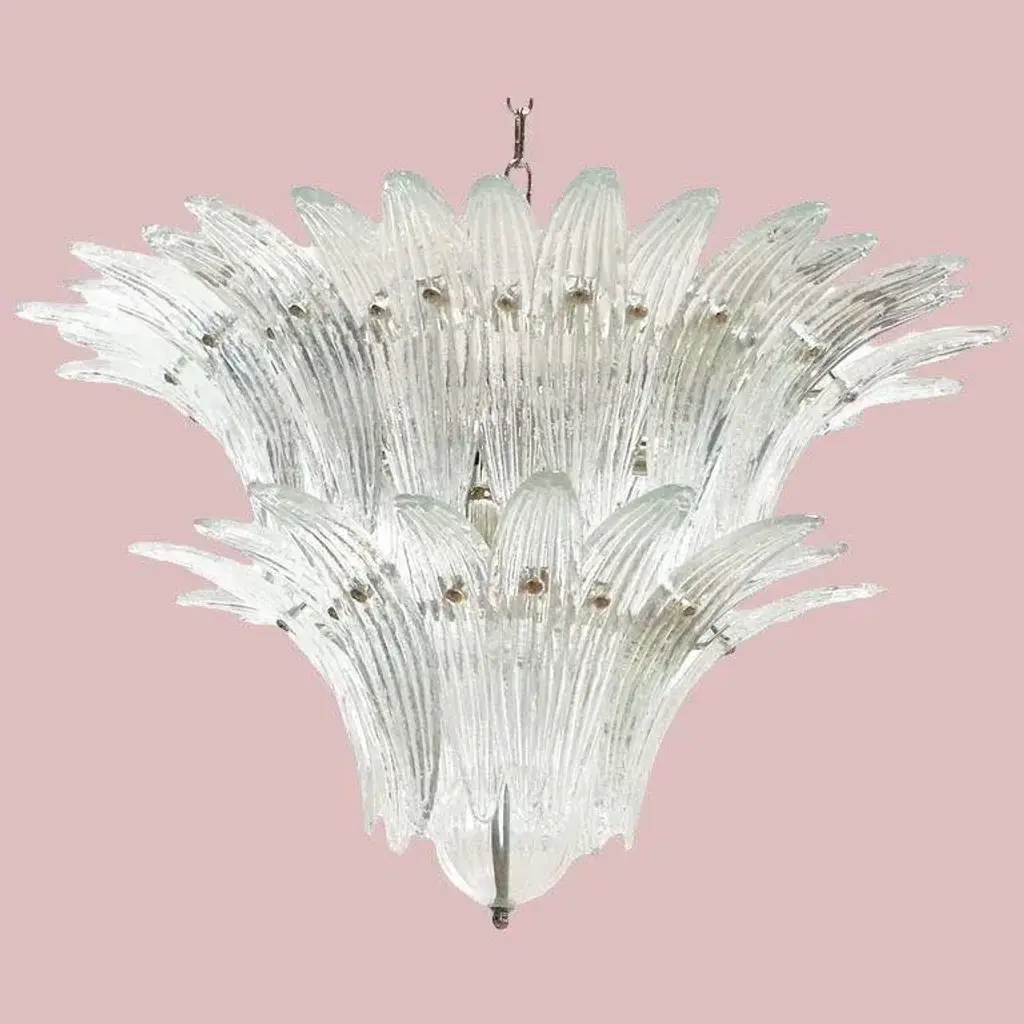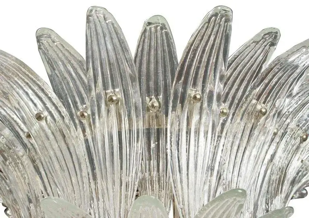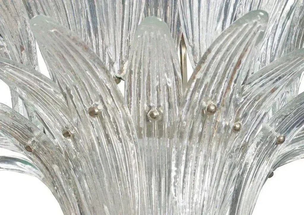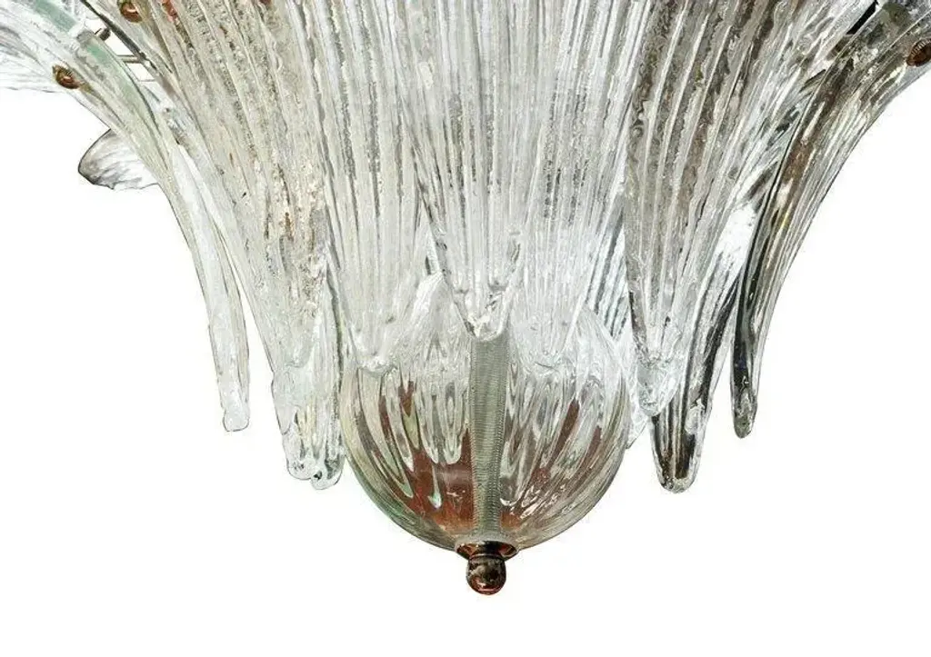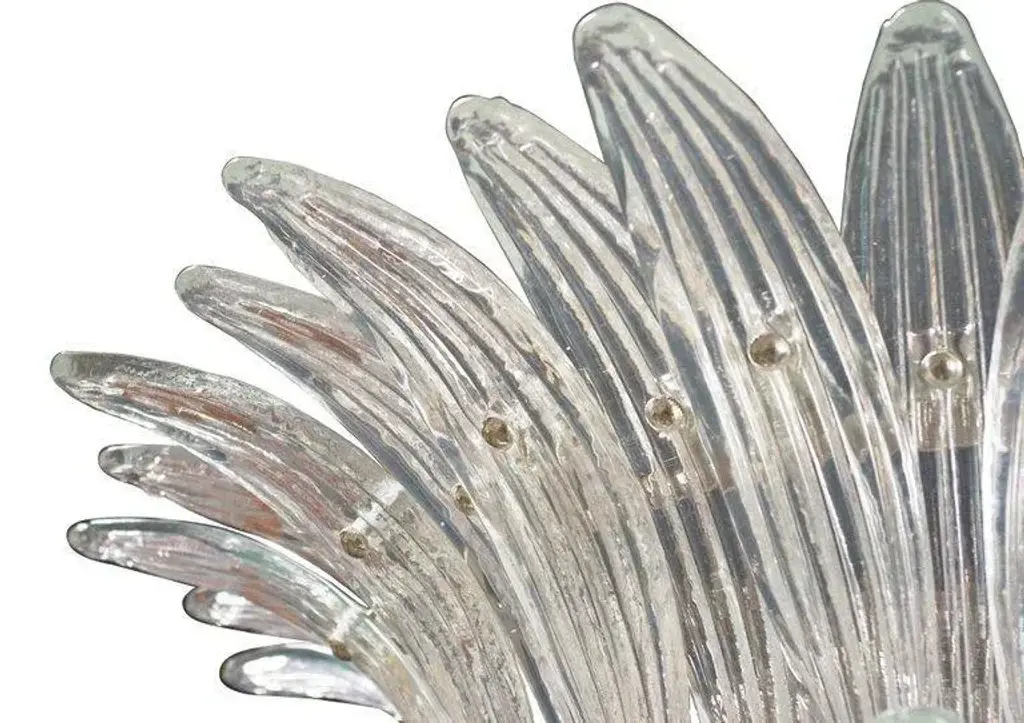 Italian Palmette chandelier with clear Murano glass leaves arranged in two tiers and mounted on chrome finish metal frame by Fabio Ltd / Made in Italy 6 lights / E12 or E14 type / Max 40W each Diameter: 25.5 inches / Height: 18 inches plus chain and canopy