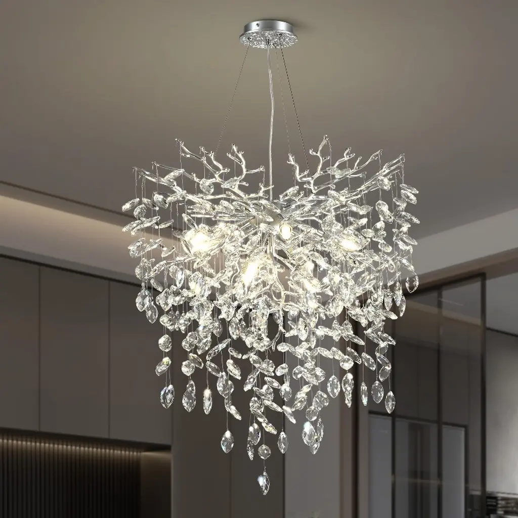 Transform any room with our stunning Tree Branch Crystal Chandelier! Perfect for bedrooms, dining rooms, kitchens, and more, this modern fixture features finely polished crystals and unique handmade patterns inspired by the natural forest. Measuring 23.62"x23.62"x22", it has an adjustable cable (0-59 inches) for versatile installation on flat or sloped ceilings. Includes 63 crystal bunches (2 extra) and requires 8 x 110v G9 bulbs (not included). Add a warm glow and elevate your decor with this dazzling centerpiece!