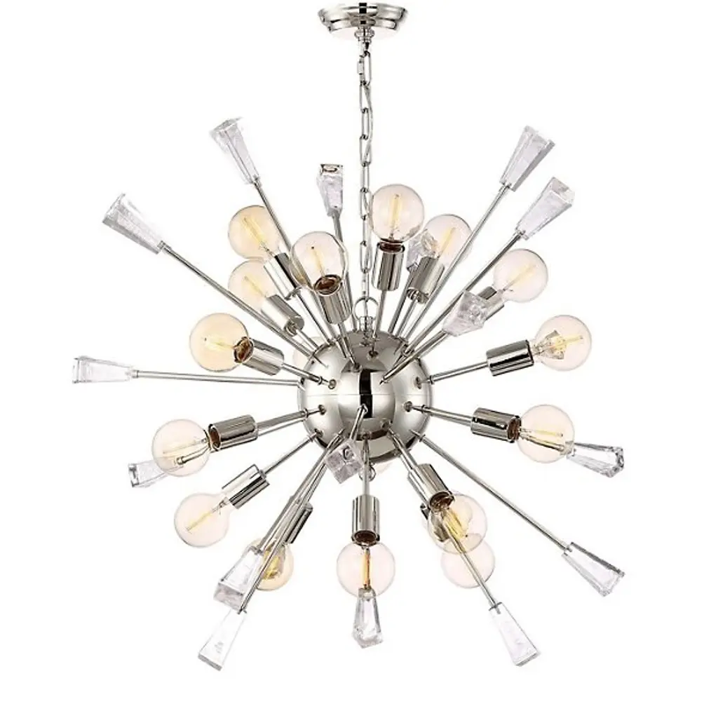 It's an atomic age classic. Crafted from steel, this sputnik chandelier is a spherical starburst of arms extending from a central orb, each topped with either a crystal accent or an exposed bulb. It hangs at an adjustable height + it’s compatible with a dimmer switch to let you set the mood.
