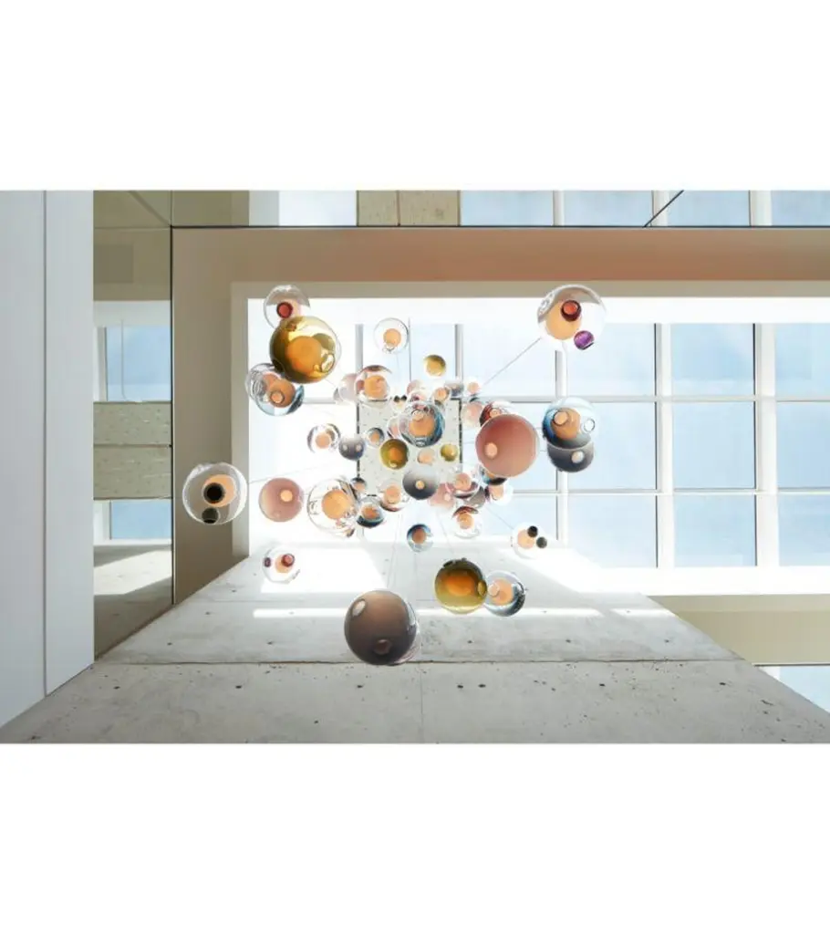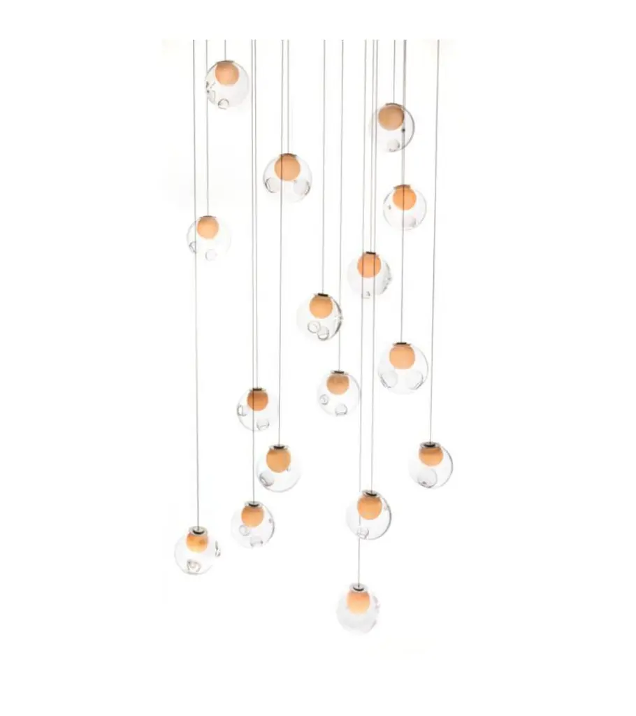 28.16 Rectangular chandelier lamp by BocciDimensions: D 37 x W 110 x H 300 cm Materials: blown glass, braided metal coaxial cable, electrical components, white powder coated canopy. Lamping: :1.5w LED or 20w xenon. Non-dimmable. Cable Lenght: fixed lengths. 3000mm (10’) standard / up to 30500mm (100’) maximumAvailable with Rectangular, or Square Canopy. Also available in different sizes. All our lamps can be wired according to each country. If sold to the USA it will be wired for the USA for instance.28.16 is a random configuration of sixteen 28 pendants hung from arectangular canopy. The drop lengths of the pendants are randomized between a client's specified range of heights to variously cluster and scatter. The result is an ambient installation or field of light.28 is an exploration of specificity in manufacturing. Instead of designing formitself, here the intent was to design a system of making that yields form.Individual 28 pendants result from a complex glass blowing technique whereby air pressure is intermittently introduced into and then removed from a glass matrix which is intermittently heated and then rapidly cooled. The result is a distorted spherical shape with a composed collection of imploded innershapes, one of which acts as a shade for the light source.Standard 28s are made with clear glass exterior spheres and milk whiteinterior lamp holder cavities. 28s are possible with infinite versatility in colorcompositions, sizes, and shapes.Bocci is a design and manufacturing company based in Vancouver and Berlin. Founded in 2005 under the creative directorship of Omer Arbel, Bocci is committed to fostering a lateral and open-ended relationship between creative direction and craft. The company launched with one lighting design, ‘14’, which became an instant classic and remains a design staple and bestseller. Bocci’s growing portfolio of sculptural lighting is developed, engineered, and fabricated in-house, through an infrastructure calibrated to provide full control over technique, quality, and scale.In 2015, Bocci transformed a historic Berlin building into a showroom and archive. ‘Bocci 79’ inhabited a 2,200 m² / 23,600 sq ft former courthouse, constructed in 1896, and showcased over a decade of works by Omer Arbel, ranging from pieces in progress, prototypes, and ideas, to the complete range of catalog pieces developed for Bocci.Bocci 79 closed in June 2020 and we are currently working on our new, permanent Berlin showroom which will open soon.