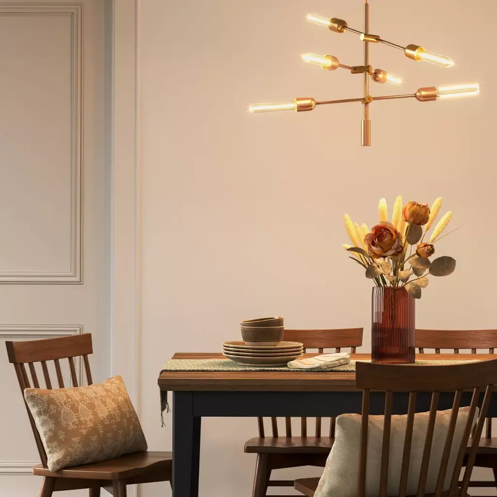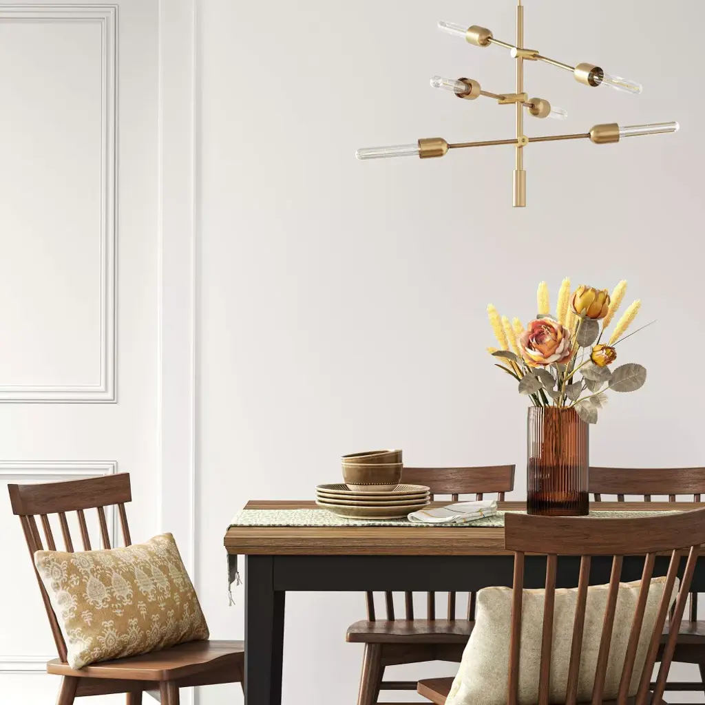 Add the perfect stylish touch to your favorite indoor space with this 3-Arm Chandelier from Threshold™. This ceiling chandelier light features a stylish 3-arm metal body with 6 vintage-style light bulbs to create a modern eye-catching ambiance, providing warmth and a welcoming vibe to your kitchen or living room layout. Whether hung in the living room or above a kitchen island, this metal 3-arm chandelier makes the perfect choice to beautifully illuminate any space.Overall Height of Lamp: 18.25 inchesOverall Width of Lamp (Diagonal): 18.75 inchesHeight of Stem: AdjustableDiagonal Length Between Bottom Lights: 15.375 inchesDiameter of Mounting Plate: 5.0 inchesHeight of Mounting Plate: 1.0 inches
