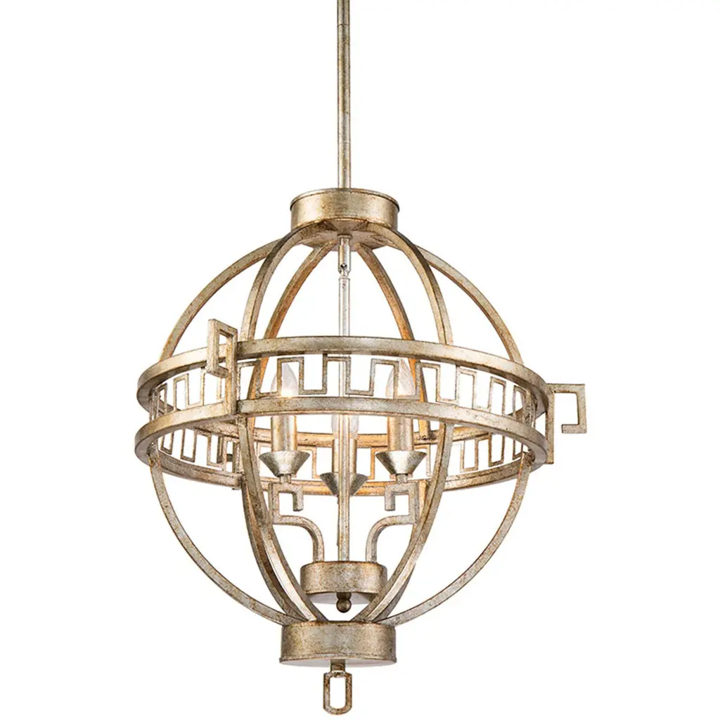 A one-of-a-kind design that is the perfect focal point in our warm vintage Silver finish. The Lemuria family designed by Karyl Pierce Paxton uses the classic Greek key motif in a rich silver finish and an open chandelier style pendant. The globe pendant is a unique traditional orb style, and perfect for customers using in a kitchen or foyer installation. Combining the rustic geometric shape and the traditional distressed finish gives a fresh look to our newest Flambeau inspired piece.