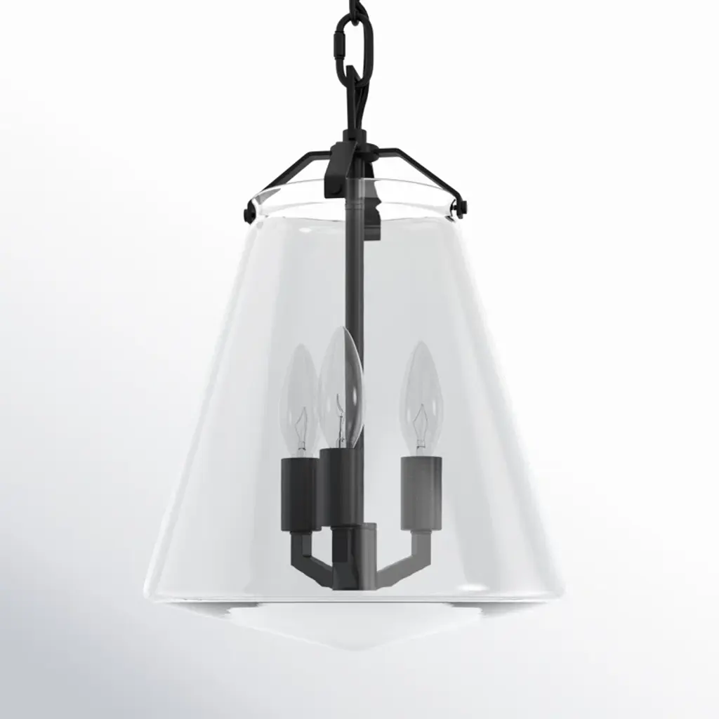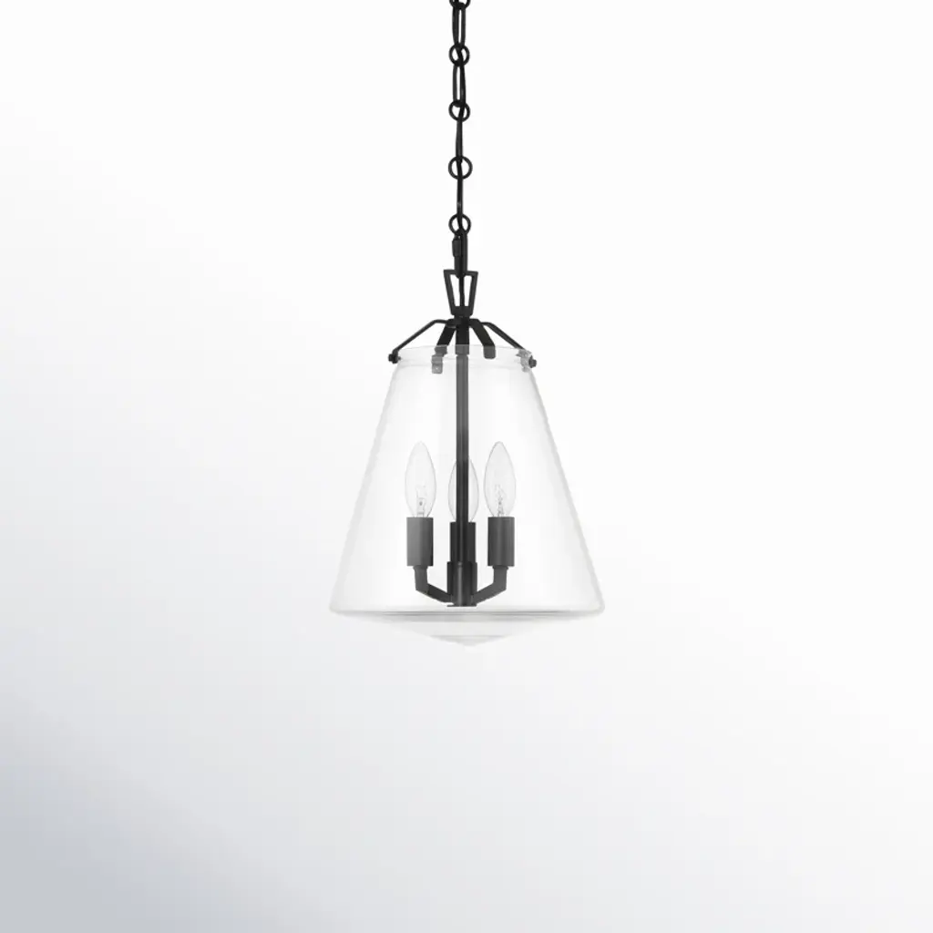 The Mandola collection is a sleek, enduring design with subtle angular details, offered in various finishes and sizes for your unique space. It’s clear glass cone-shaped pendant is closed on the bottom and fastened with metal on its open top. The patterned chain detail adds a touch of character to its streamlined design. The Mandola collection is not confined to a single style; it is a versatile design that suits a variety of spaces, from minimalist and modern to classic and eclectic.