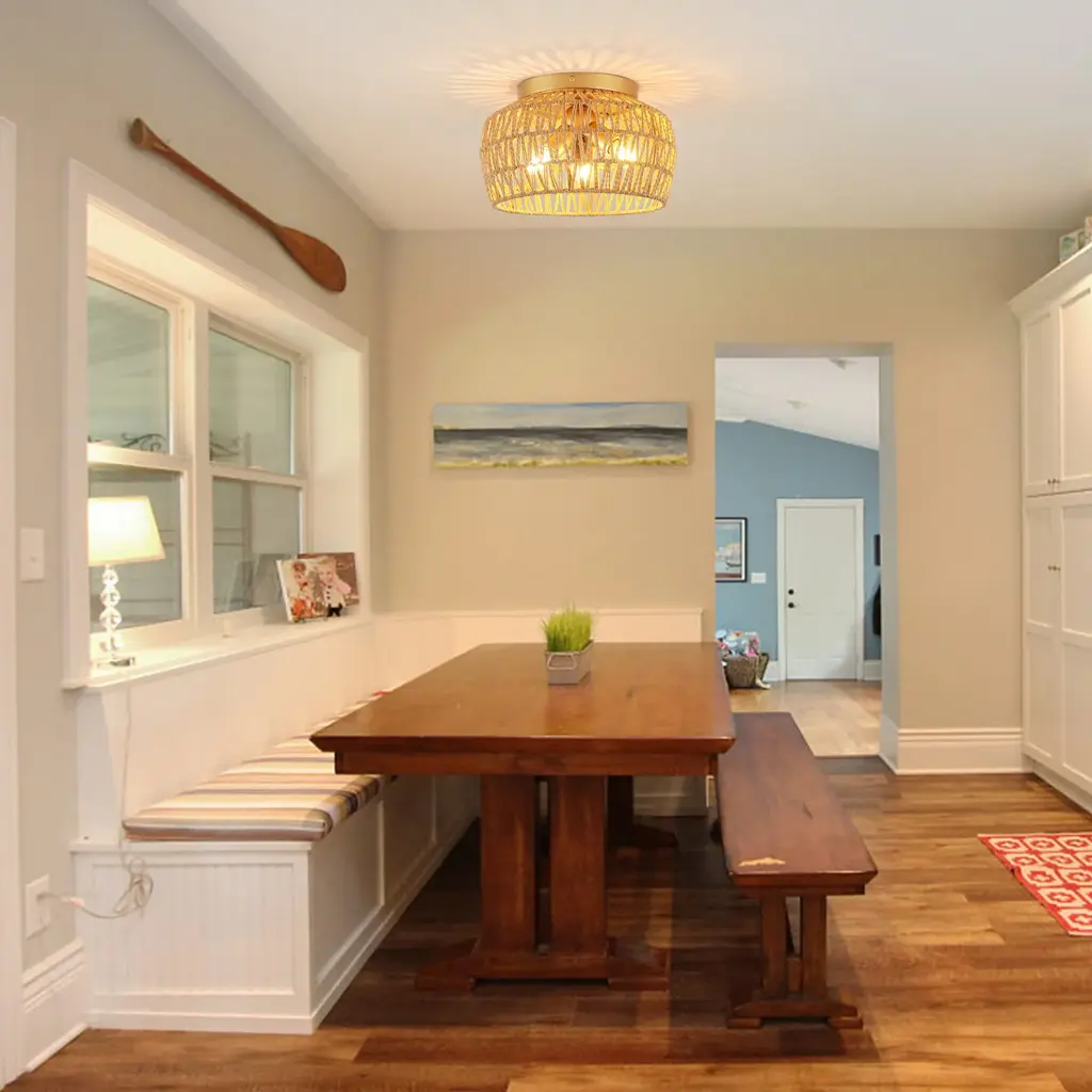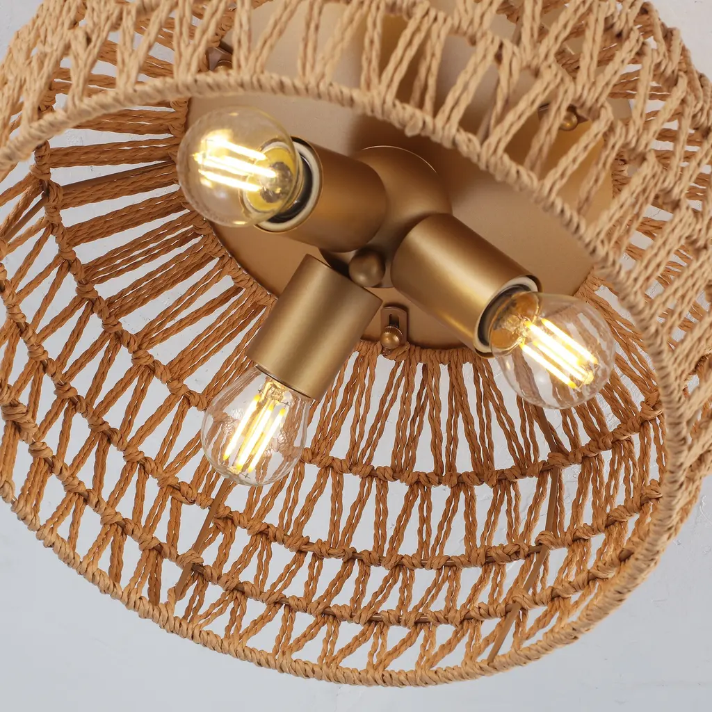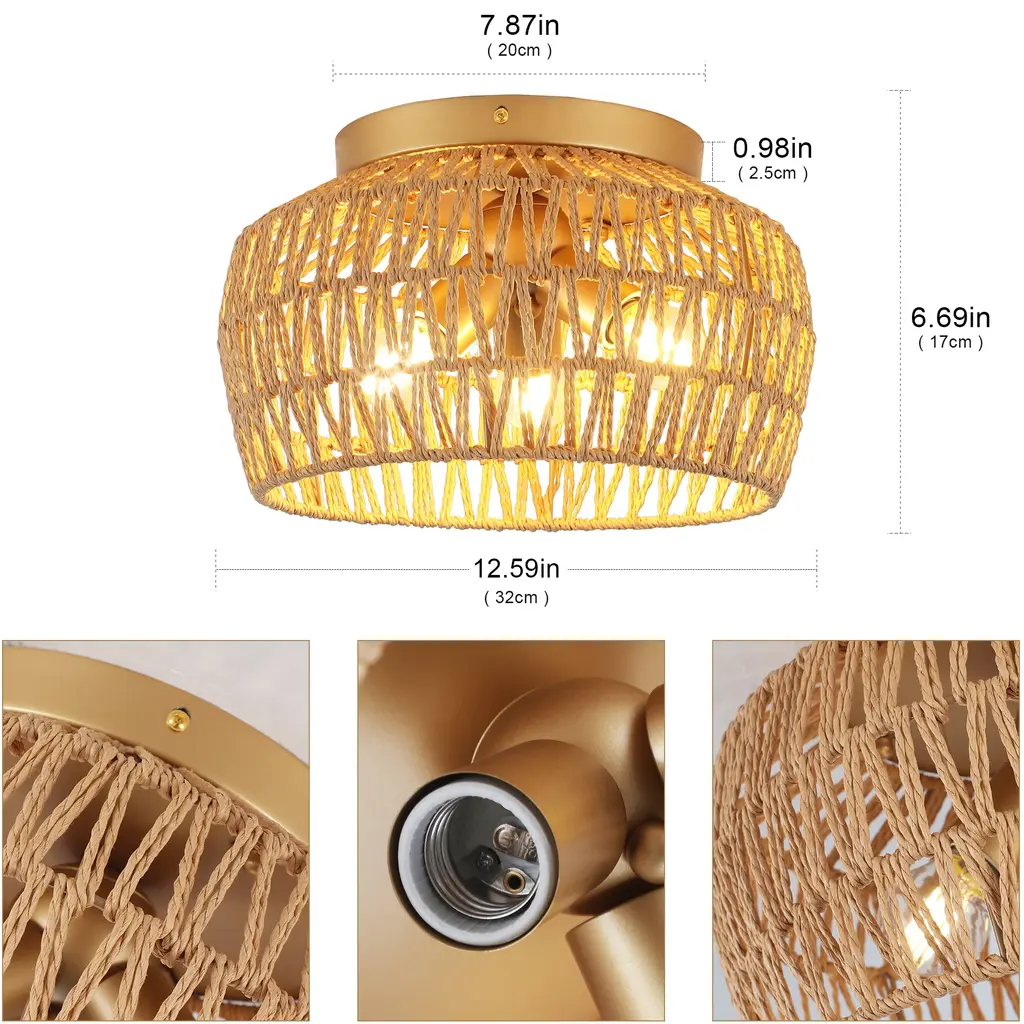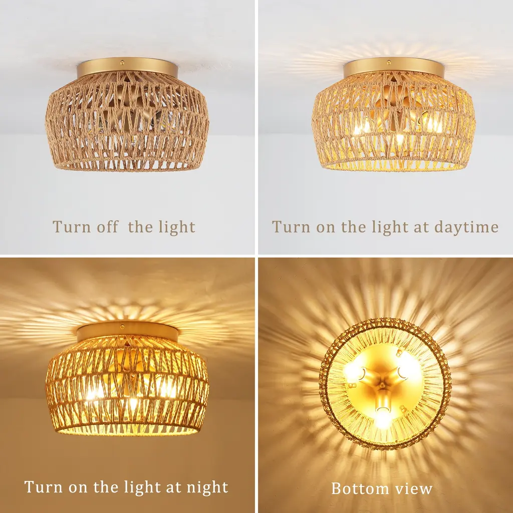 The Bohemian design makes this flush mount a distinctive addition to your screened-in porch or bathroom. Its circular frame is wrapped in woven rattan to create a breezy silhouette that complements the finish on the finial. Two 60W bulbs (not included) sit inside and wash your space in a warm glow. Plus, this flush mount is dimmable to get the lighting you want (not included). Features: Versatile Lighting Options: Illuminate any space with this 3-light semi flush mount fixture. Compatible with various bulb types including Edison, Incandescent, Halogen, LED, or CFL Dimmable for Ambiance: Create the perfect atmosphere with the ability to dim the lights when using a compatible dimmable bulb and dimmer switch (bulbs and dimmer not included) Effortless maintenance and replacement: With its distinctive design, you can rest assured that the accumulation of ash over an extended period of time will not be a concern, as cleaning is both effortless and time-efficient. Additionally, the process of replacing the bulb is highly convenient Wide Application: Whether you want to enhance the lighting in your living room, bedroom, kitchen, or hallway, these semi flush light are suitable for various applications. Their versatile design makes them a perfect choice for both residential and commercial spaces Easy Installation: Say goodbye to complicated setups. The packaging includes installation instructions and accessories, as well as connectors for quick installation. Additionally, customers have the option to access a video demonstration of the product, providing a visual guide to its installation process Professional Guarantee Service: We are committed to providing excellent customer service and ensuring your satisfaction with our products. If you have any questions or concerns, our professional customer support team is ready to assist you and provide a guarantee of quality and performance