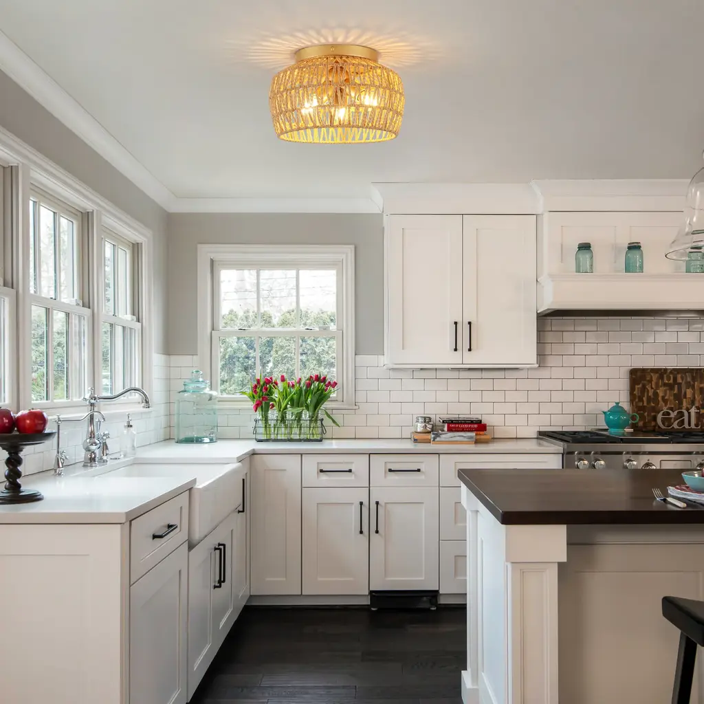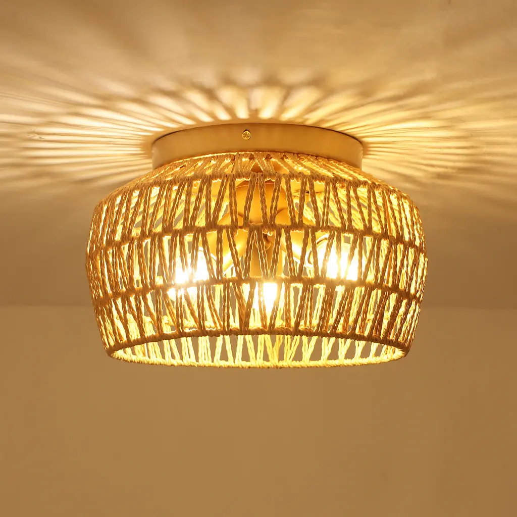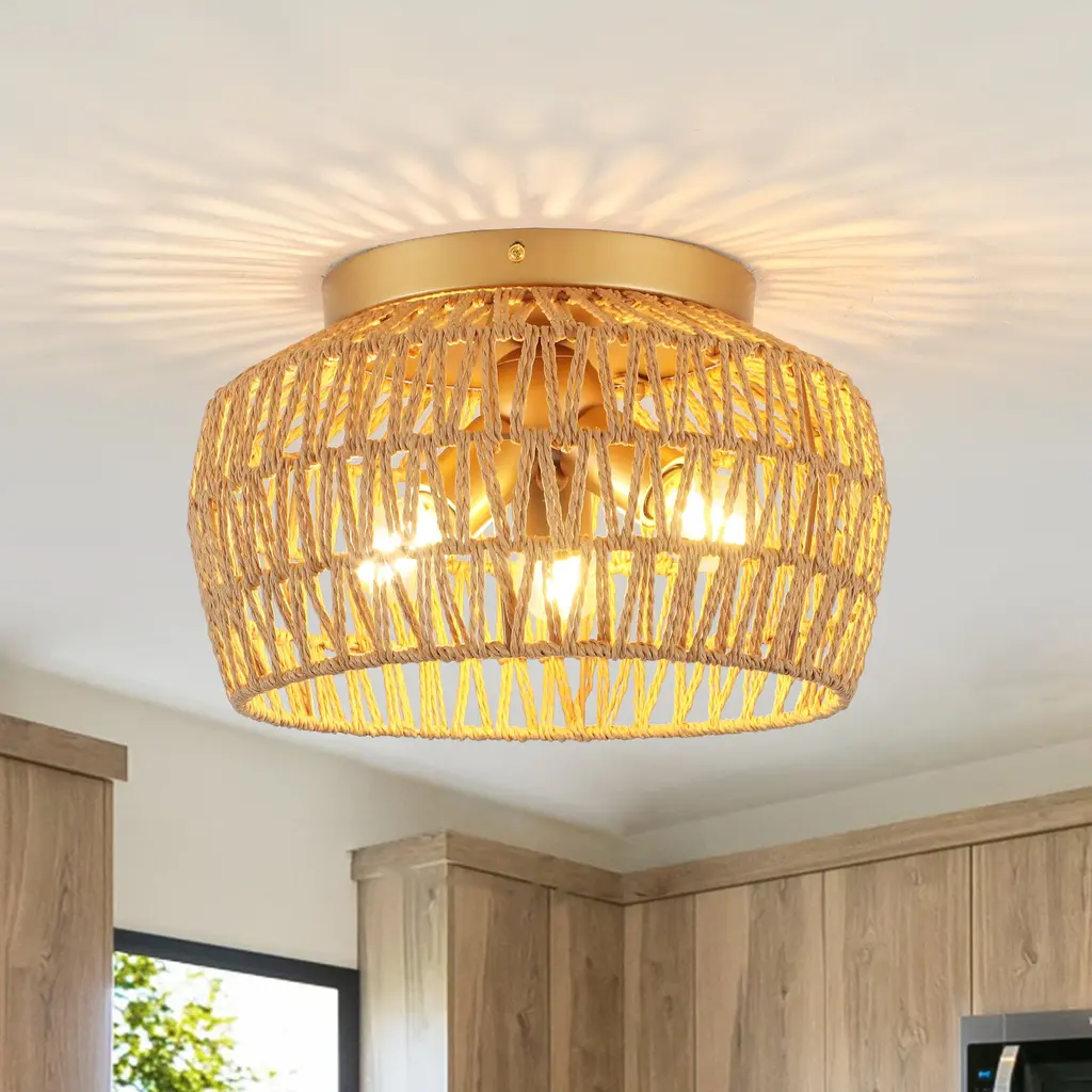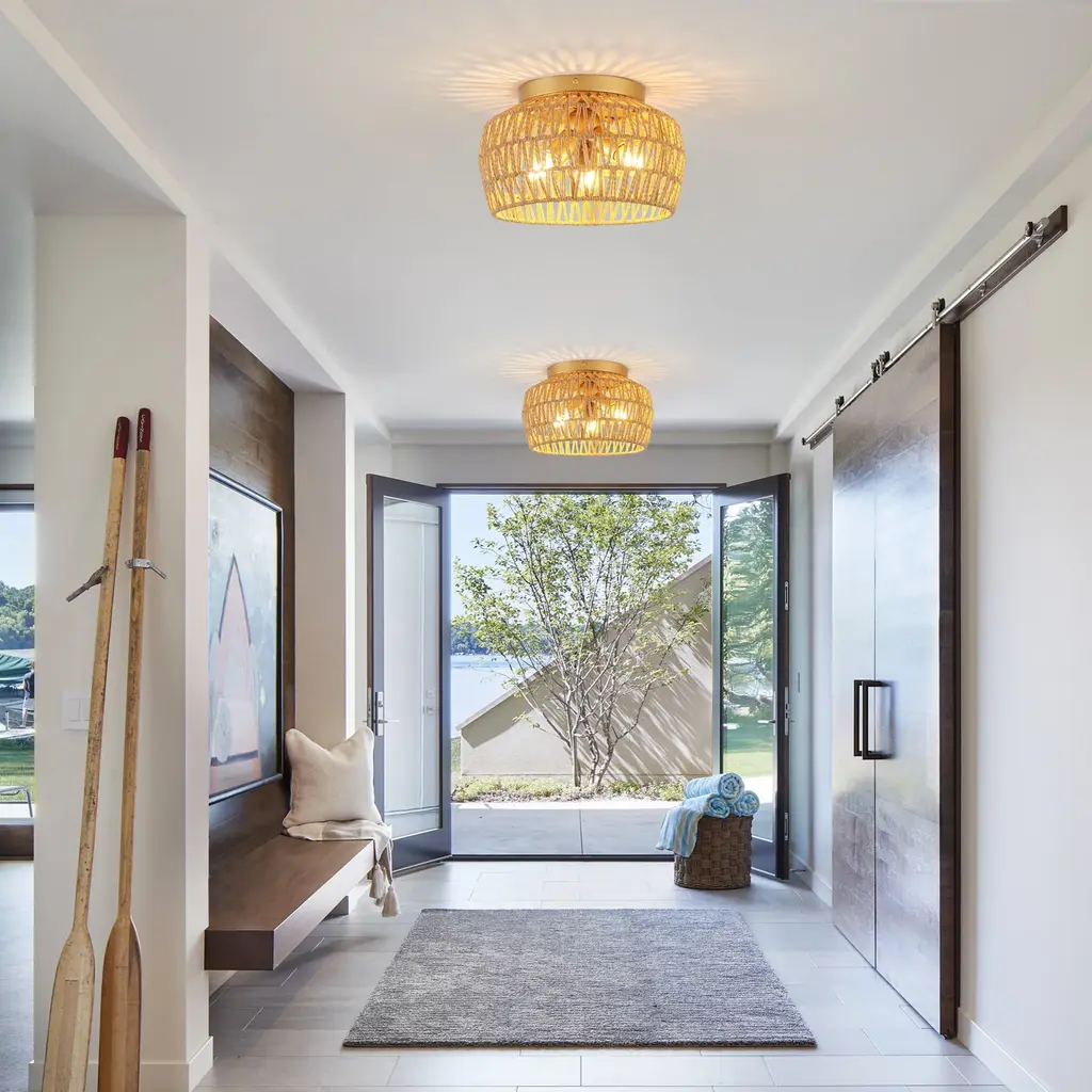 The Bohemian design makes this flush mount a distinctive addition to your screened-in porch or bathroom. Its circular frame is wrapped in woven rattan to create a breezy silhouette that complements the finish on the finial. Two 60W bulbs (not included) sit inside and wash your space in a warm glow. Plus, this flush mount is dimmable to get the lighting you want (not included). Features: Versatile Lighting Options: Illuminate any space with this 3-light semi flush mount fixture. Compatible with various bulb types including Edison, Incandescent, Halogen, LED, or CFL Dimmable for Ambiance: Create the perfect atmosphere with the ability to dim the lights when using a compatible dimmable bulb and dimmer switch (bulbs and dimmer not included) Effortless maintenance and replacement: With its distinctive design, you can rest assured that the accumulation of ash over an extended period of time will not be a concern, as cleaning is both effortless and time-efficient. Additionally, the process of replacing the bulb is highly convenient Wide Application: Whether you want to enhance the lighting in your living room, bedroom, kitchen, or hallway, these semi flush light are suitable for various applications. Their versatile design makes them a perfect choice for both residential and commercial spaces Easy Installation: Say goodbye to complicated setups. The packaging includes installation instructions and accessories, as well as connectors for quick installation. Additionally, customers have the option to access a video demonstration of the product, providing a visual guide to its installation process Professional Guarantee Service: We are committed to providing excellent customer service and ensuring your satisfaction with our products. If you have any questions or concerns, our professional customer support team is ready to assist you and provide a guarantee of quality and performance