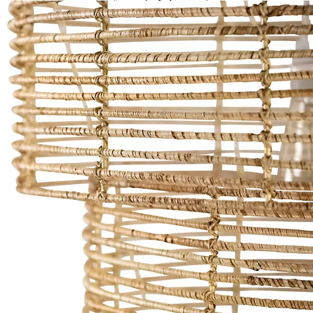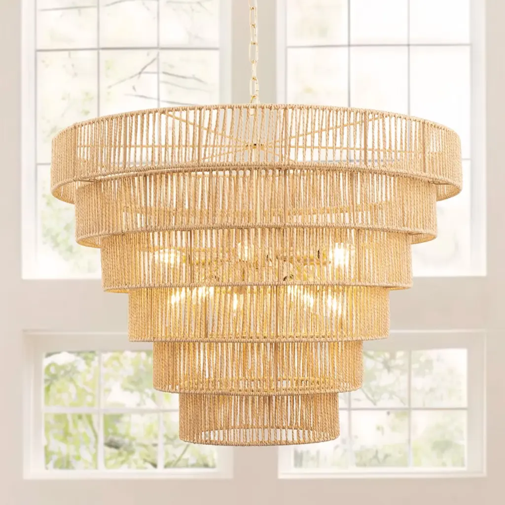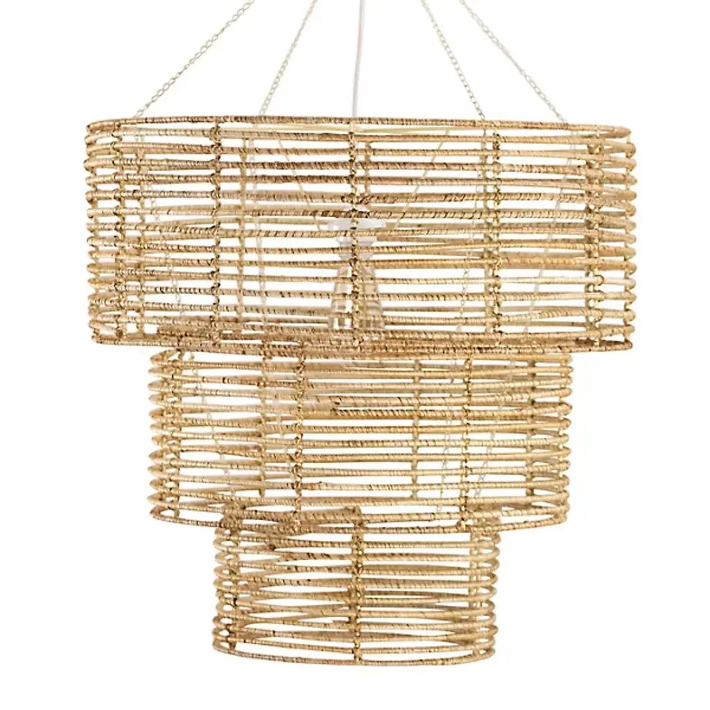 The 3 Tier Chandelier from Woven combines architectural form with natural jute rope construction. Each tier creates distinct layers of illumination while maintaining cohesion through consistent materials. The graduated design works effectively in taller spaces like foyers or above dining areas. Professional installation is required for this hardwired fixture, which isn't compatible with sloped ceilings. The natural materials and structured arrangement allow this piece to create balanced radiance.