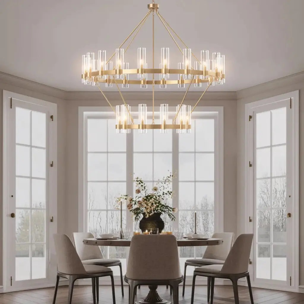 This 30 - Light classic and elegant finishes wagon wheel chandelier ( with clear glass shade ) is carefully designed to make it blend into the home environment by professional designers. Every part of the lamp body is created by the precise cutting of machinery and the ingenuity of human craftsmanship. The distinctive and eye-catching design of farmhouse pendant light makes them an ideal centerpiece for any room.