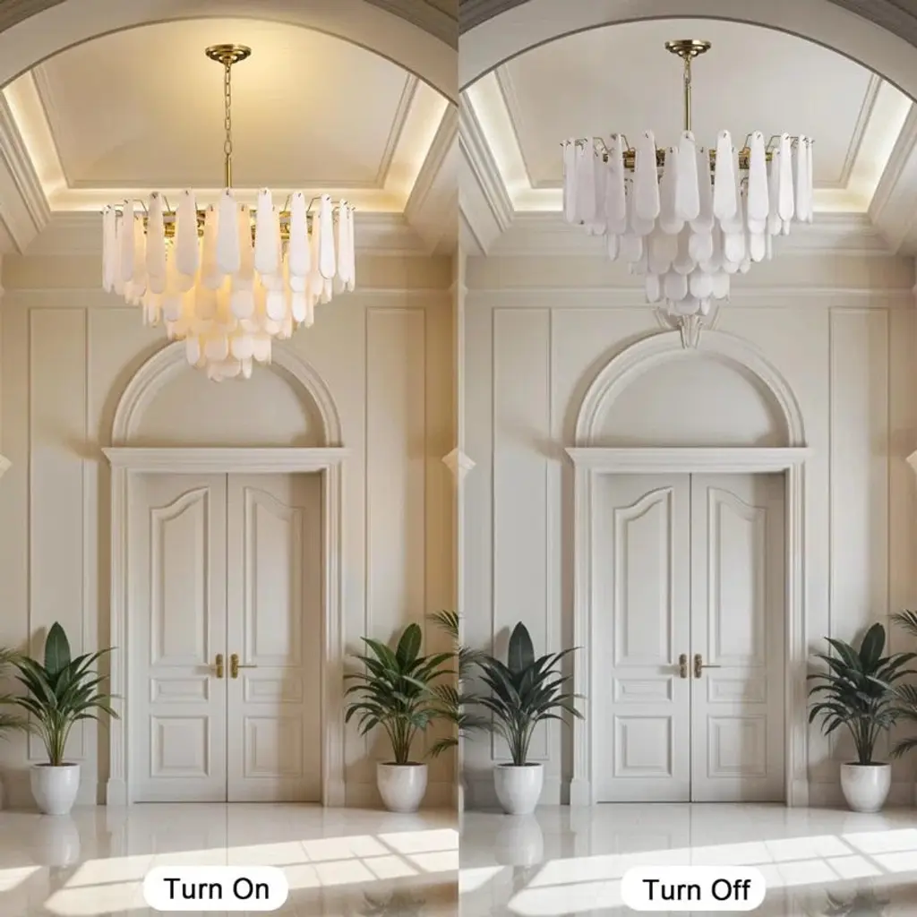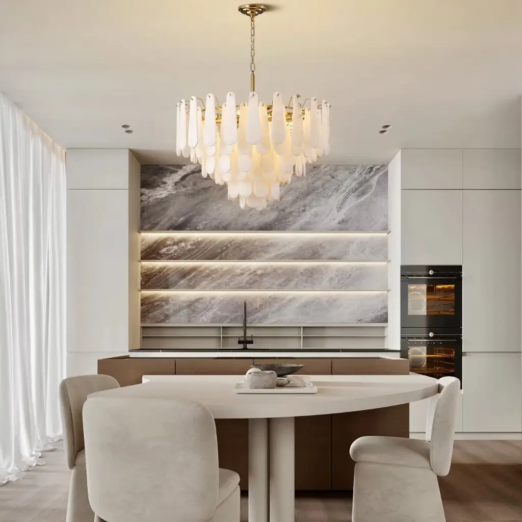 Elevate your space with our Natural Spanish Marble Alabaster Chandelier, featuring 89 hand-polished marble pieces with a luxurious, cloud-like texture. This 6-tier round fixture measures 80×55 cm, with an adjustable height from 11.81" to 78.74" and adjustable brightness (dimmer not included). Perfect for dining rooms, living rooms, staircases, and more, it adds a sophisticated touch to any decor. Easy installation with a secure hook design ensures safety and elegance.