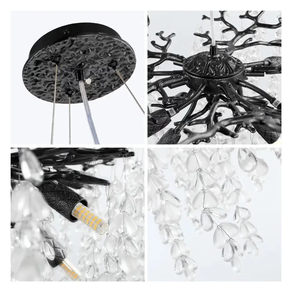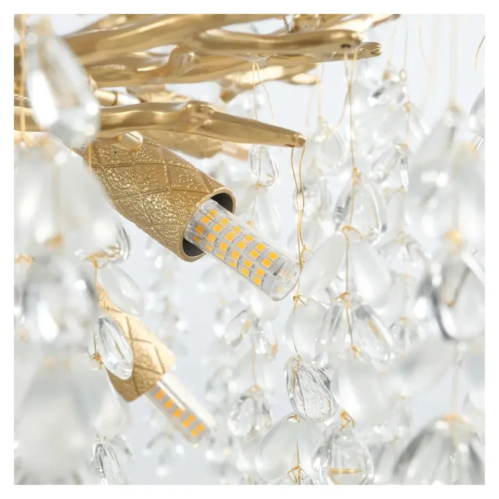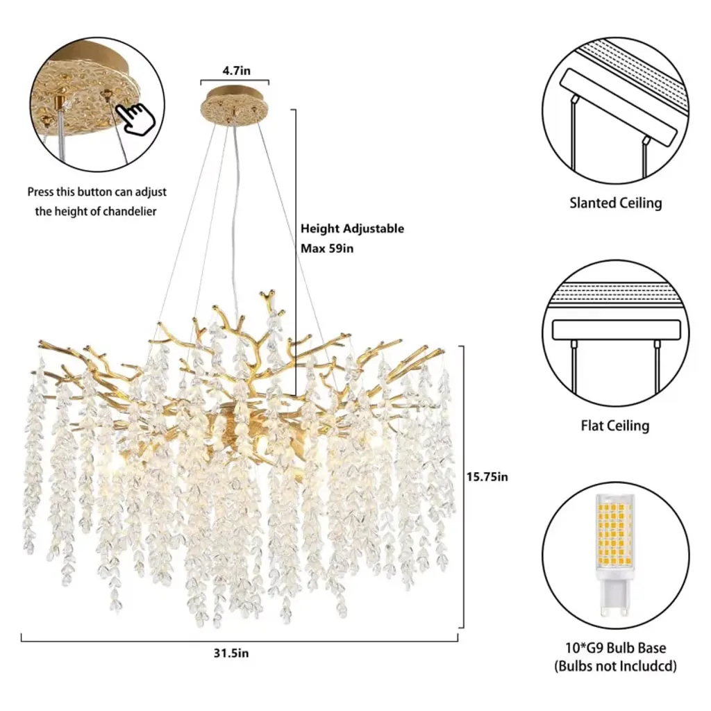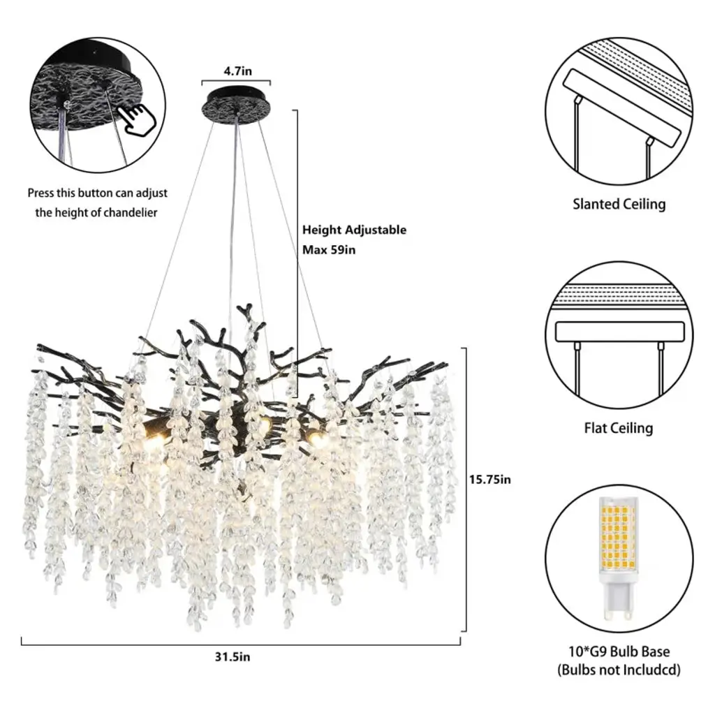 Enhance your decor with this finely polished crystal chandelier, featuring unique handmade patterns and a translucent pendant inspired by the natural forest. This modern, tree-branch design casts a warm glow, making it a dazzling centerpiece. Suitable for bedrooms, dining rooms, kitchens, and more, it includes 83 crystal bunches (2 extra) and an adjustable cable (0-59 inches) for versatile installation on flat or sloped ceilings. Requires 10 x 110v G9 bulbs (not included).