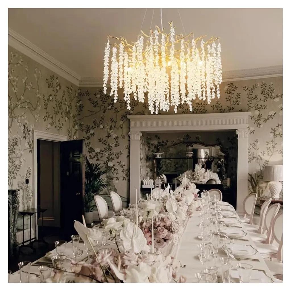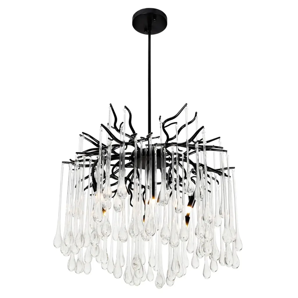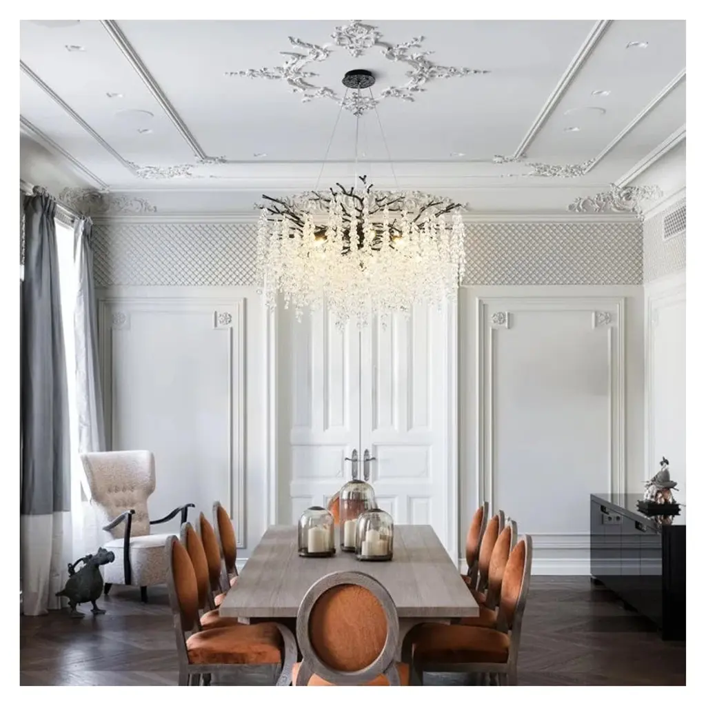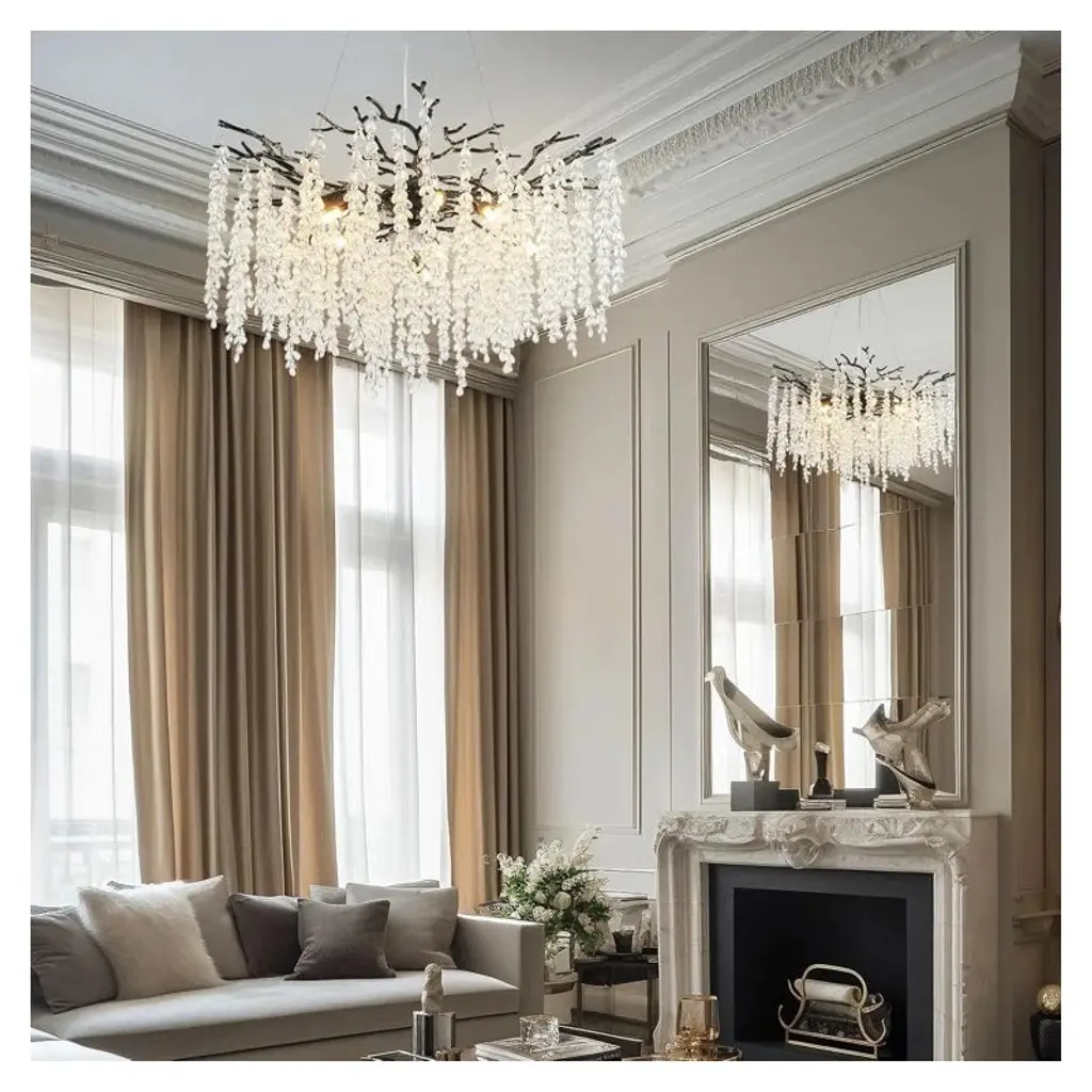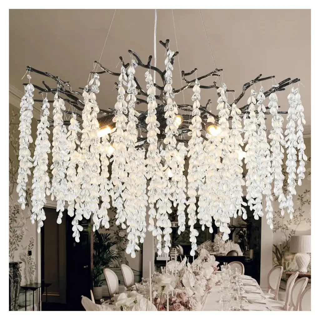 Enhance your decor with this finely polished crystal chandelier, featuring unique handmade patterns and a translucent pendant inspired by the natural forest. This modern, tree-branch design casts a warm glow, making it a dazzling centerpiece. Suitable for bedrooms, dining rooms, kitchens, and more, it includes 83 crystal bunches (2 extra) and an adjustable cable (0-59 inches) for versatile installation on flat or sloped ceilings. Requires 10 x 110v G9 bulbs (not included).