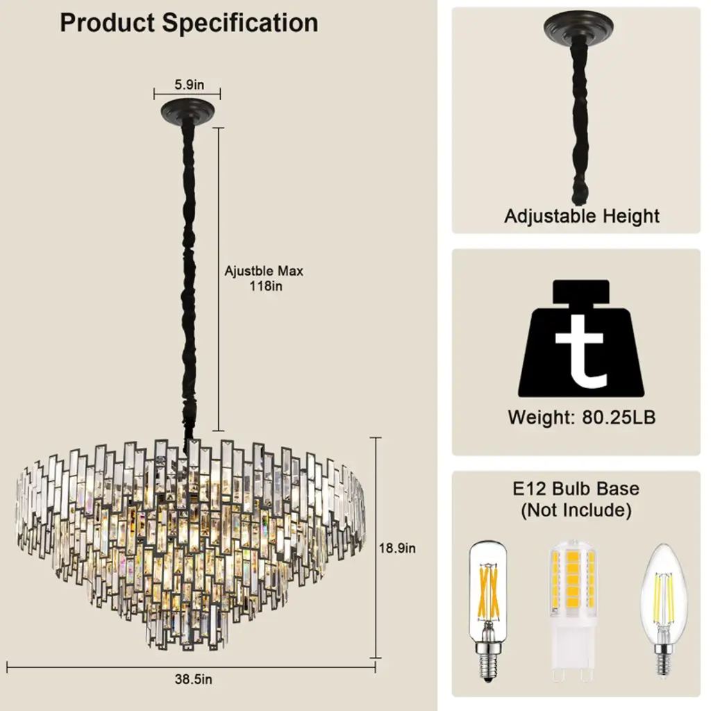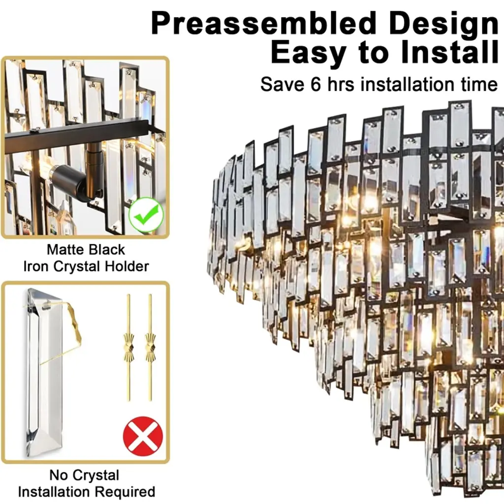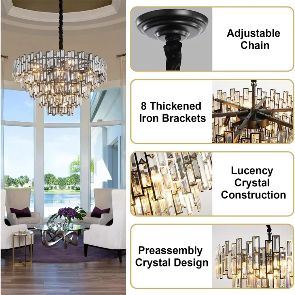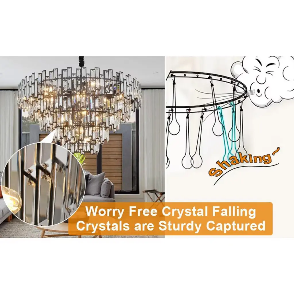 The luxury crystal chandelier is made of 8-thickaned iron brackets and upgraded crystal construction. The surface of the iron brackets are coated with anti-oxidation to prevent rust and corrision, and secure the crystals in place, achieving a perfect natural balance. Fairmly grasps the ceiling, the thickened metal ensures that it will not fall off during suspendion, ensuring safety and firmness. The modern K9 crystal chandelier clear multi-faced crystals reflect the beauty of brilliant gemstones, and the upgraded pendant light is more colorful and gorgeous than other same type chandeliers. It's perfect for living room, dinning room, bedroom, foyer, staircase, and etc.