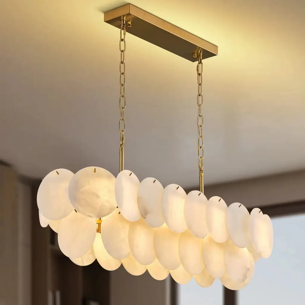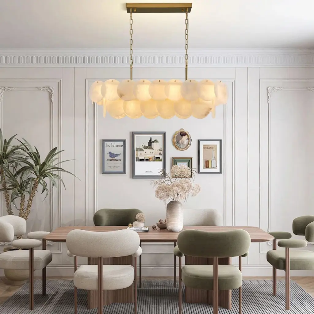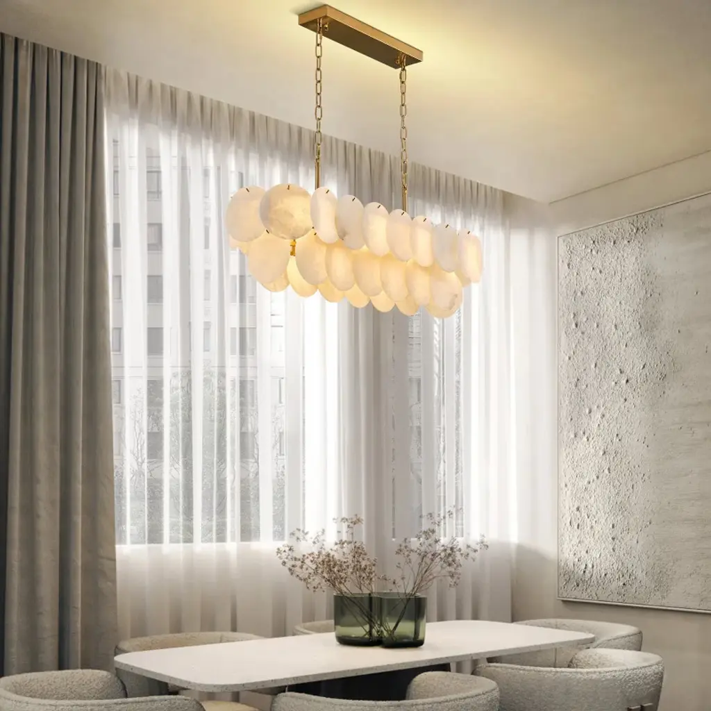 Crafted from 34 hand-selected alabaster marble pieces, each with its own organic veining, this rectangle chandelier exudes timeless sophistication. The warm, diffused glow enhances any home decor, creating a stunning focal point for dining rooms, living spaces, or bedrooms.
