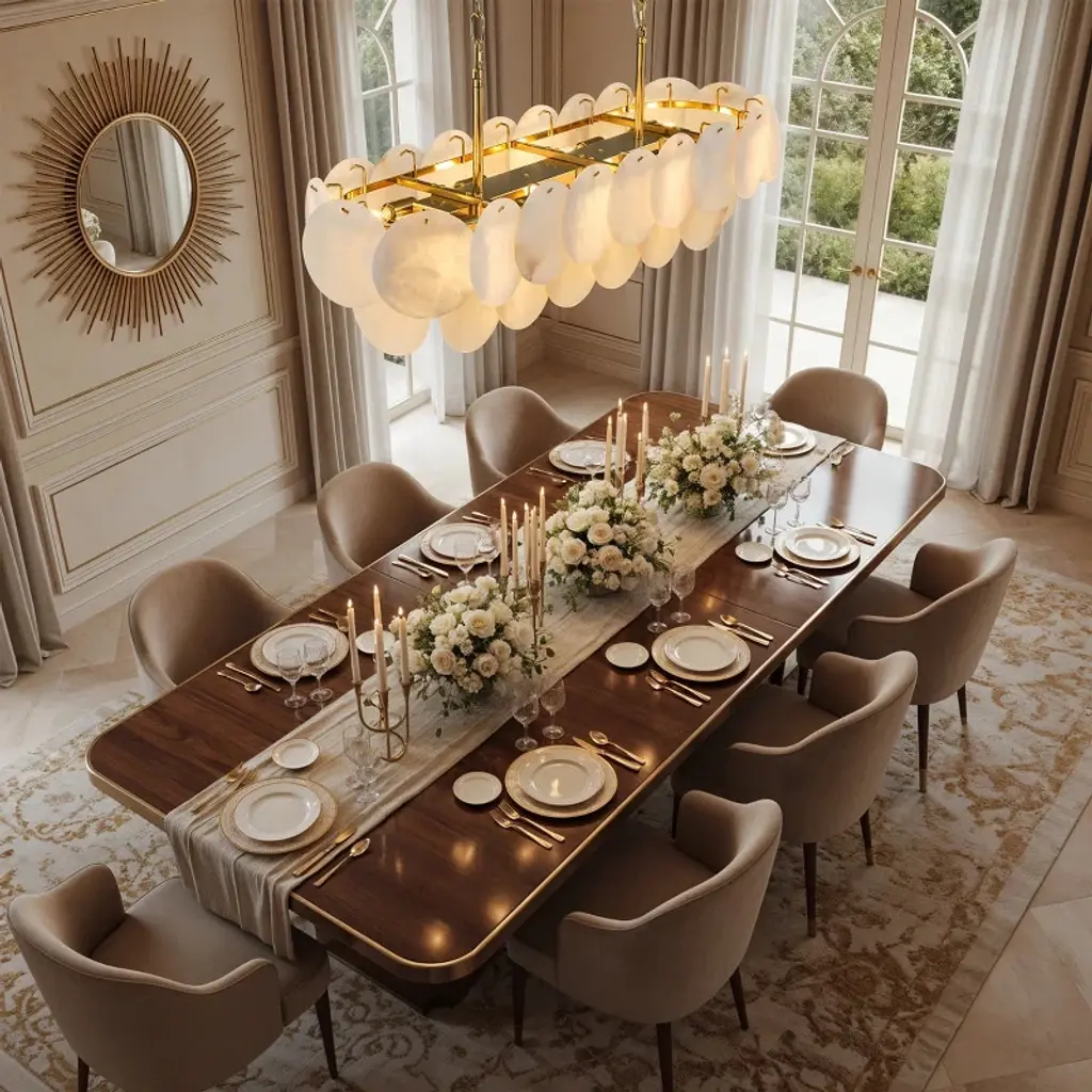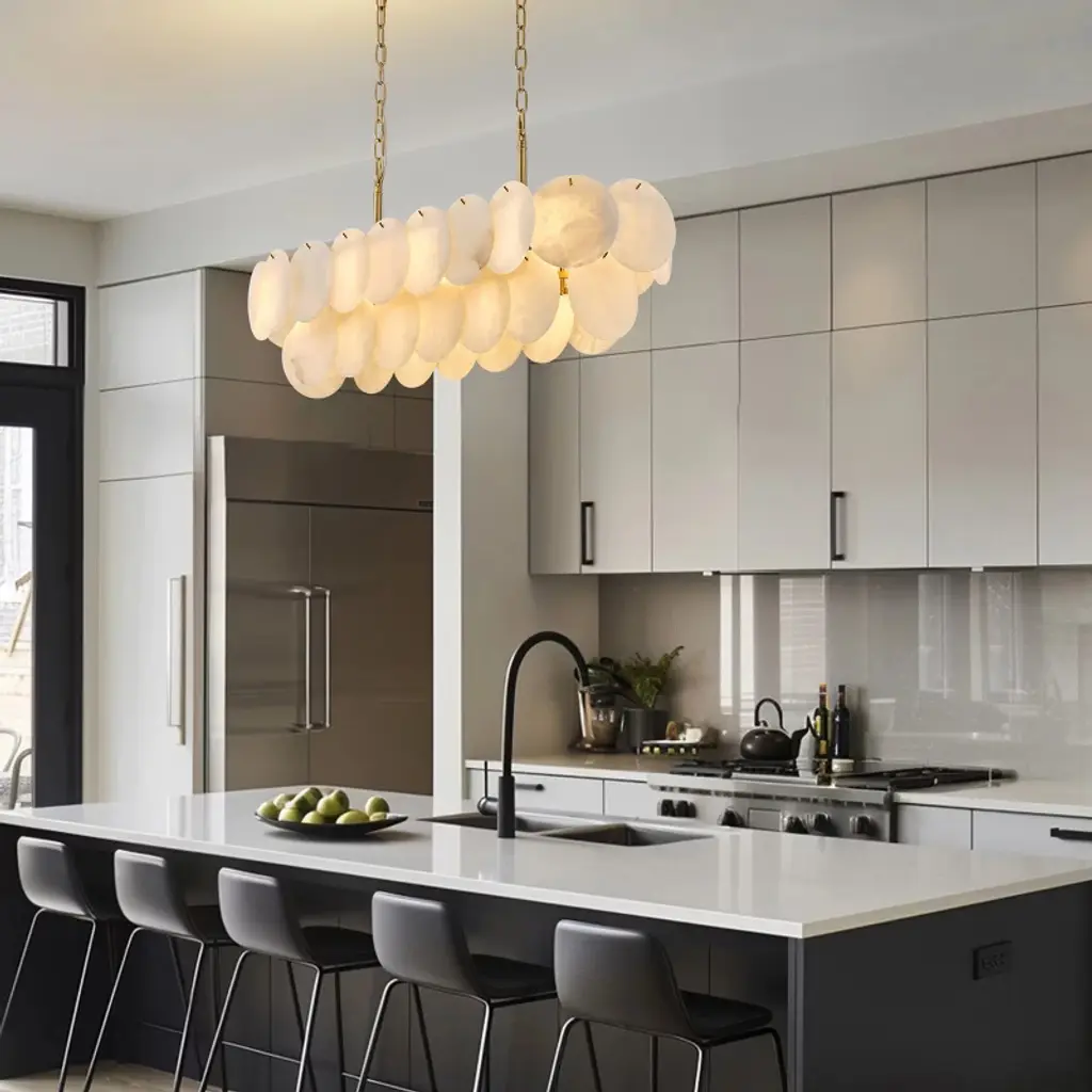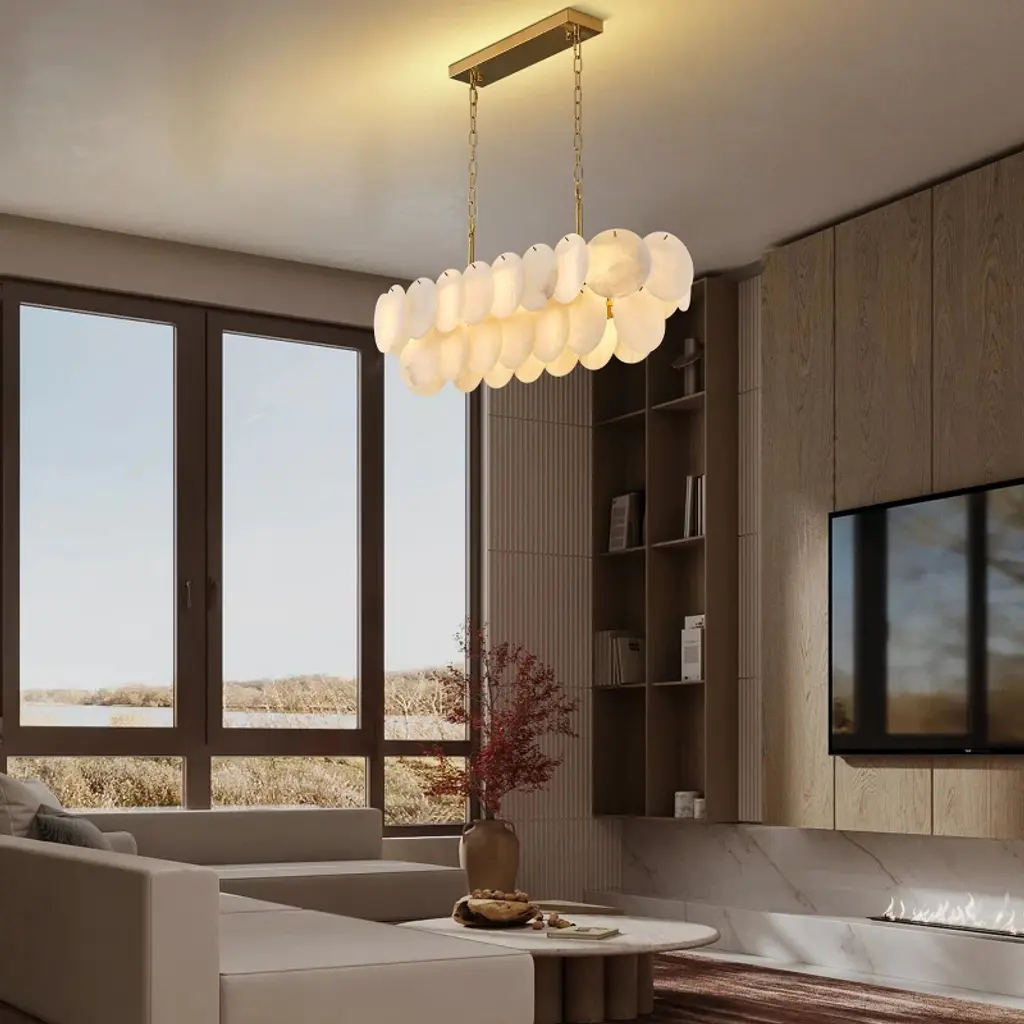 Crafted from 34 hand-selected alabaster marble pieces, each with its own organic veining, this rectangle chandelier exudes timeless sophistication. The warm, diffused glow enhances any home decor, creating a stunning focal point for dining rooms, living spaces, or bedrooms.
