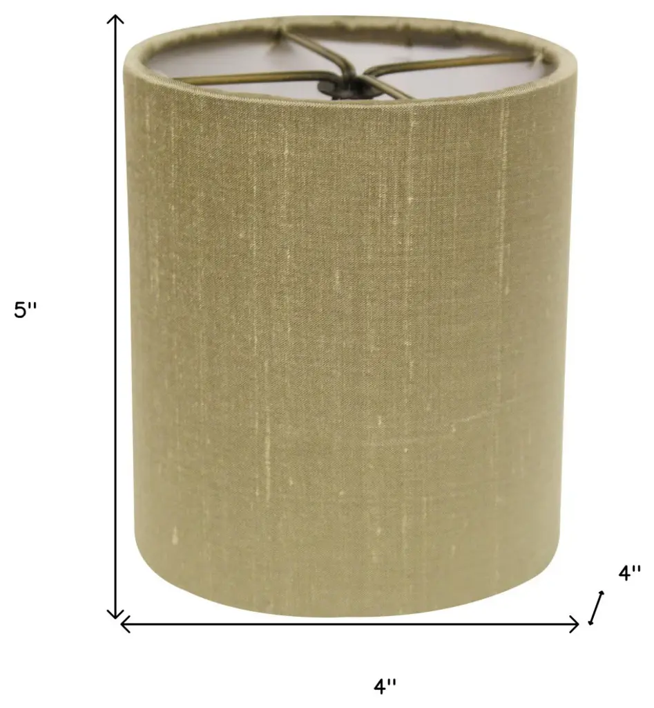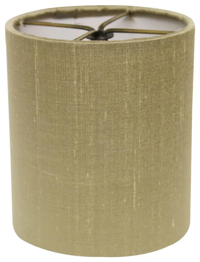 These 4" Antique Gold Set of 6 Drum Chandelier Lampshades have a hint of mid-century modern flair and will be a great addition to your lamp base. This drum chandelier lampshade includes a double flame clip that fits over a standard harp and can be used with your existing finial design. This high quality crafted drum shape has a slight slant to give it some visual interest and is crafted of the finest pongee silk with a fold on top and bottom of the shade. 5" x 4" x 4"This set of 6 chandelier shades features a sturdy brass finish metal Double Flame Clip that fits securely to your bulb.Set of High Quality Premium Lamp Shades.No finial is needed.Shade measures 4" top diameter x 4" bottom diameter x 4.5" heightHardback rolled edge chandelier shade on white styrene backing