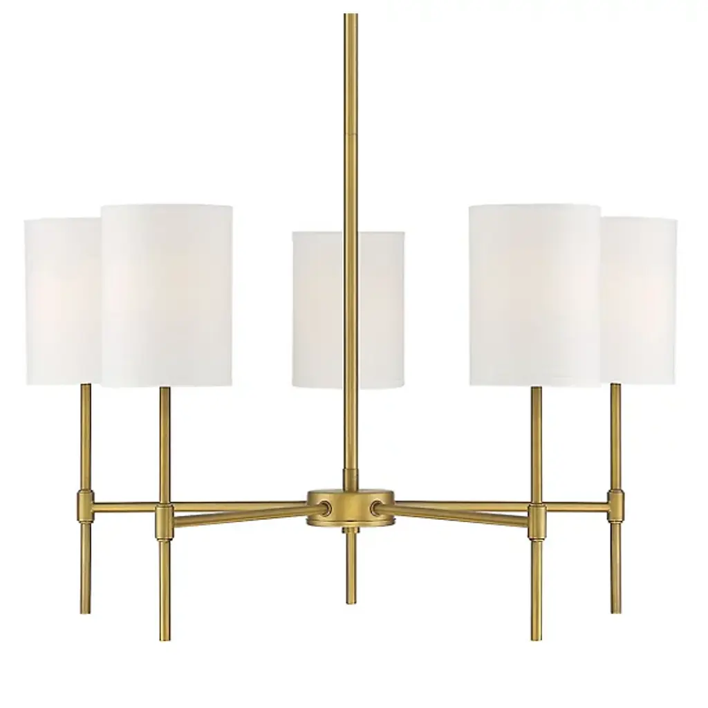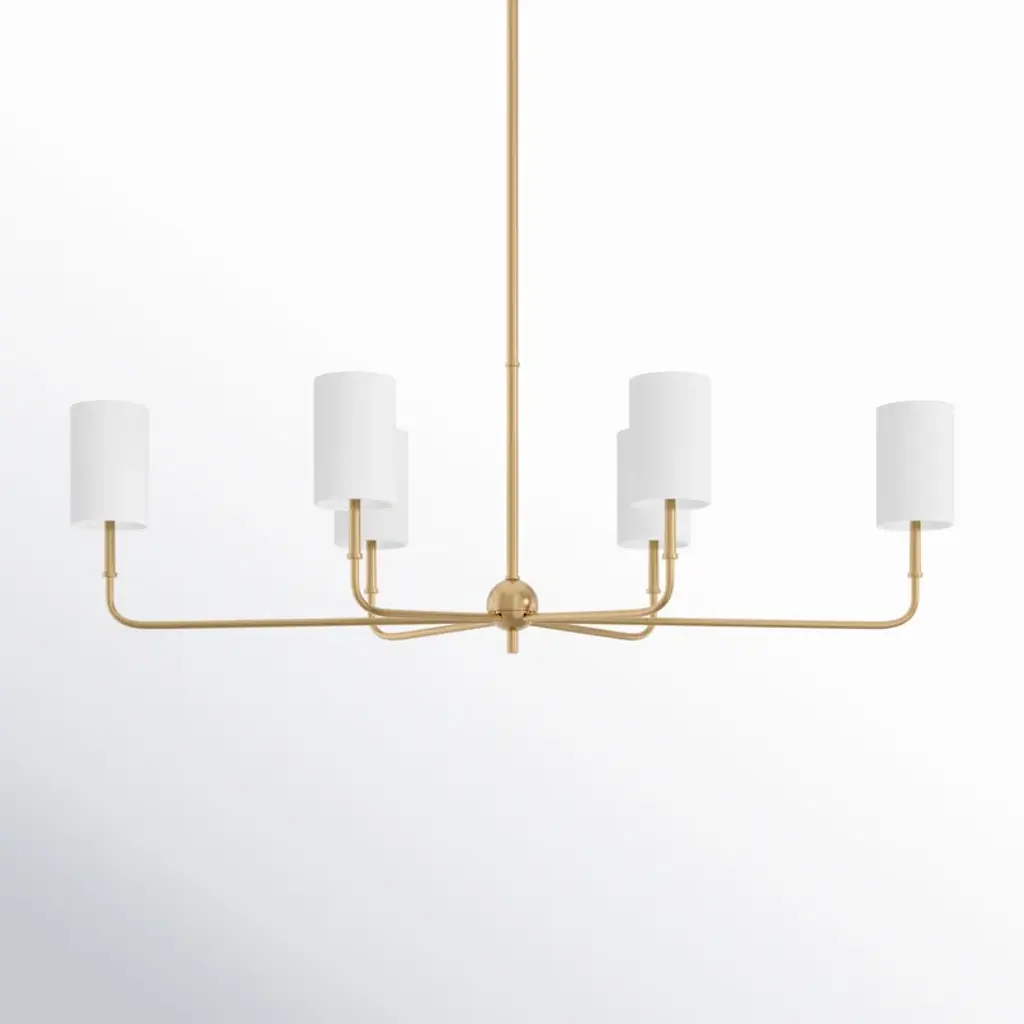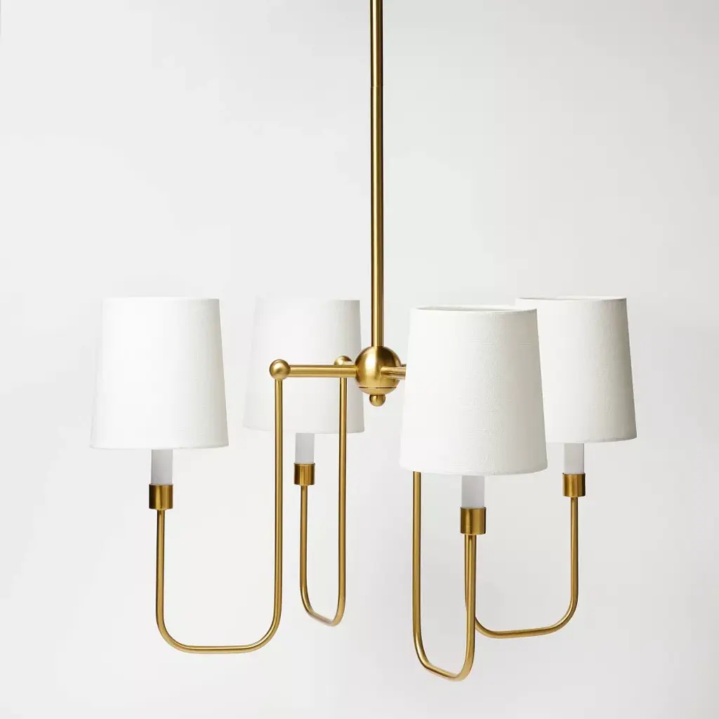 Bring a statement look to your indoor lighting with this 4-Arm Chandelier from Threshold™ designed with Studio McGee. Made from metal in a gold-tone finish, this four-arm chandelier features four crisp white shades for a modern look that easily complements your existing decor. This shaded chandelier offers an adjustable hanging height to fit your space, and lights up with a one-way light setting for easy operation. Whether you hang it in your living room, over your dining room table or suspend it above the kitchen island, this chandelier makes a stylish addition to your indoor space.