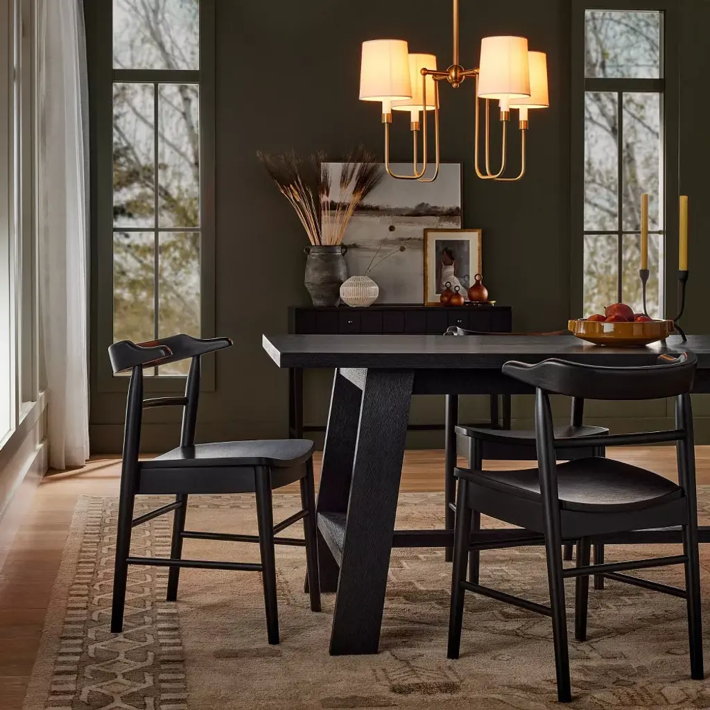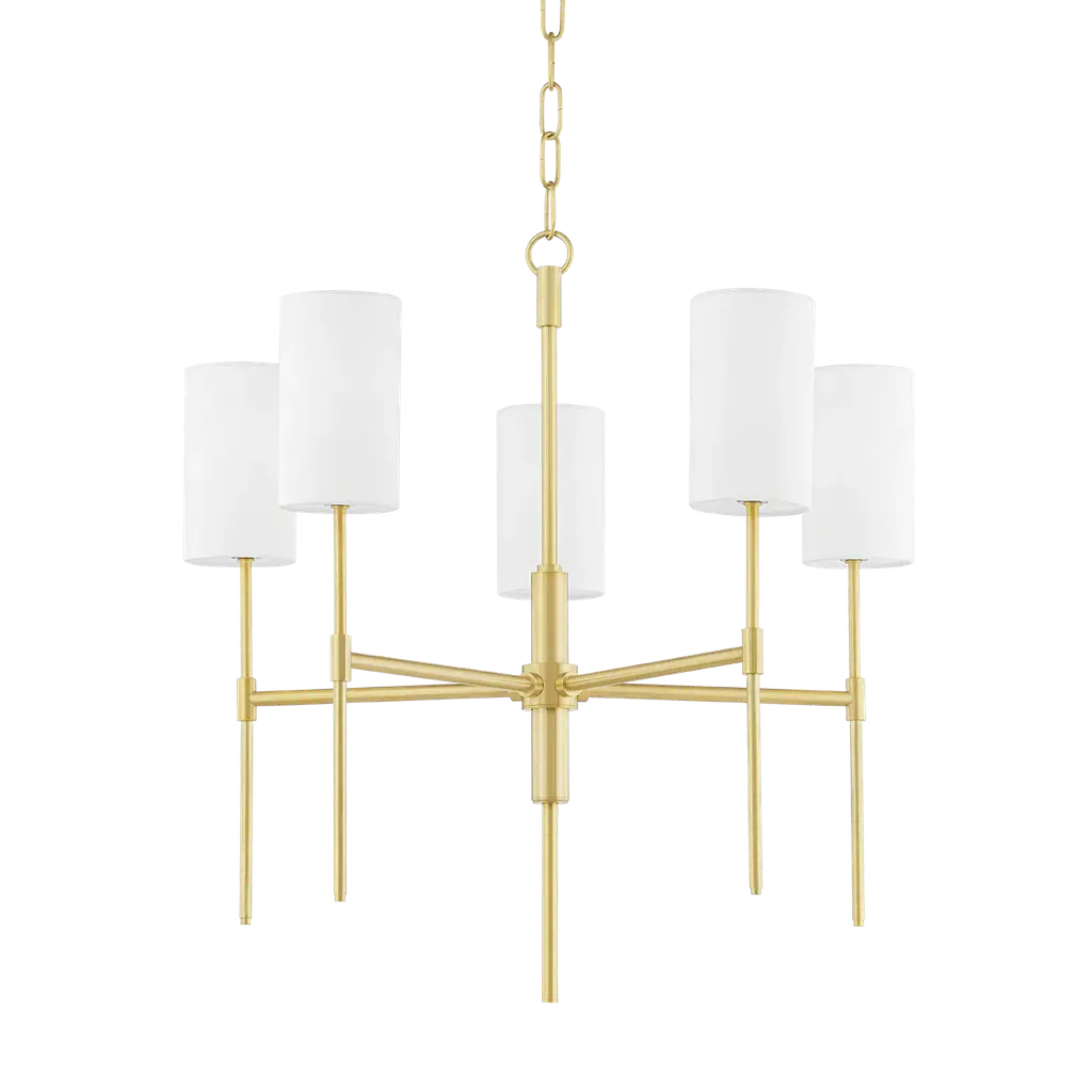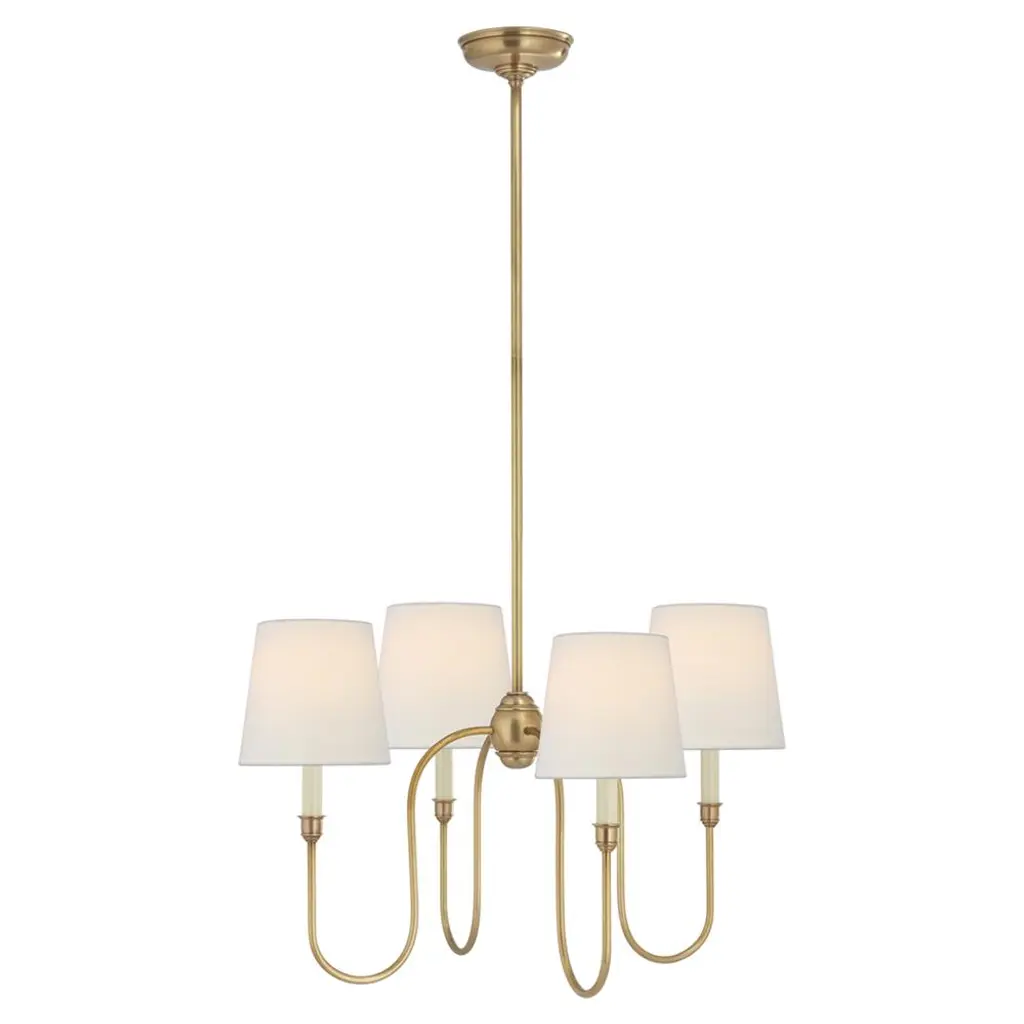 Bring a statement look to your indoor lighting with this 4-Arm Chandelier from Threshold™ designed with Studio McGee. Made from metal in a gold-tone finish, this four-arm chandelier features four crisp white shades for a modern look that easily complements your existing decor. This shaded chandelier offers an adjustable hanging height to fit your space, and lights up with a one-way light setting for easy operation. Whether you hang it in your living room, over your dining room table or suspend it above the kitchen island, this chandelier makes a stylish addition to your indoor space.