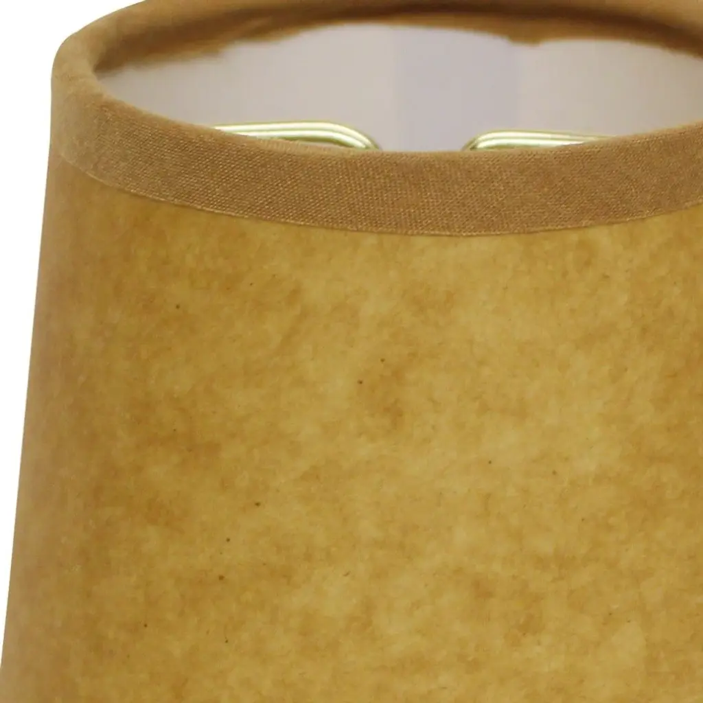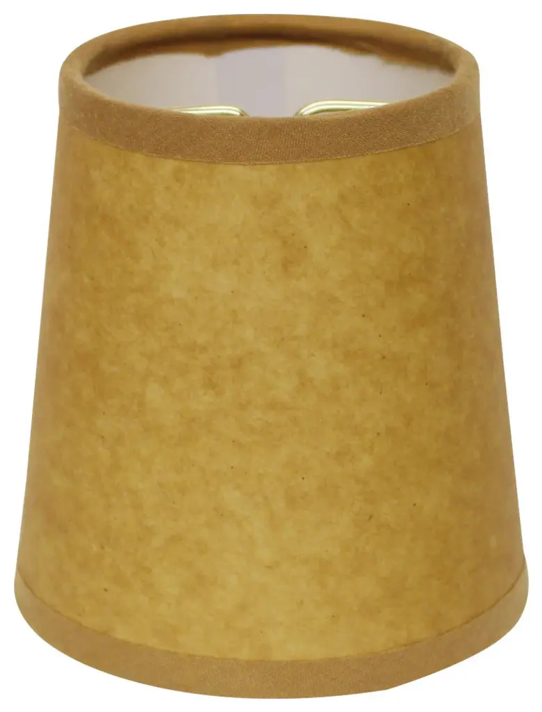 This Canvas Set of 6 Chandelier Kraft Paper Lampshades has a hint of farmhouse flair and will be a great addition to your lamp base. This hardback Lampshades includes a standard flame clip that fits over a standard harp and can be used with your existing finial design. This high quality crafted drum shape has a slight slant to give it some visual interest and is crafted of the finest kraft paper with a fold on top and bottom of the shade. 4" x 4" x 4"Set of High Quality, Sturdy Kraft Paper and Fabric Lamp Shades.This set of 6 chandelier shades features a sturdy brass finish metal Flame Clip that fits securely to your bulb.No finial is needed.Shade measures 3" top diameter x 4" bottom diameter x 4" slant height.Hardback chandelier shade with cloth tape edges on white styrene backing.Made from high-quality, premium Kraft Paper.