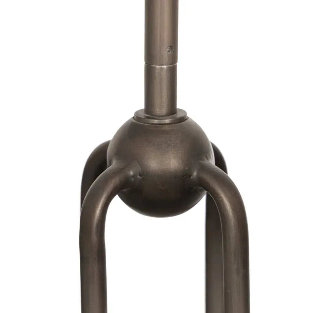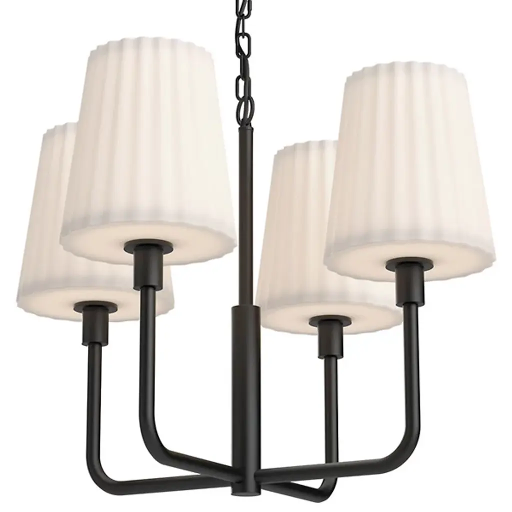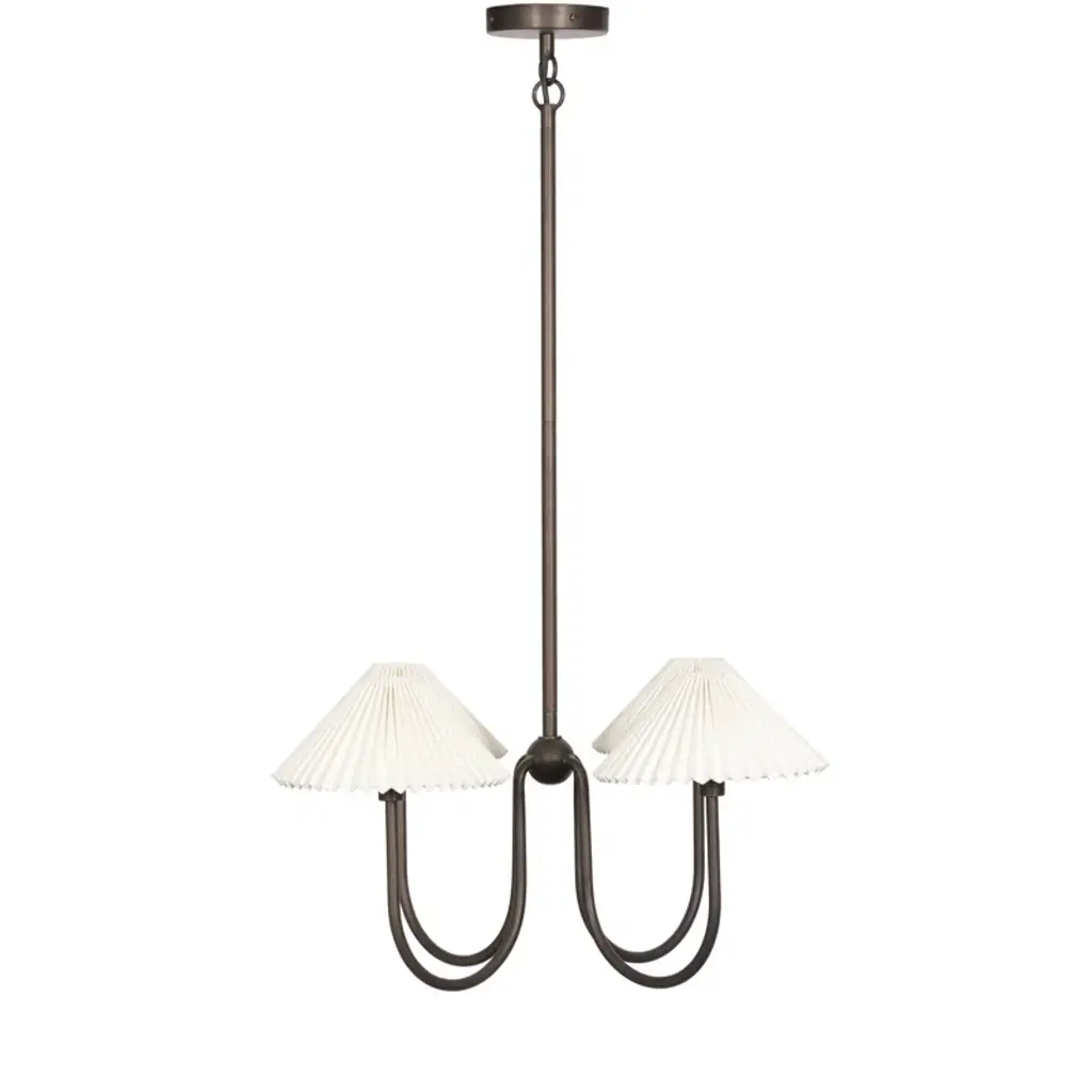 French inspiration courses this four-arm chandelier, as curved bronzed arms connect at a central ball detail. Cream, accordion-pleated linen shades allow for a softened, more ambient light, while a double hook lets you hang in a wide range of spaces, including slanted ceilings. T6 bulbs recommended.