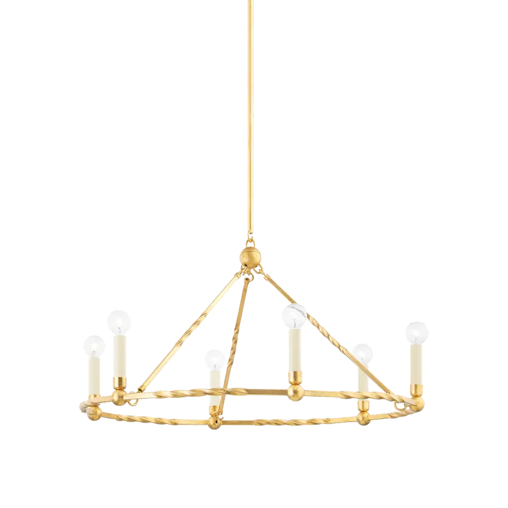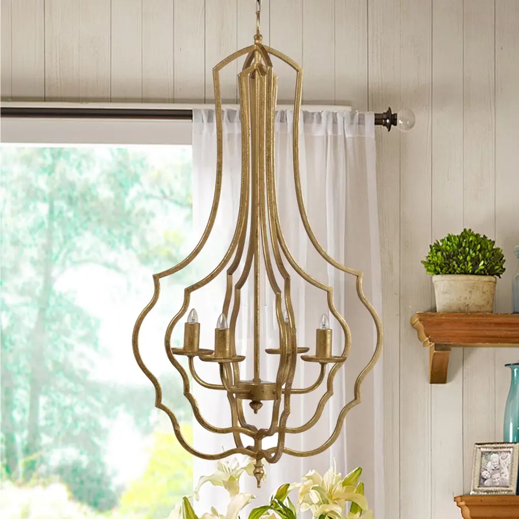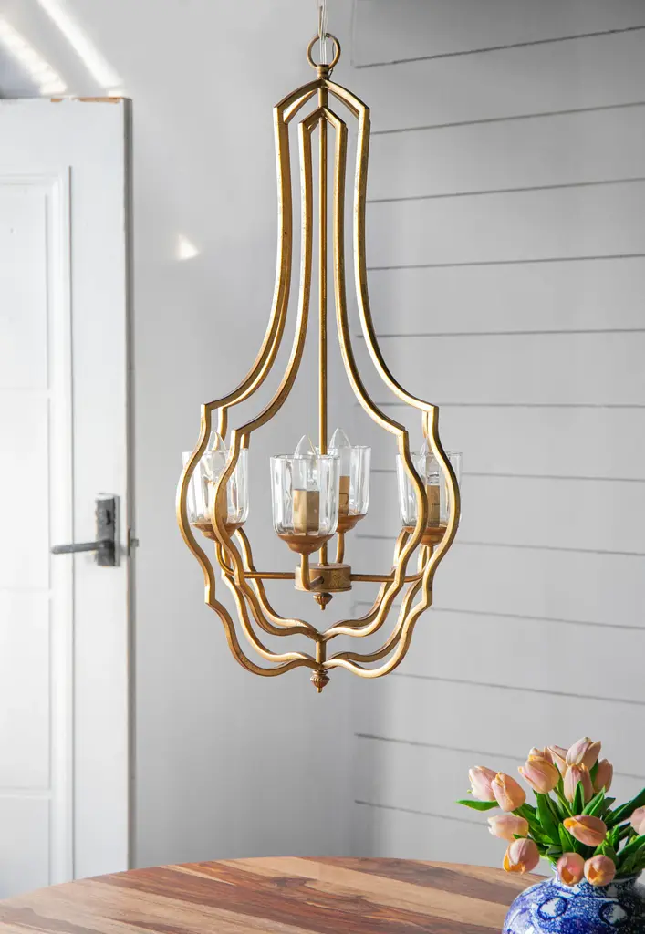 Brighten your interior with the exceptionally graceful Valerio Nested Chandelier. The sculptural metal frame with glass light covers makes a dramatic statement with its curves, angles, and antique gold finish. Outfit with four candelabra-style bulbs and hang anywhere that could use an elegant focal point. Features an open frame design Exudes luxe and elegance. Number of Light Sources: 4 Voltage: 110V Wattage: 60W Power Source: Hardwire Bulb Base: E12 Product Details 90% Iron,10% Glass Measurement:19.5x19.5x35(Inches) Weight:20.3lbs.