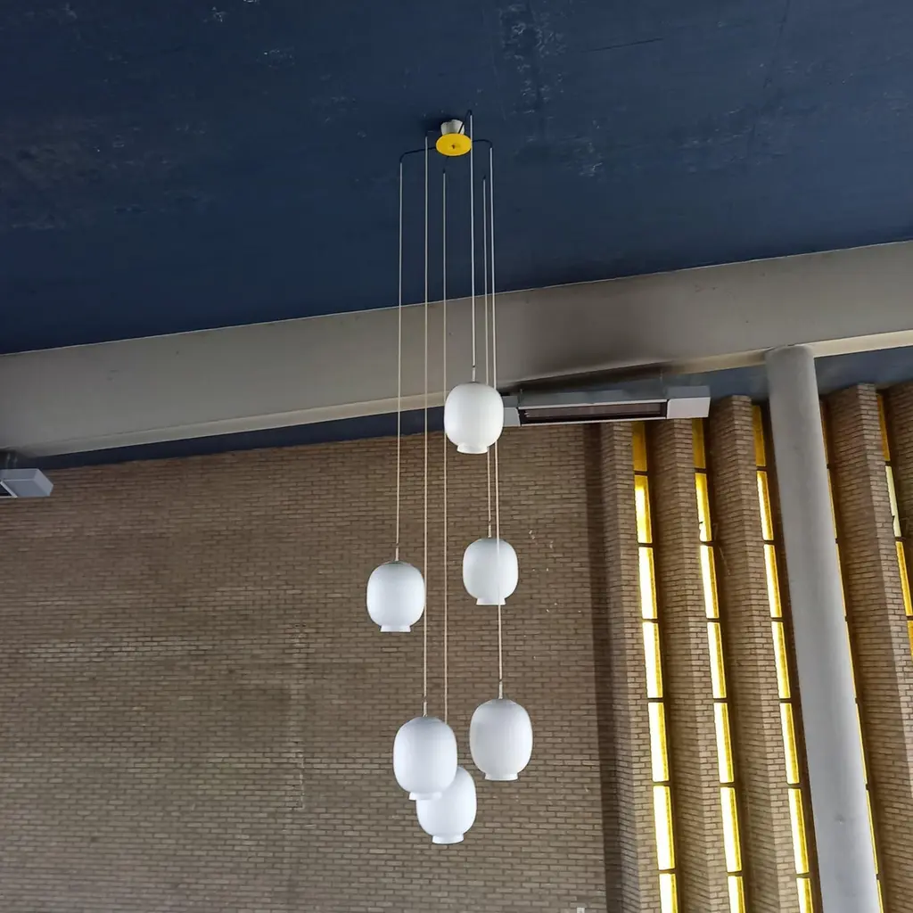 These chandeliers are salvaged from a church in the Netherlands. The church was build in 1961 according to the modernist style of design, typical for that era. The chandeliers are by Philips and are in a wonderfull vintage condition. The lights have only recently been dismantled and have hung in the church for the past 60 years.Each chandelier consists out of a 6-arm ceiling fixture in yellow and black. Each arm holds a satin glass shade.We have 4 lights with 6 shades each available. All is rewired for EU and US use. Cable length we can adjust to your preference.Documented in the Philips catalogue of 1962.