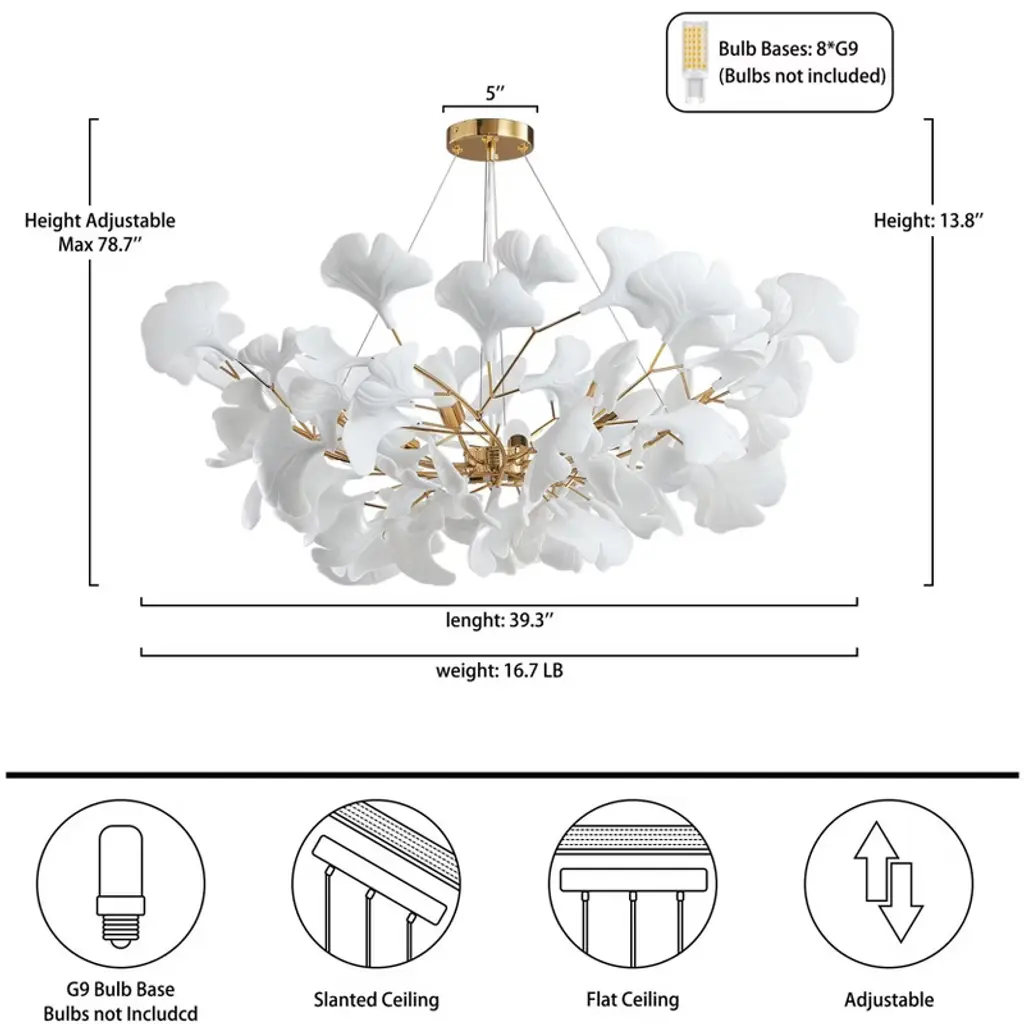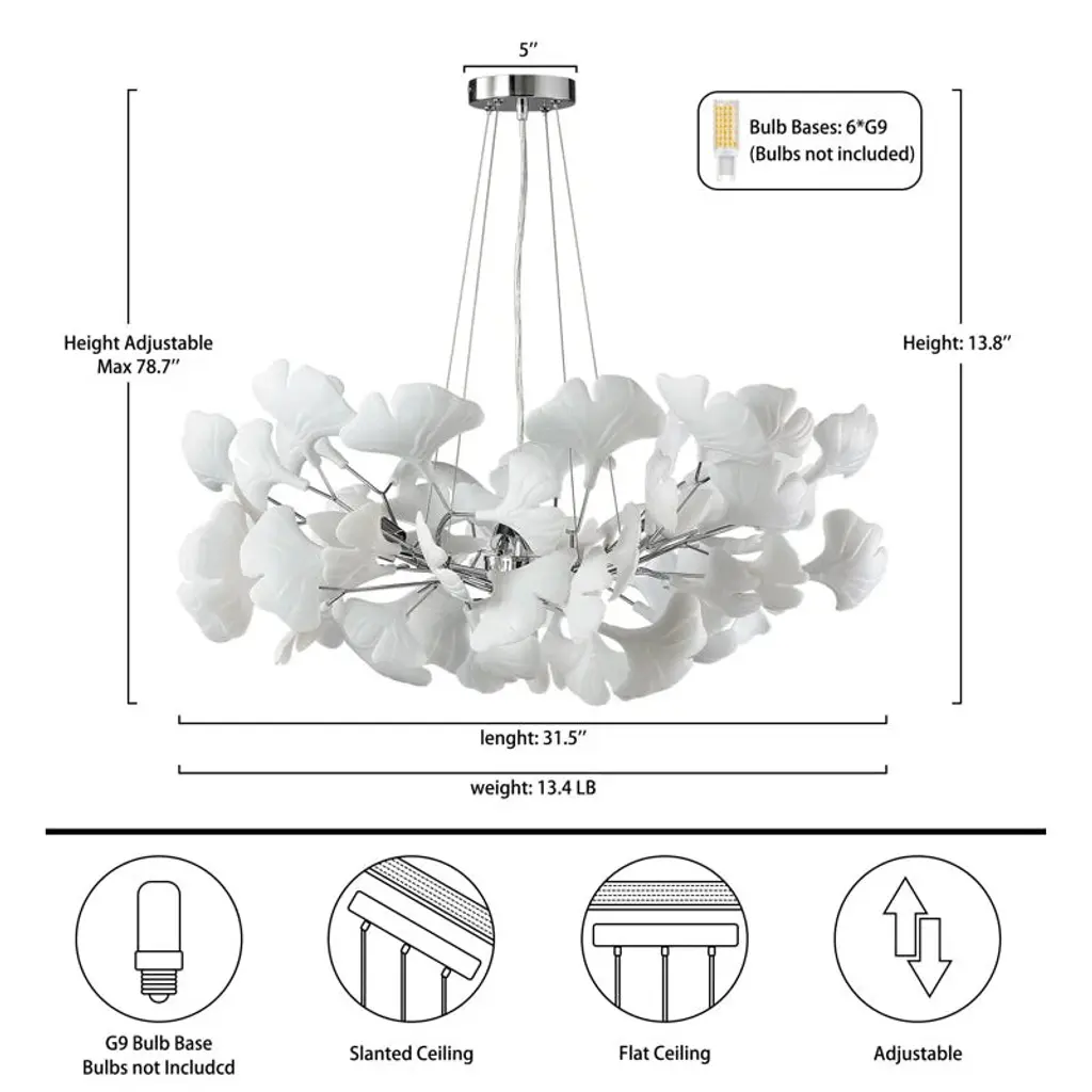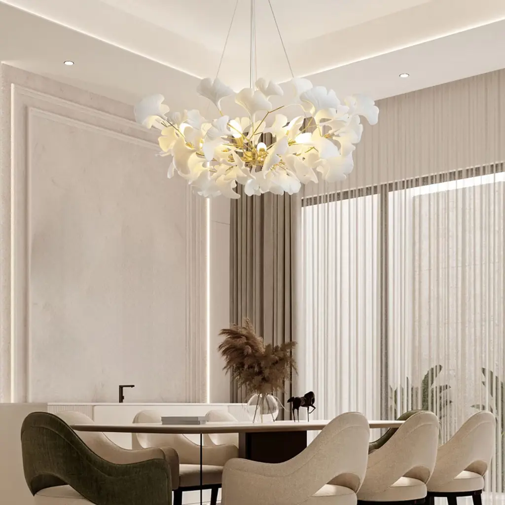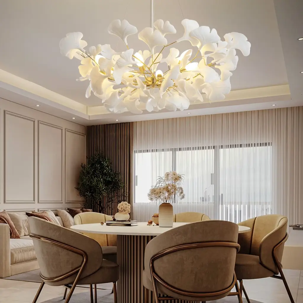 Introducing the exquisite Ginkgo Leaf Dining Room Chandelier, a perfect blend of iron and ceramic, meticulously adorned with a sophisticated electroplated finish. A testament to opulence and sophistication, this chandelier elevates your dining environment to unparalleled heights. With its thoughtful design, it bathes your space in a warm 3000K glow, perfectly creating an ambience conducive to an exceptional dining experience.