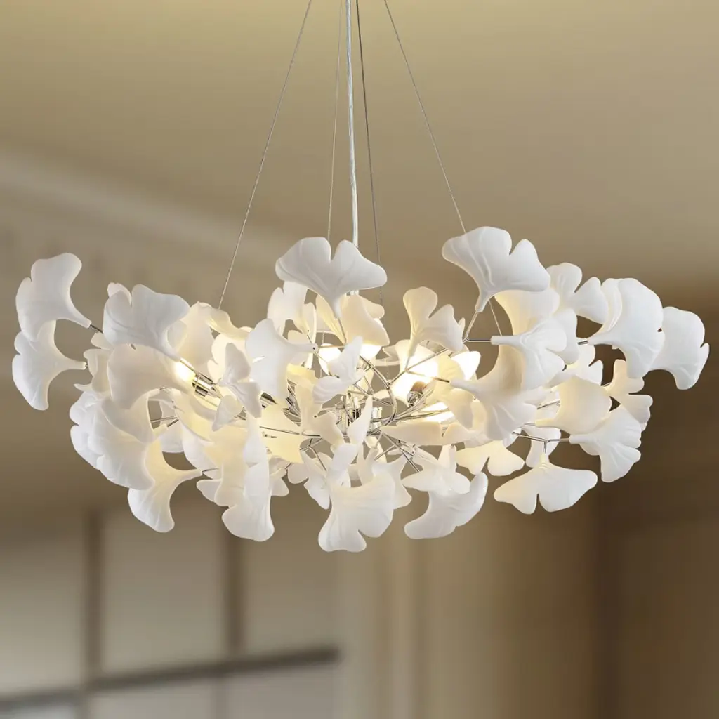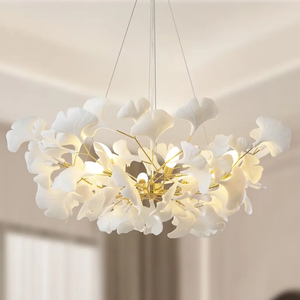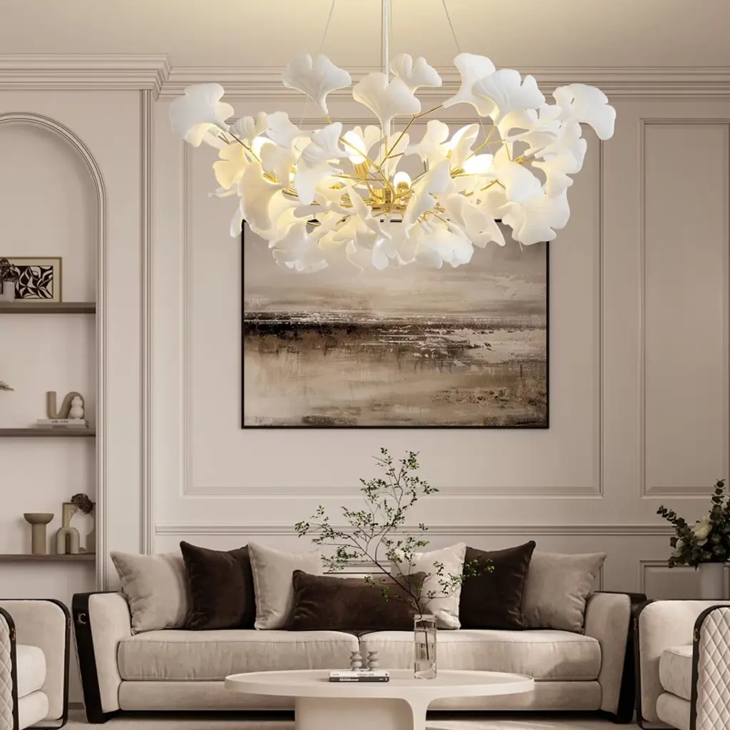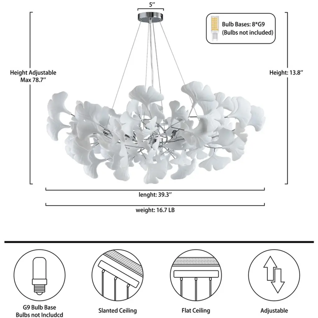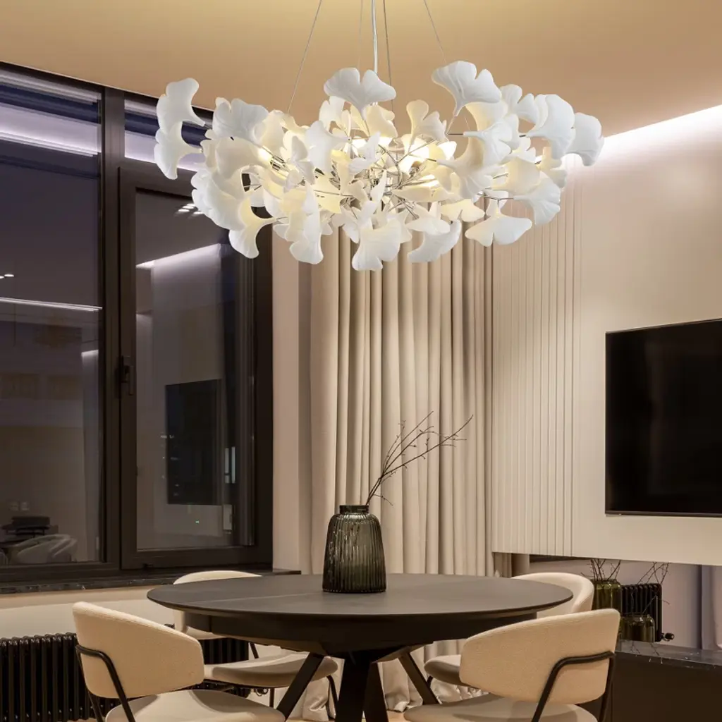 Introducing the exquisite Ginkgo Leaf Dining Room Chandelier, a perfect blend of iron and ceramic, meticulously adorned with a sophisticated electroplated finish. A testament to opulence and sophistication, this chandelier elevates your dining environment to unparalleled heights. With its thoughtful design, it bathes your space in a warm 3000K glow, perfectly creating an ambience conducive to an exceptional dining experience.