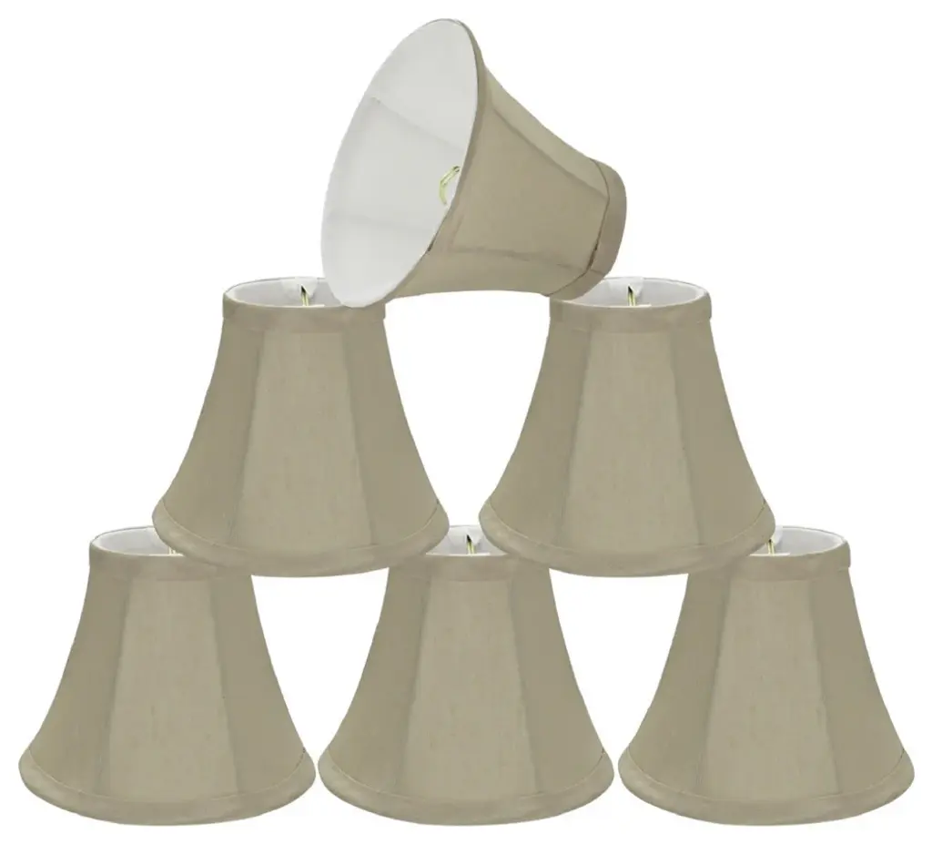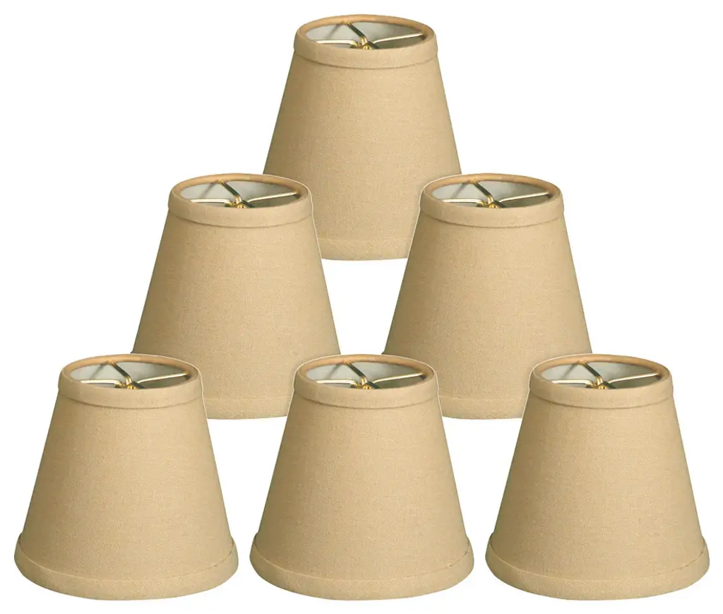 This shade is a part of Royal Designs, Inc. Timeless Chandelier Shade Collection and is perfect for anyone who is looking for a simple yet stunning lampshade.Exterior Fabric: Hand Tailored Silk-Type Shantung Interior Lining: Off-White Polystyrene lining Clip: Features CLIP-ON fitter designed to fit over a candelabra bulb base (most shades available with double clip-on)Trim: Top and bottom trim (single or double)Frame: Brass frame that is also rust resistantBulb: Suggested maximum wattage is 60-watt candelabra bulb (we suggest using dimmer switch)Height is measured by vertical height from top to bottom, not slant of the shade.Royal Designs has been in the lampshade business since 1993 with their multiple shade lines that exemplify handcrafted quality and value.