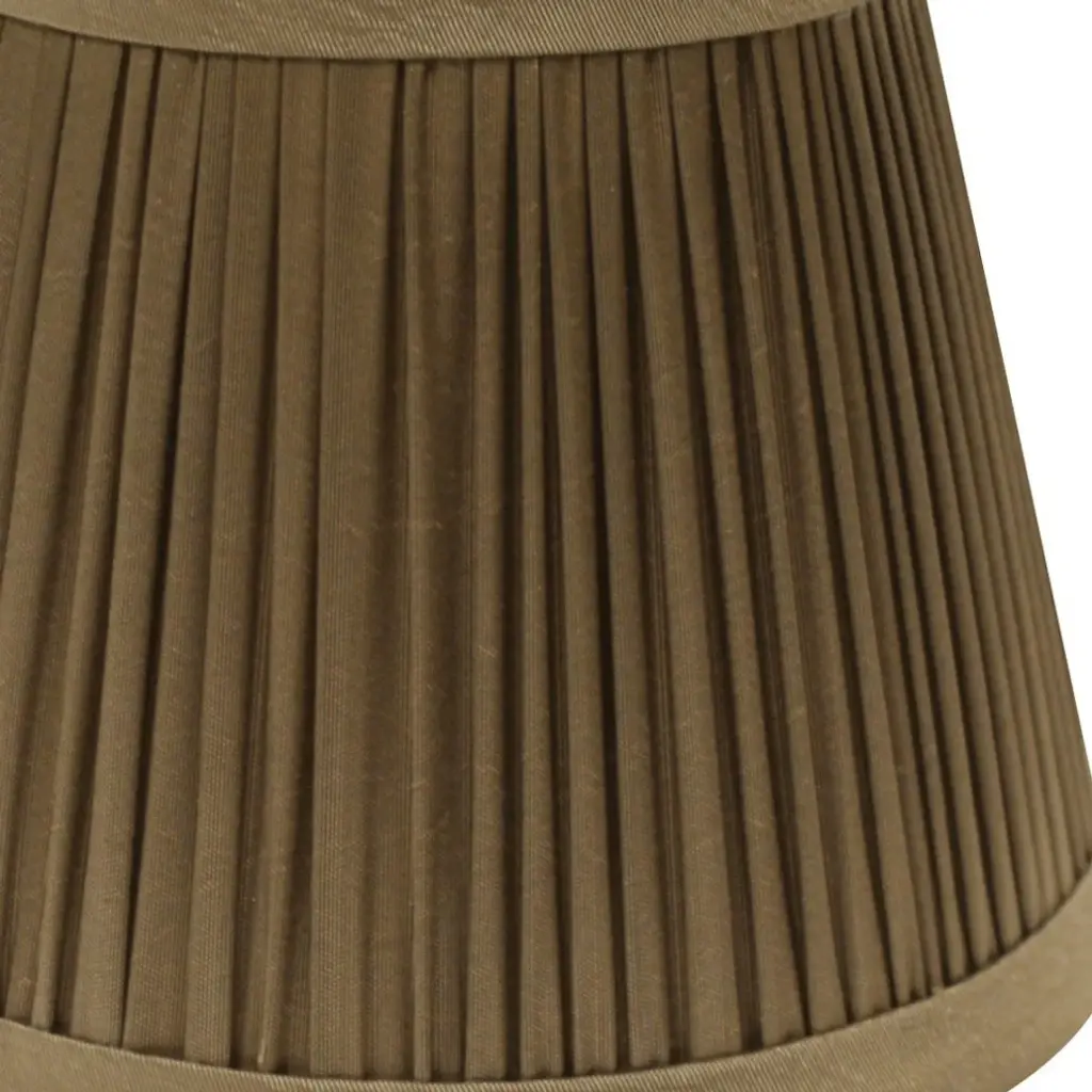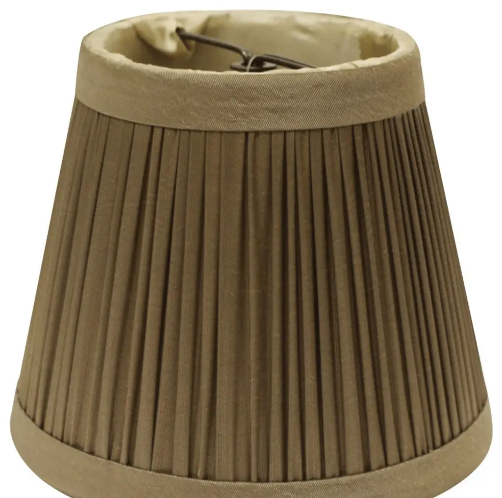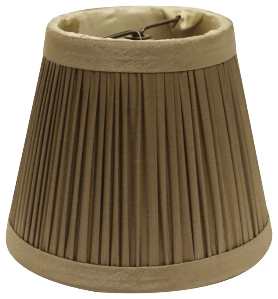 These 5" Ash Set of 6 Slanted Chandelier Tafetta Lampshades have a hint of traditional flair and will be a great addition to your lamp base. This pencil pleat chandelier lampshade includes a flame clip that fits over a standard harp and can be used with your existing finial design. This high quality crafted oval shape has a slight slant to give it some visual interest and is crafted of the finest tafetta with a fold on top and bottom of the shade. 4" x 5" x 5"Set of High Quality Premium Lamp Shades.This set of 6 chandelier shades features a sturdy brass finish metal Flame Clip that fits securely to your bulb.No finial is needed.Shade measures 3.25" top diameter x 5" bottom diameter x 4" slant heightSoftback pencil pleat chandelier shade with white liner is built to last.Made from premium quality Taffeta Silk.